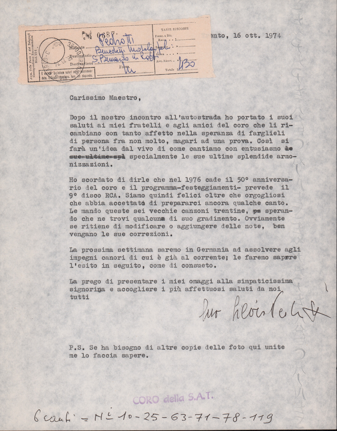 D.3.1.14 - Silvio Pedrotti ad Arturo Benedetti Michelangeli. Trento, 1974 ottobre 16. 1 c. dattiloscritta.