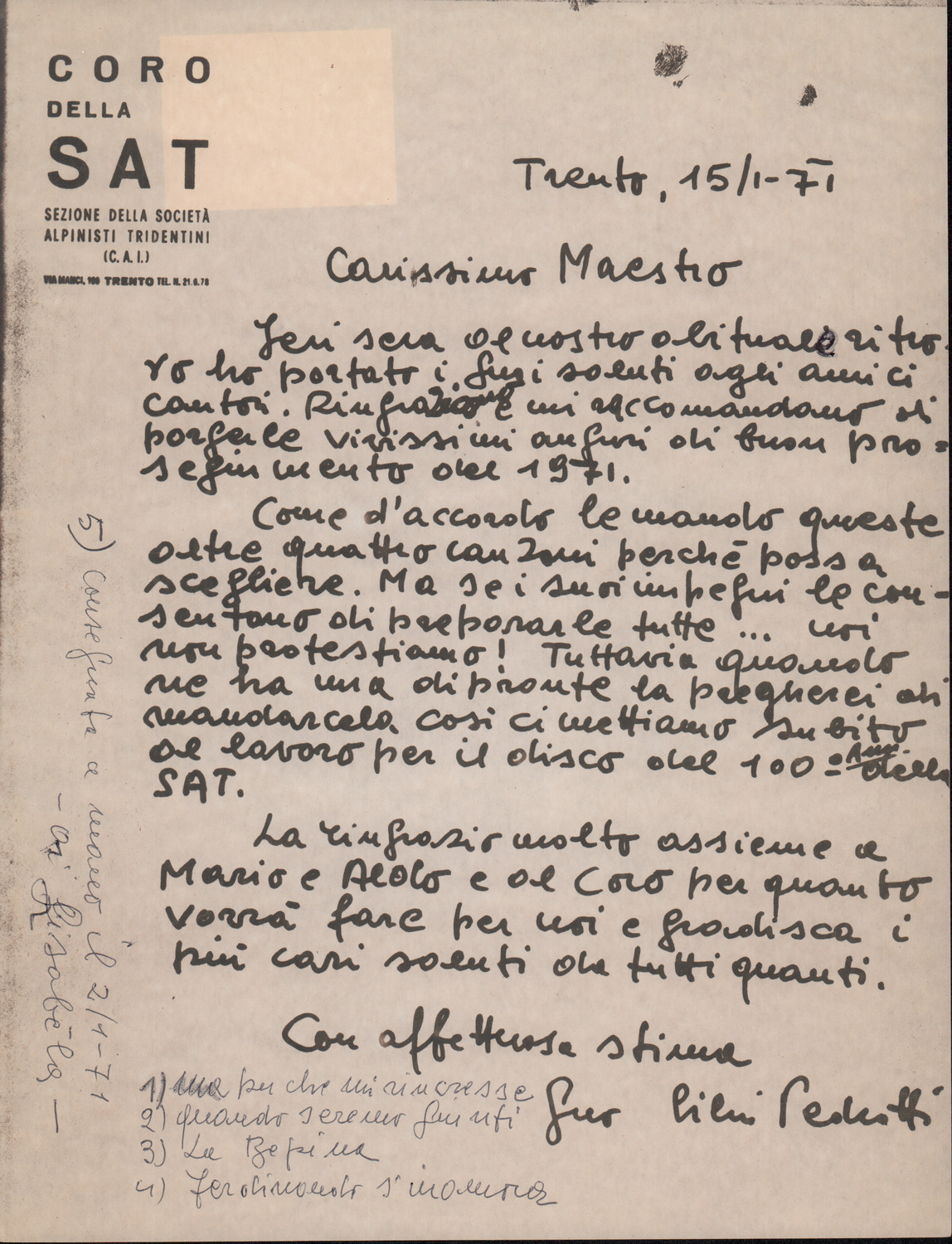 D.3.1.4 - Silvio Pedrotti ad Arturo Benedetti Michelangeli. Trento, 1971 gennaio 15. 1 c. fotocopiata.