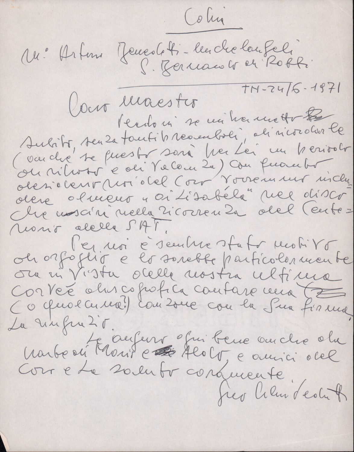 D.3.1.5 - Silvio Pedrotti ad Arturo Benedetti Michelangeli. Trento, 1971 giugno 24. 1 c.
