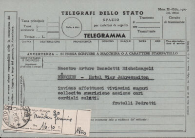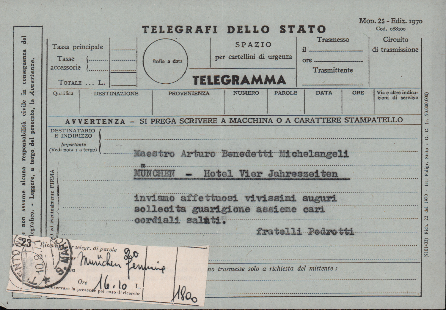 D.3.1.7 - I fratelli Pedrotti ad Arturo Benedetti Michelangeli. Trento, 1971 agosto 10. 1 telegramma.