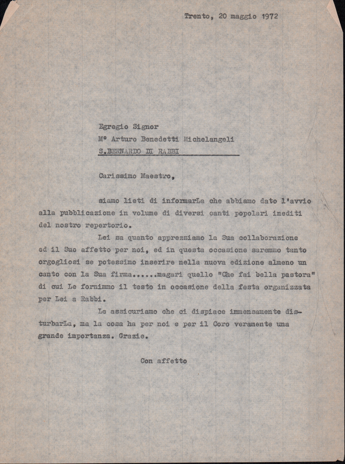 D.3.1.9 - I fratelli Pedrotti ad Arturo Benedetti Michelangeli. Trento, 1972 maggio 20. 1 c. dattiloscritta.