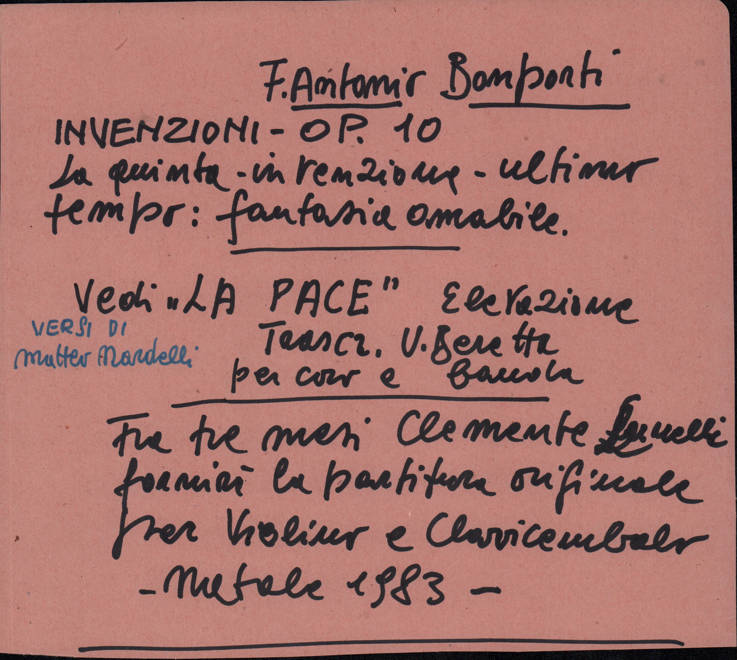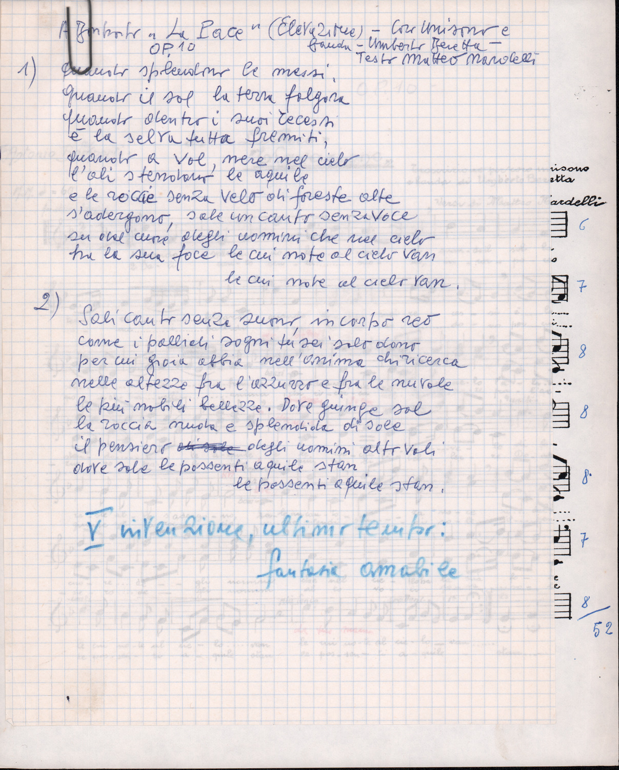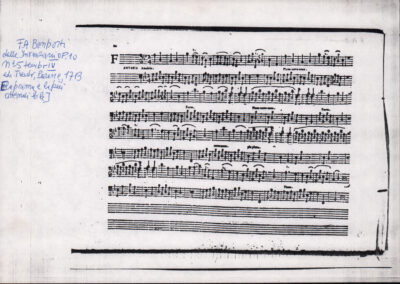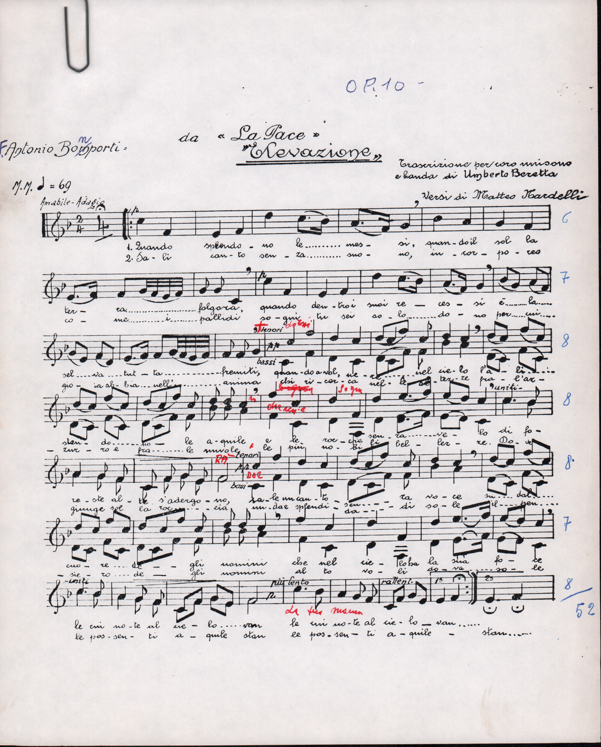 D.4.2.13 - Partiture dell’aria Fantasia amabile di Francesco Antonio Bonporti dall’Op. 10 “La pace”, Inventione V, ultimo tempo (IV), testo di Matteo Nardelli, Elevazione, per l’adattamento al brano e trascrizione per coro e banda di Umberto Beretta. 5 cc.