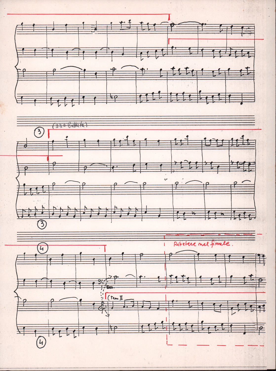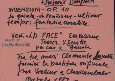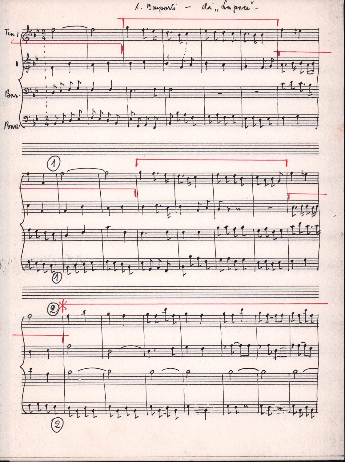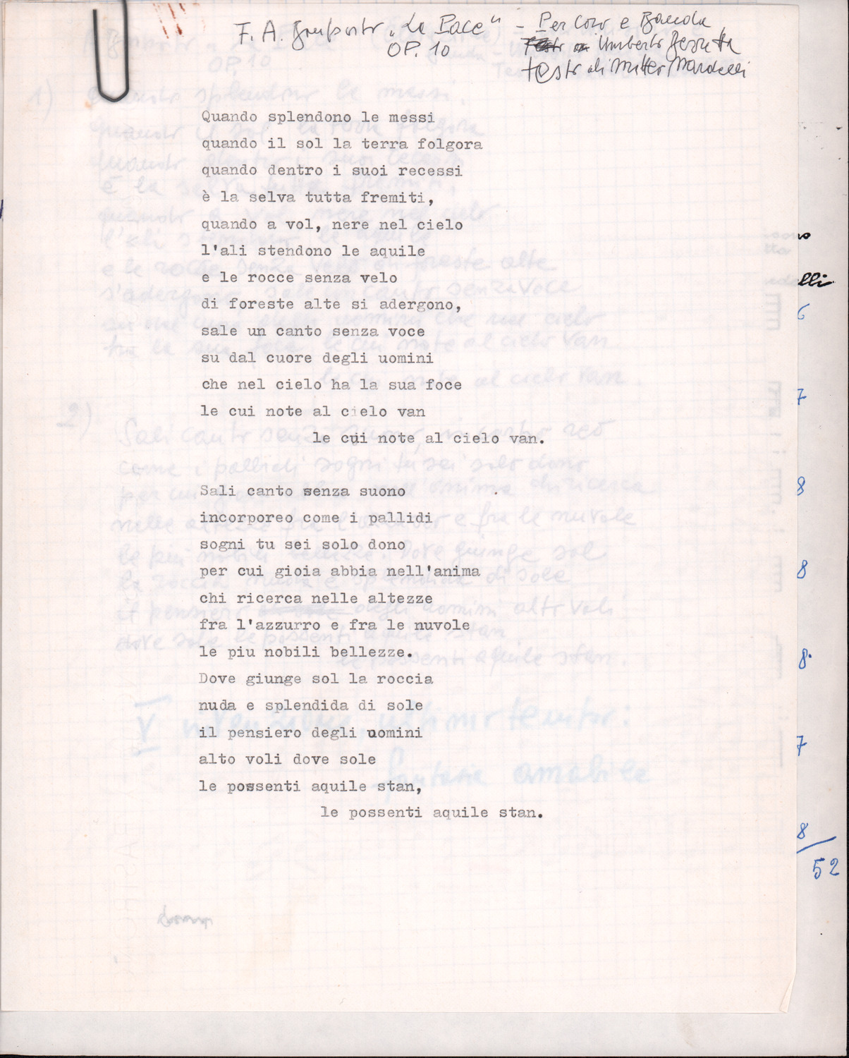D.4.2.13 - Partiture dell’aria Fantasia amabile di Francesco Antonio Bonporti dall’Op. 10 “La pace”, Inventione V, ultimo tempo (IV), testo di Matteo Nardelli, Elevazione, per l’adattamento al brano e trascrizione per coro e banda di Umberto Beretta. 5 cc.