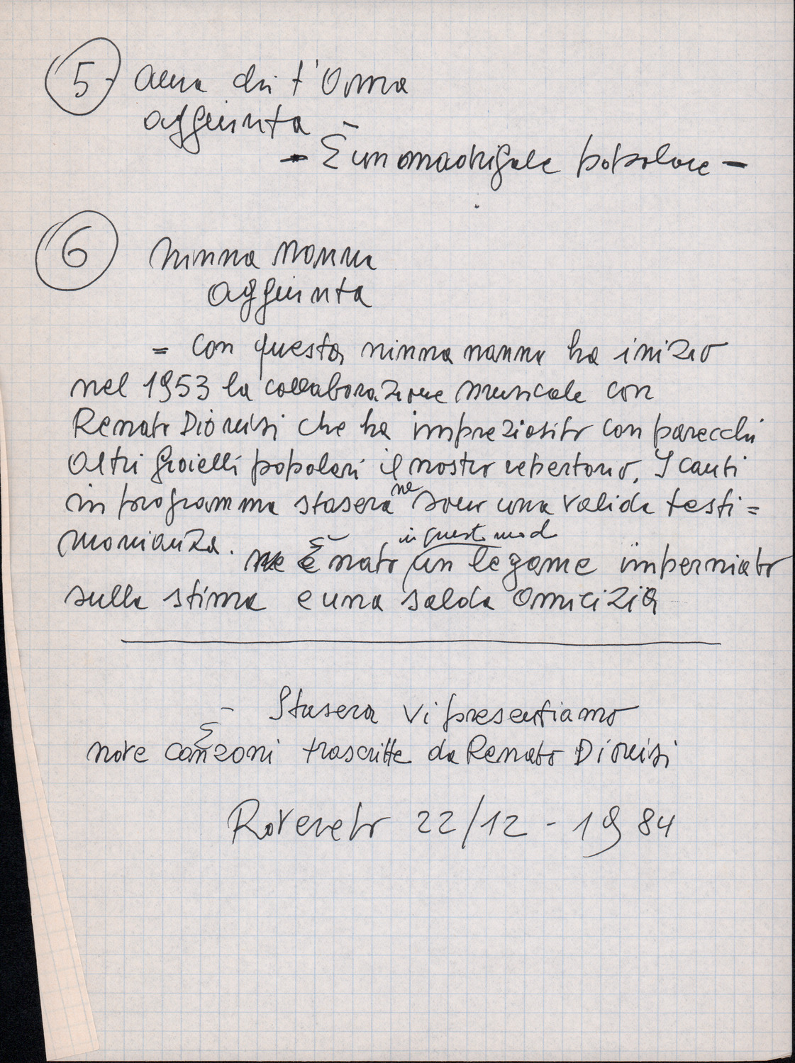 D.4.2.11 - Nota di Silvio Pedrotti relativa alla serata in omaggio a Renato Dionisi. Rovereto, 22 dicembre 1984. 1 c.
