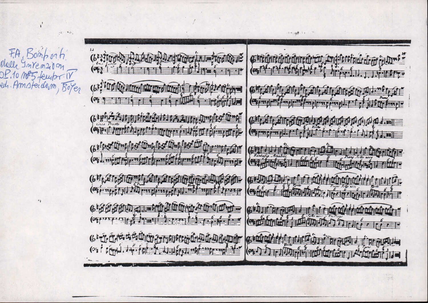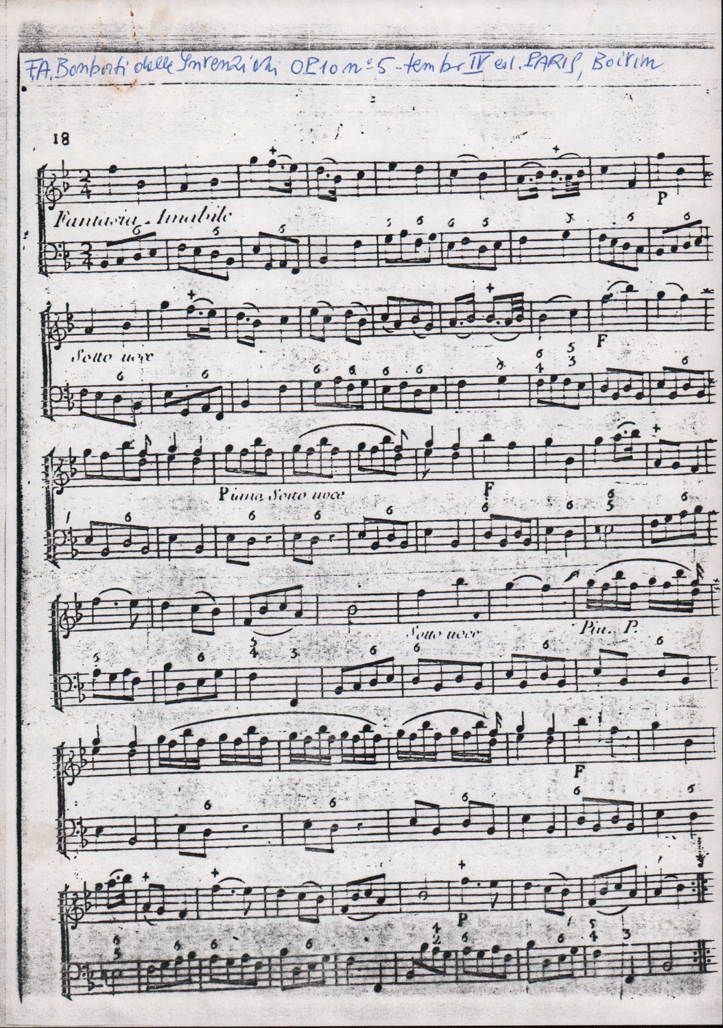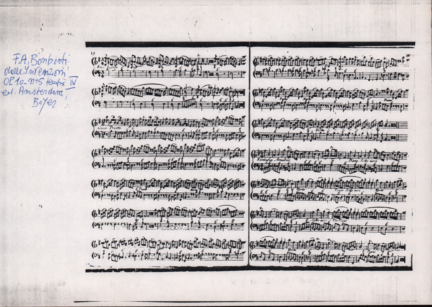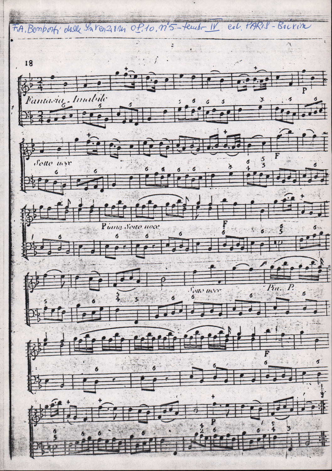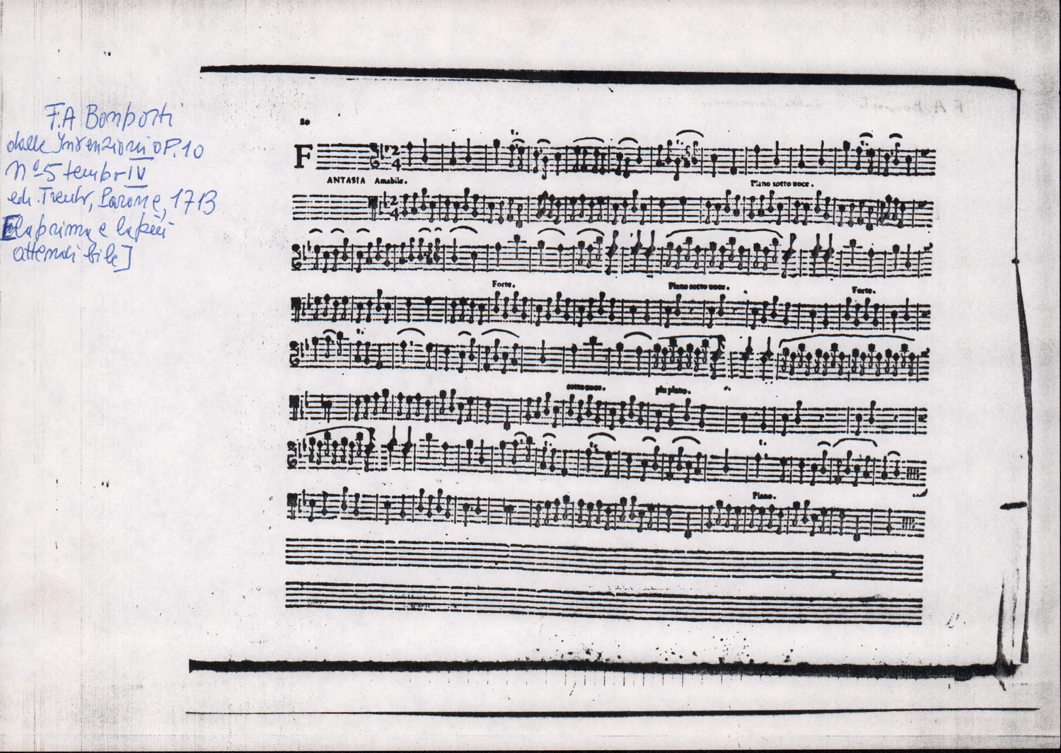 D.4.2.14 - Partiture e testo dell’aria Fantasia amabile, dall’Op. 10 di Francesco Antonio Bonporti “La pace”, Inventione V, ultimo tempo (IV), estratte da diverse edizioni. 5 cc. fotocopiate.