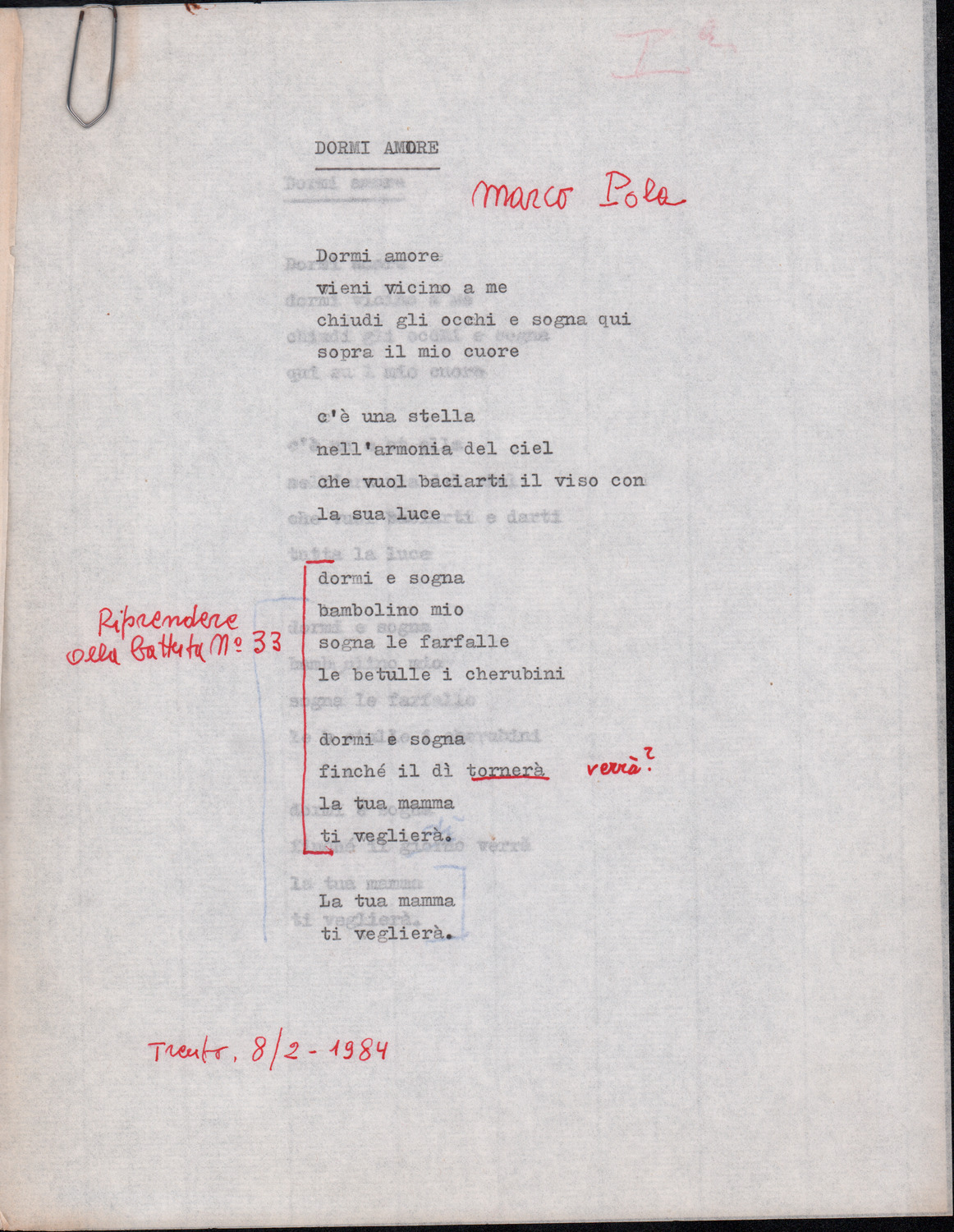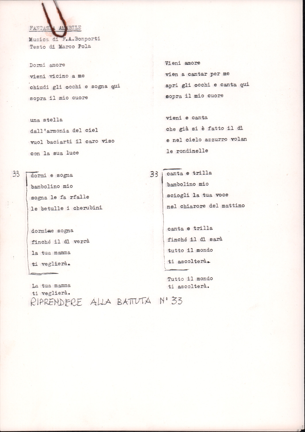 D.4.2.19 - Testo di Marco Pola, Dormi amore, per l’adattamento al brano Fantasia amabile di Francesco Antonio Bonporti. 2 cc. dattiloscritte.