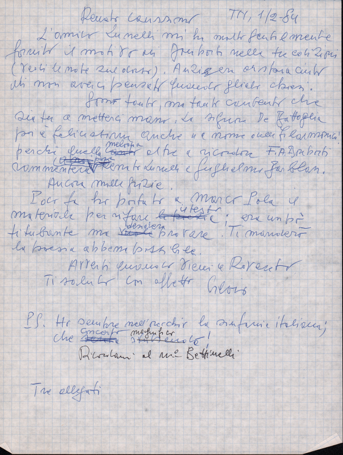 D.4.2.2 - Silvio Pedrotti a Renato Dionisi. Trento, 1984 febbraio 1. 1 c.