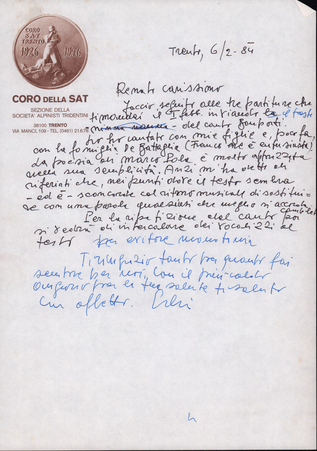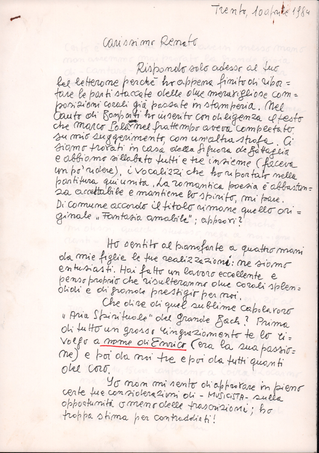 D.4.2.6 - Silvio Pedrotti a Renato Dionisi. Trento, 1984 aprile 10. 2 cc. fotocopiate.