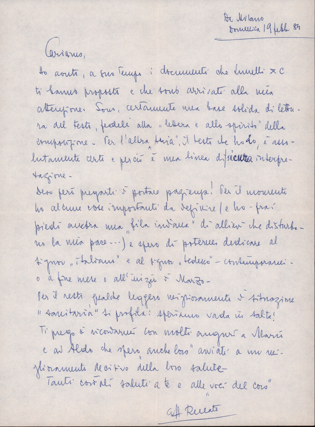 D.4.2.4 - Renato Dionisi a Silvio Pedrotti. Milano, 1984 febbraio 19. 1 c. con busta.