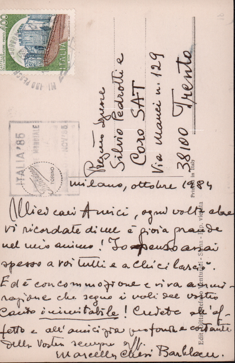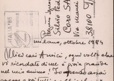 D.4.2.9 - Marcella Chesi Barblan a Silvio Pedrotti. Milano, 1984 ottobre. 1 cartolina.