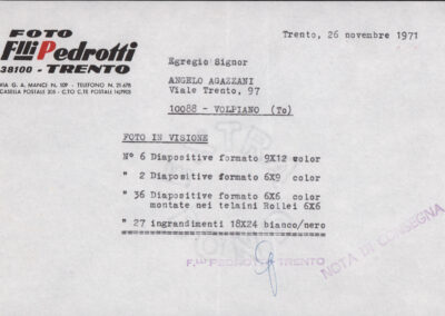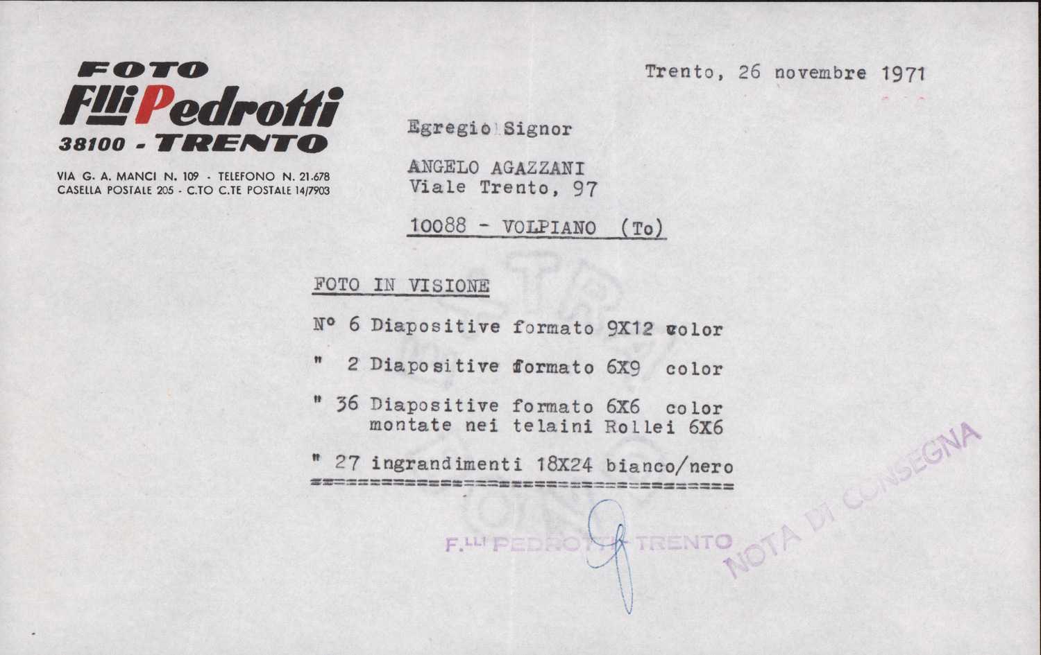 D.4.4.3 - Nota di consegna di copie fotografiche ad Angelo Agazzani. Trento, 26 novembre 1971. 1 c. dattiloscritta.