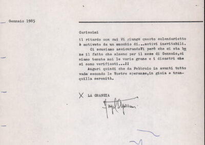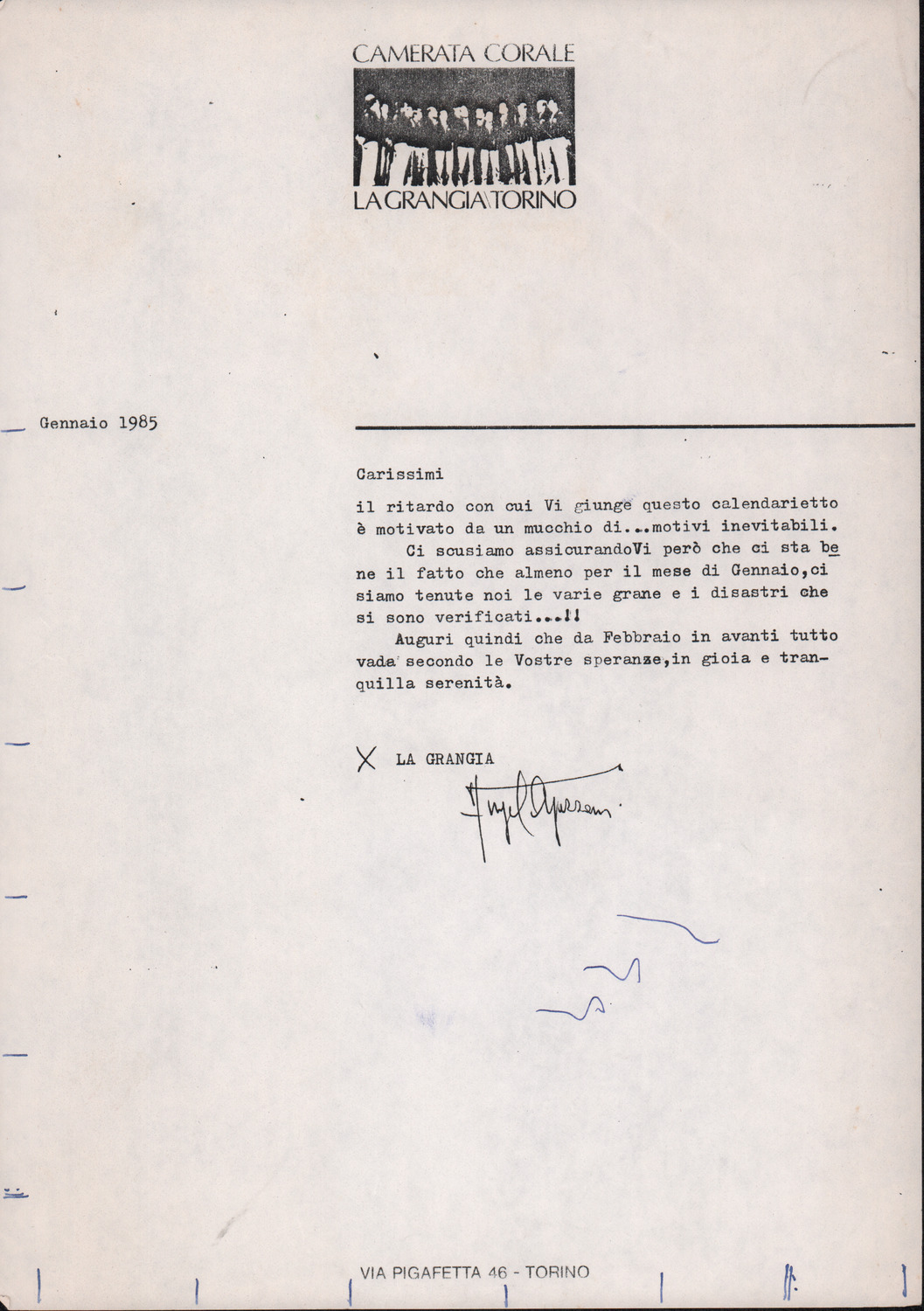 D.4.4.4 - Angelo Agazzani al Coro della SAT. S.l., 1985 gennaio. Allegato calendario del coro La Grangia per l’anno 1985. 1 c. dattiloscritta e 1 calendario.