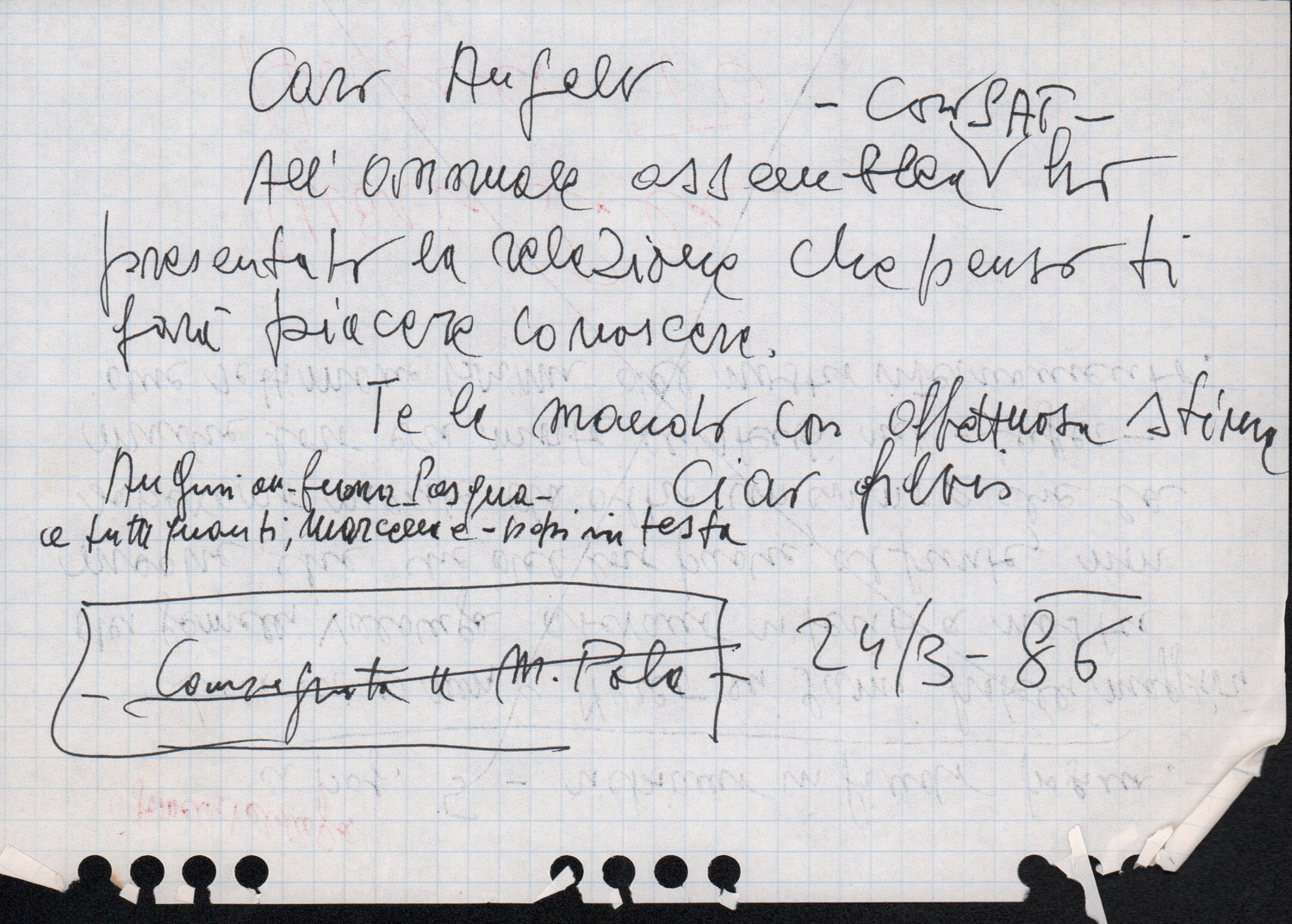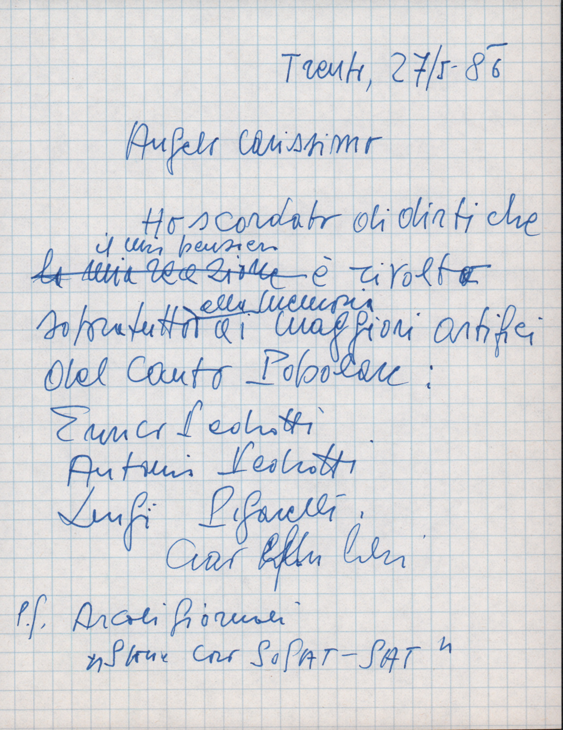 D.4.4.9 - Silvio Pedrotti ad Angelo Agazzani. Trento, 1986 maggio 27. 1 c.