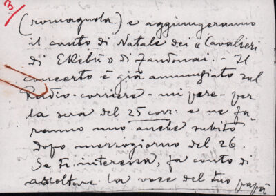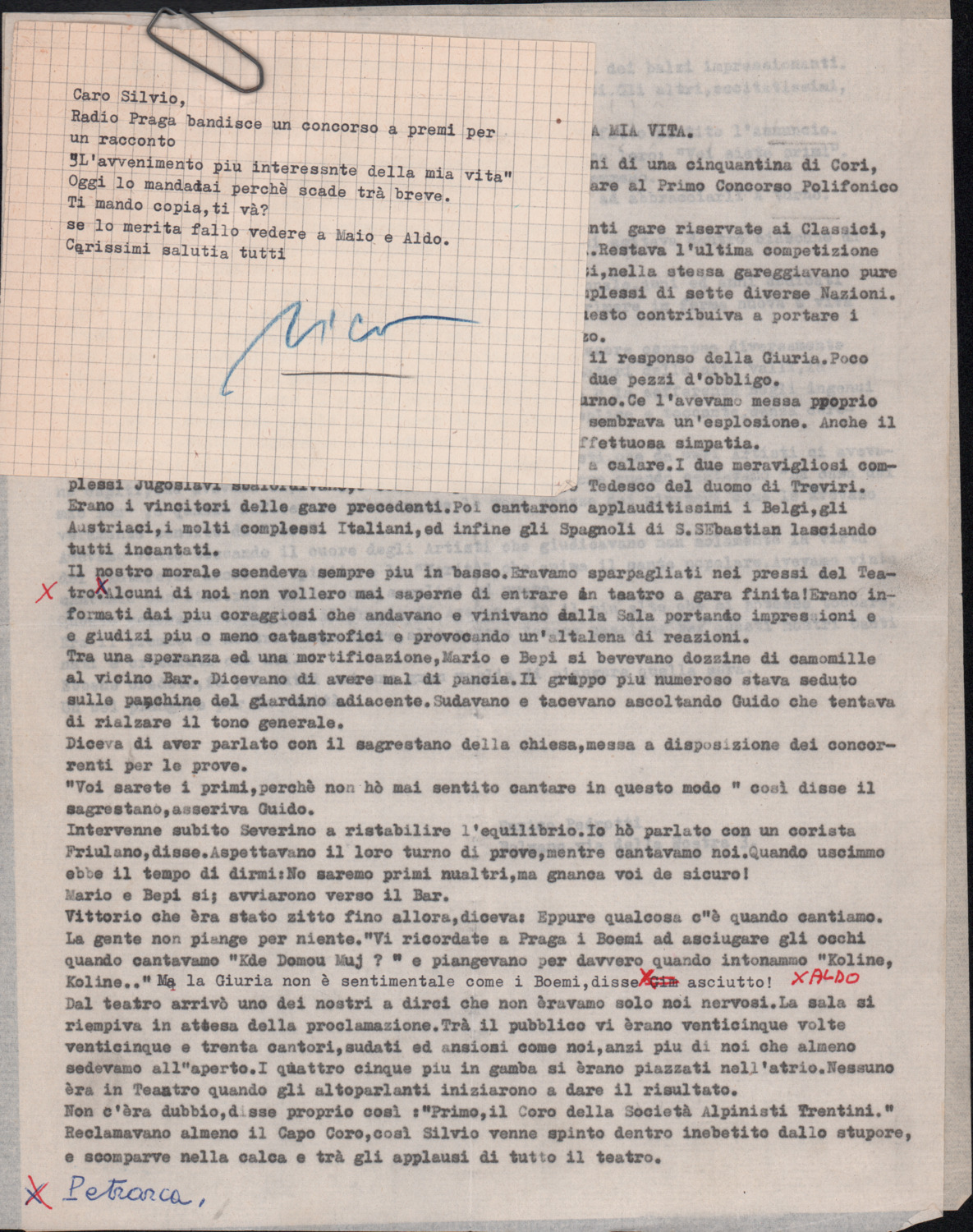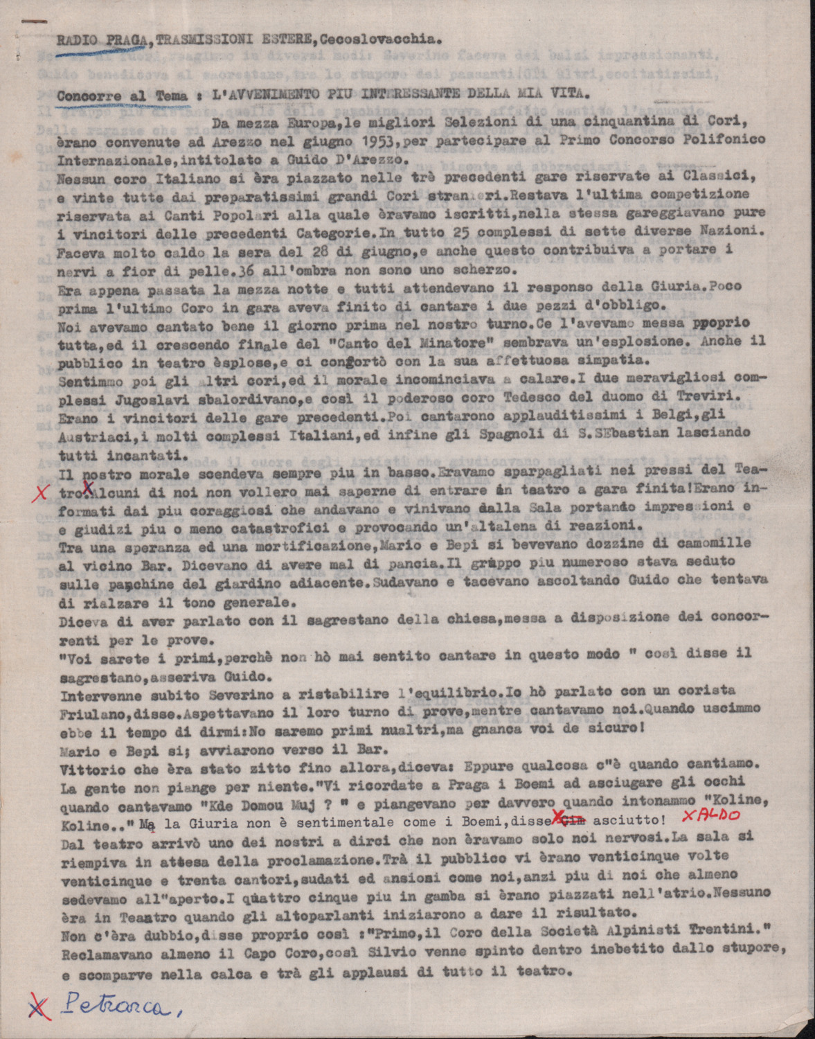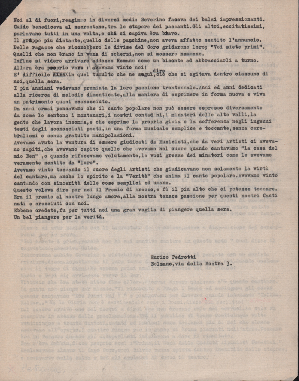 D.5.4.8 - Nota di Enrico Pedrotti per Silvio Pedrotti. Allegato testo scritto da Enrico Pedrotti per il concorso a premi per un racconto a tema «L’avvenimento più interessante della mia vita», bandito da Radio Praga. 3 cc. dattiloscritte.