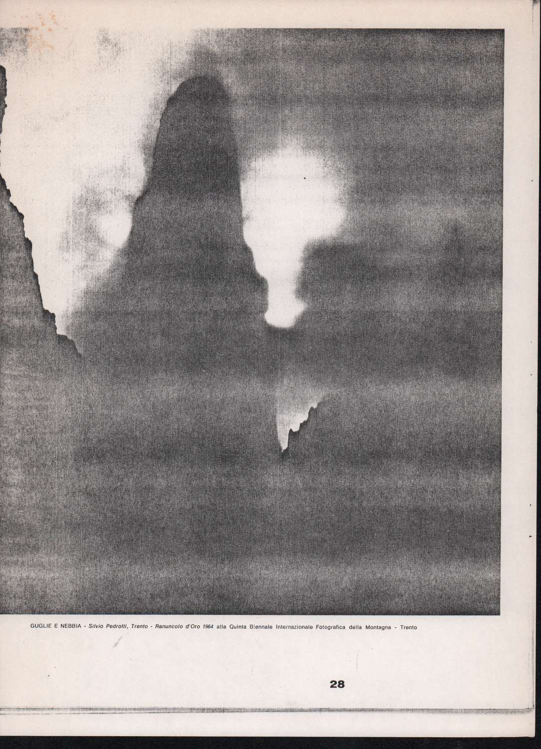 D.5.4.11 - Fotocopia da edizione non identificata, con fotografia «Guglie e nebbia» di Silvio Pedrotti, vincitrice del Ranuncolo d’Oro alla Quinta Biennale Internazionale Fotografica della Montagna, Trento, 1964. 2 cc. fotocopiate.
