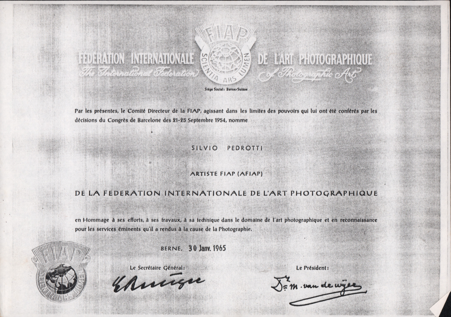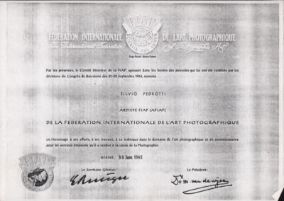 D.5.4.13 - Attestato di nomina di Silvio Pedrotti ad artista FIAP (Federation Internationale de l’Art Photographique). Berna, 30 gennaio 1965. 1 c. fotocopiata.