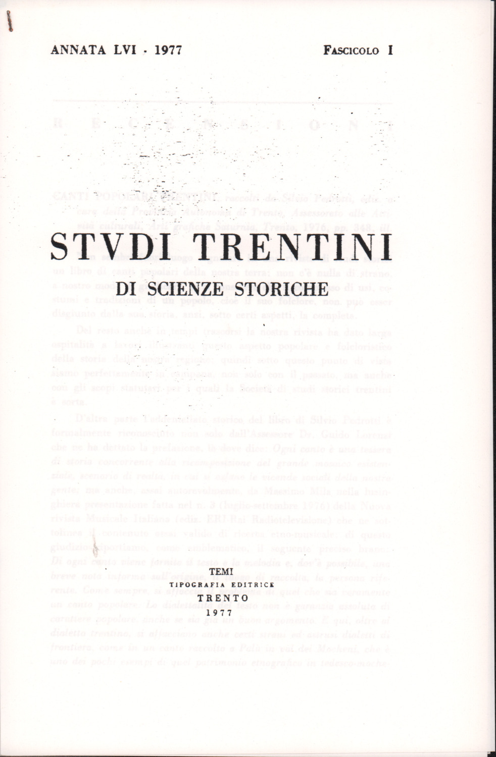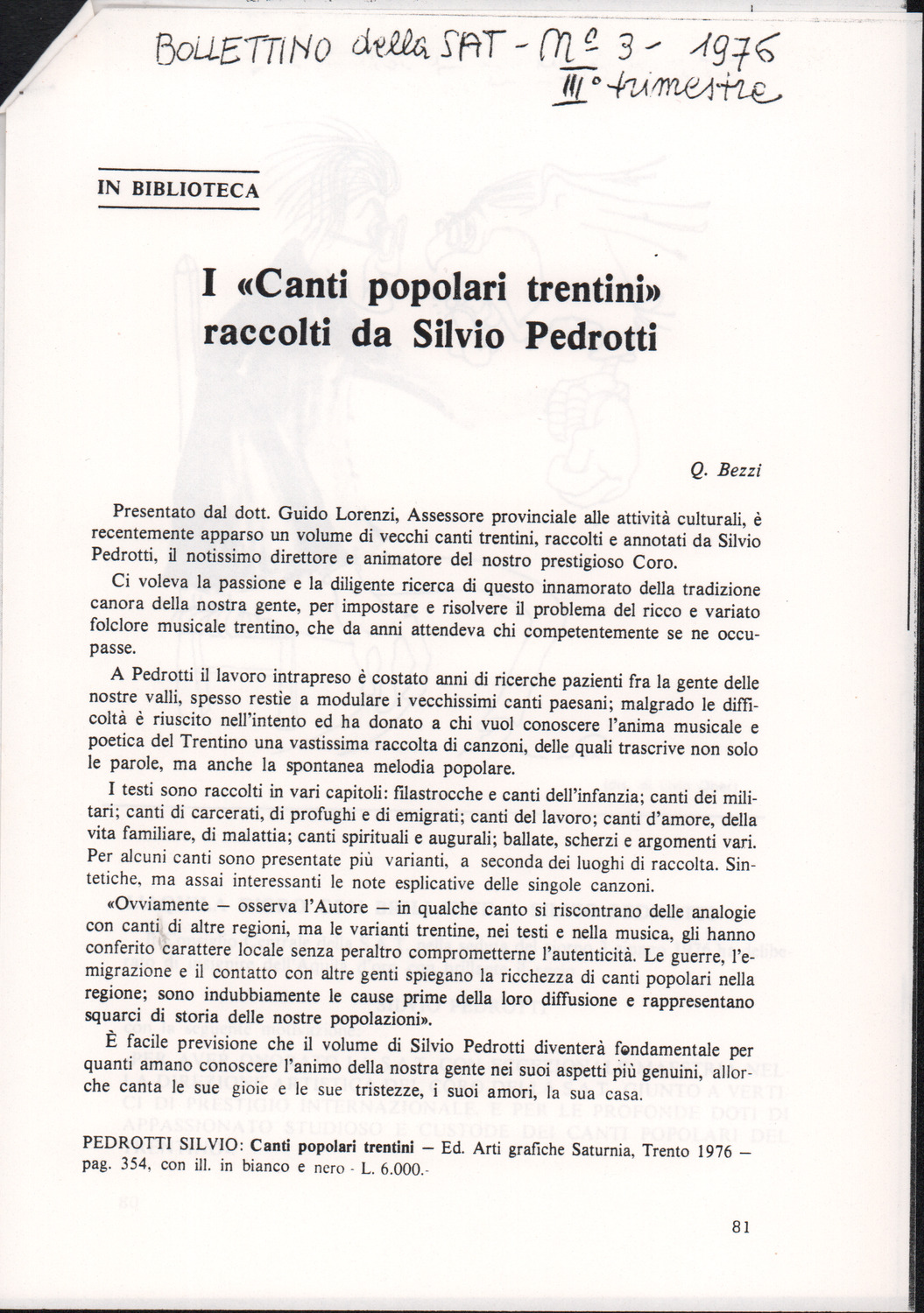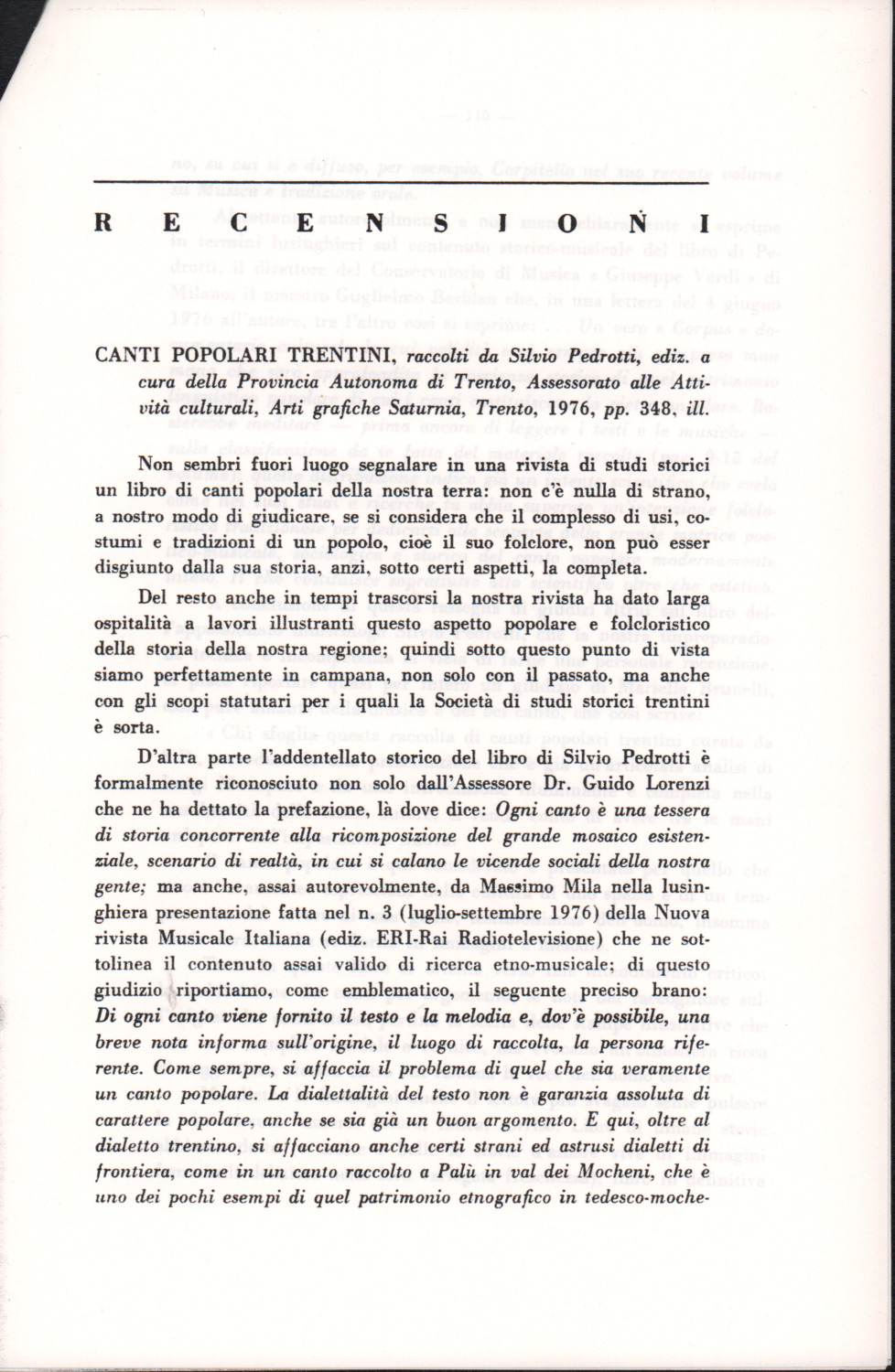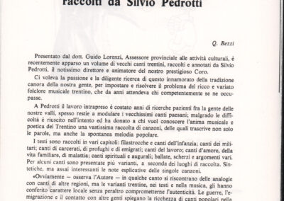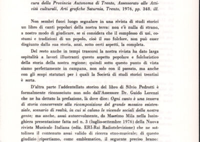 D.5.4.15 - Recensione di Pasquale Pizzini all’edizione Silvio Pedrotti, Canti popolari trentini raccolti da Silvio Pedrotti, a cura della Provincia Autonoma di Trento, Arti Grafiche Saturnia, Trento, 1976, in «Studi trentini di scienze storiche», 56/1 (1977), pp. 109-111. 12 cc. fotocopiate.