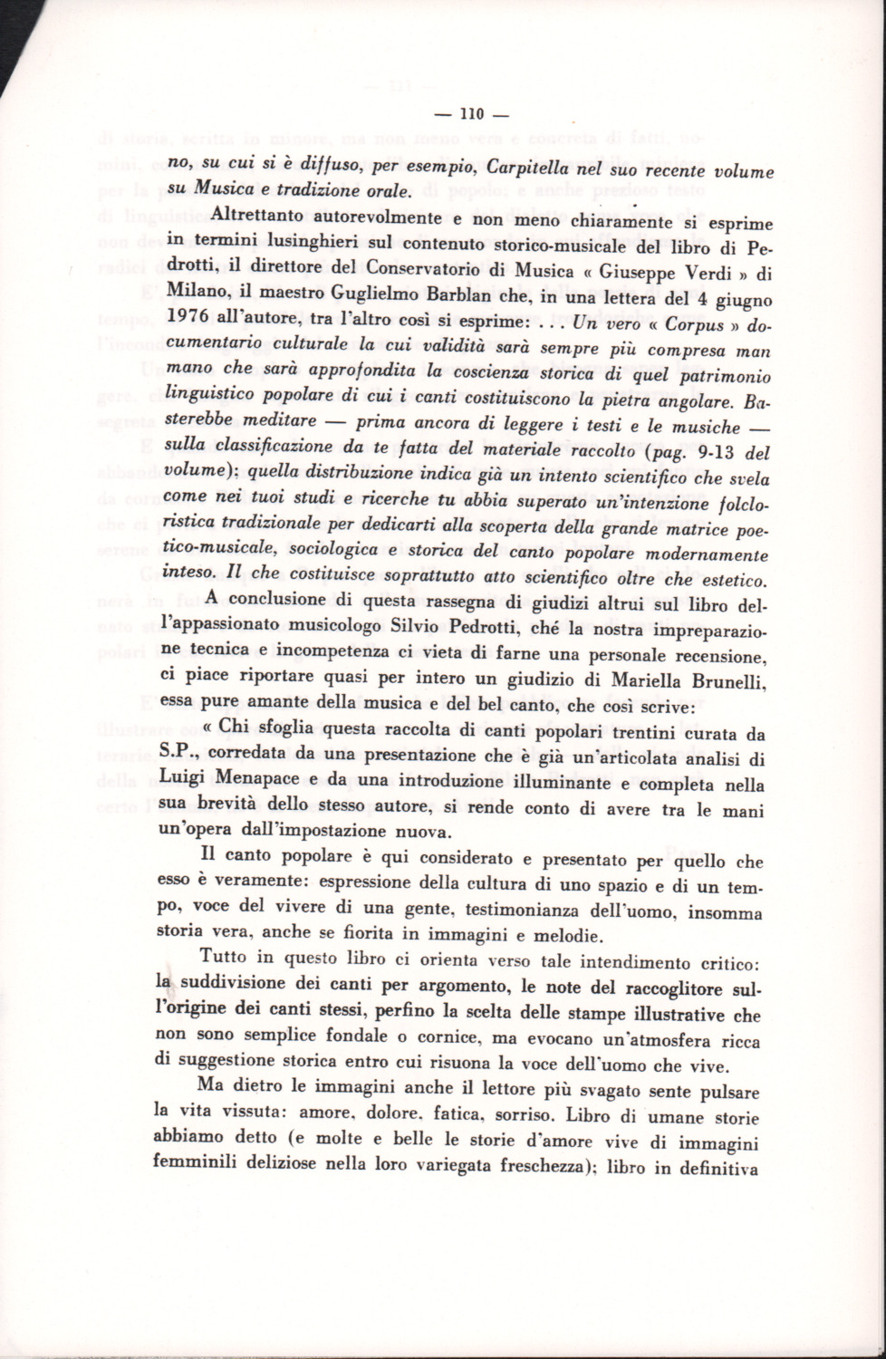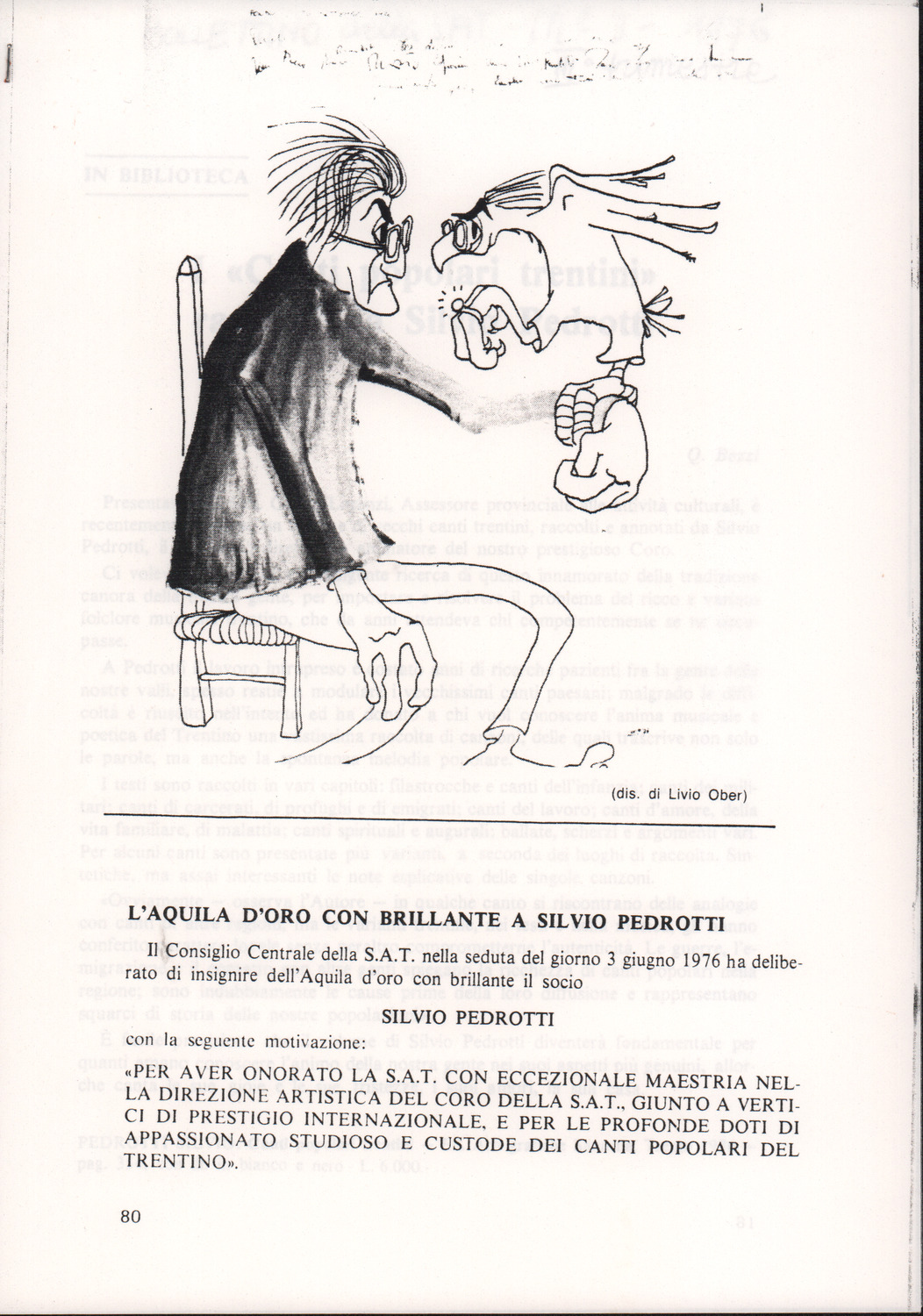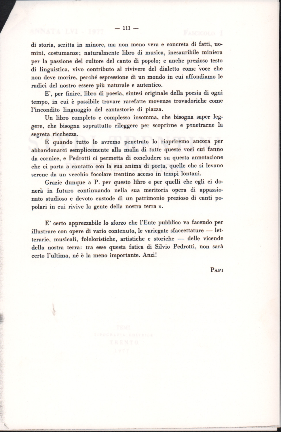 D.5.4.15 - Recensione di Pasquale Pizzini all’edizione Silvio Pedrotti, Canti popolari trentini raccolti da Silvio Pedrotti, a cura della Provincia Autonoma di Trento, Arti Grafiche Saturnia, Trento, 1976, in «Studi trentini di scienze storiche», 56/1 (1977), pp. 109-111. 12 cc. fotocopiate.
