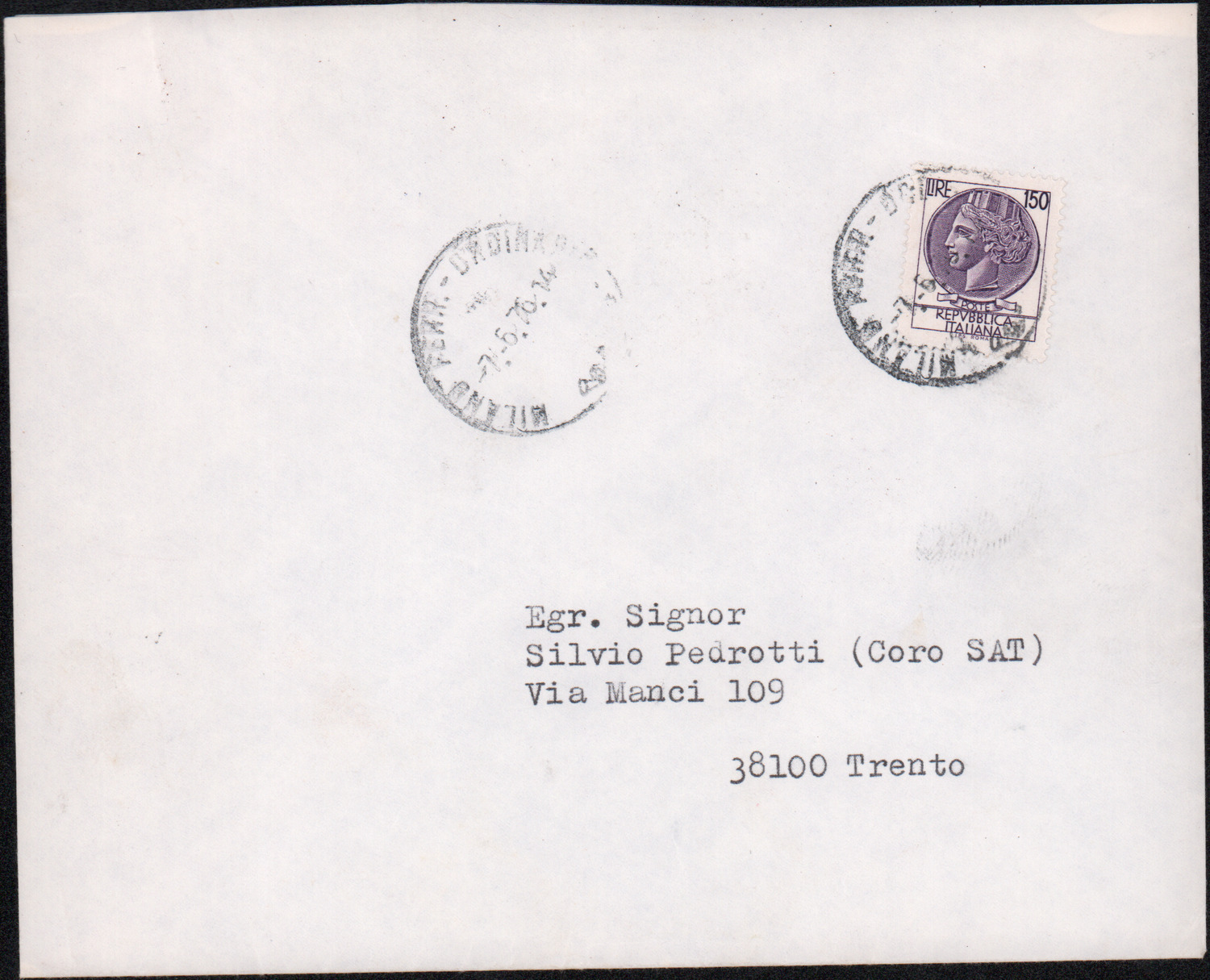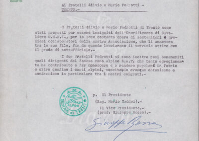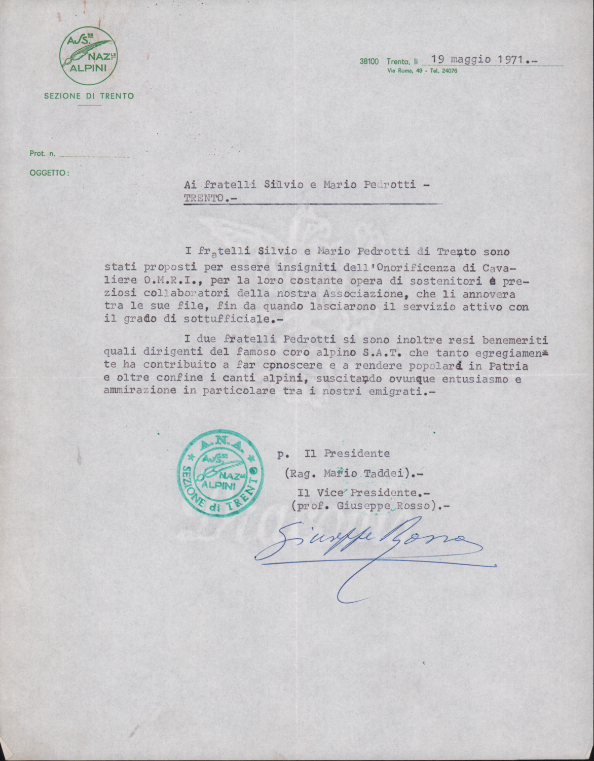 D.5.4.16 - Mario Taddei, Presidente A.N.A. Sezione Trento, a Silvio Pedrotti. Trento, 1971 maggio 19. 1 c. dattiloscritta e 1 copia.