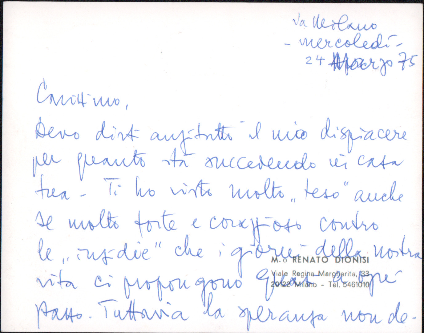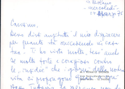 D.5.4.17 - Renato Dionisi a Silvio Pedrotti. Milano, 1975 marzo 24. 1 c. manoscritta e 1 c. fotocopiata.