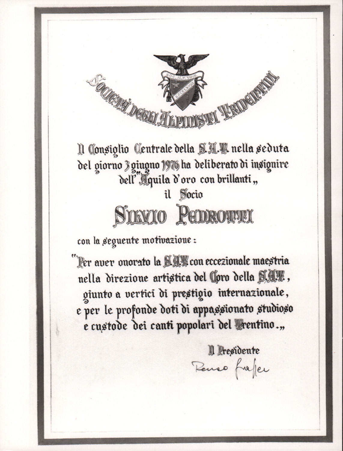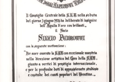 D.5.4.19 - Attestato di consegna del premio «Aquila d’oro con brillanti» a Silvio Pedrotti. 1 copia fotografica.