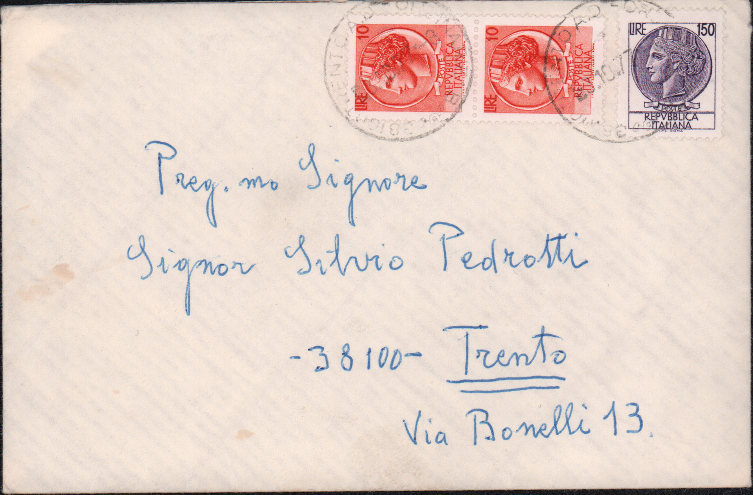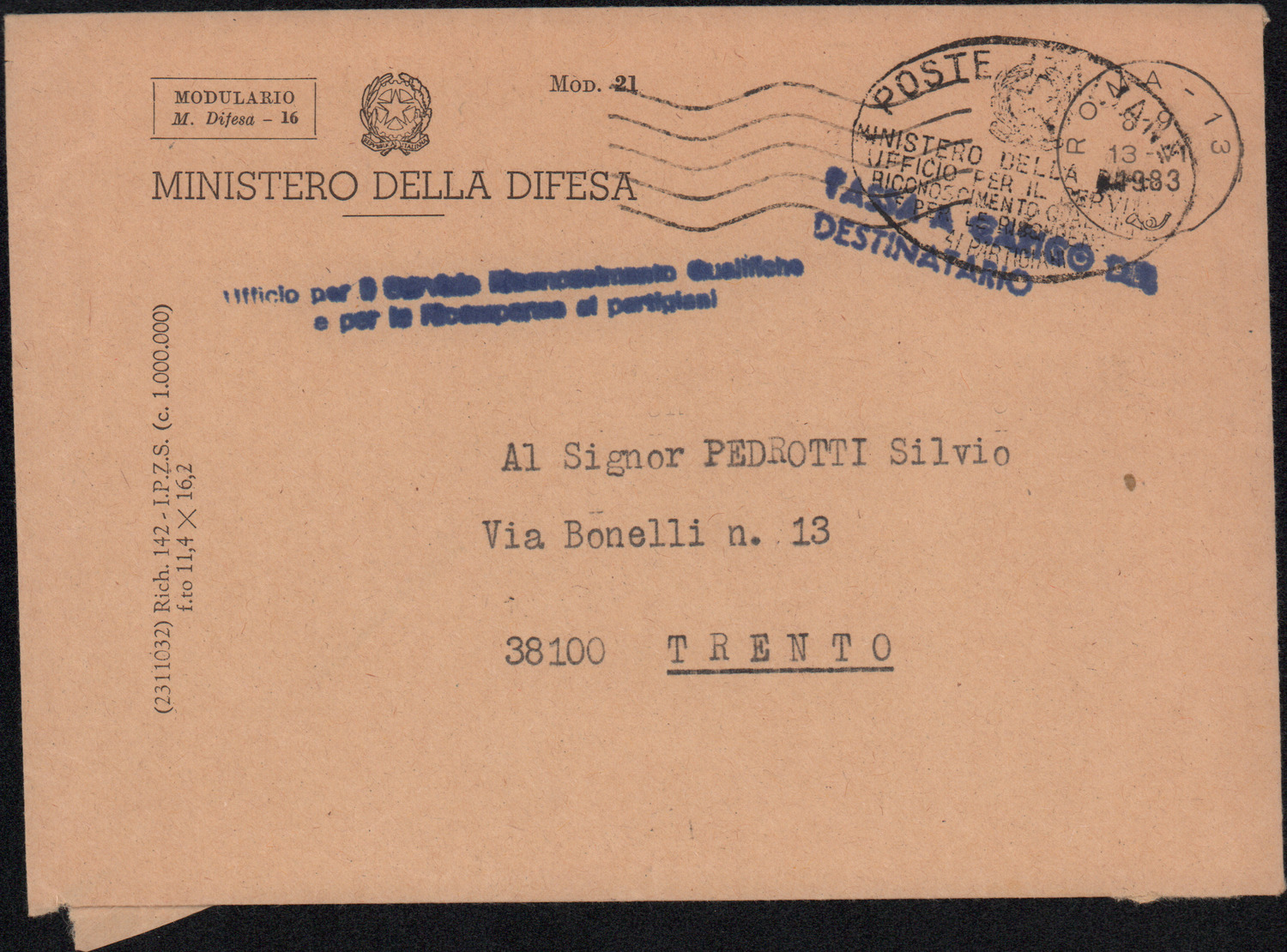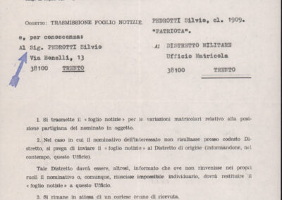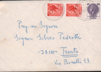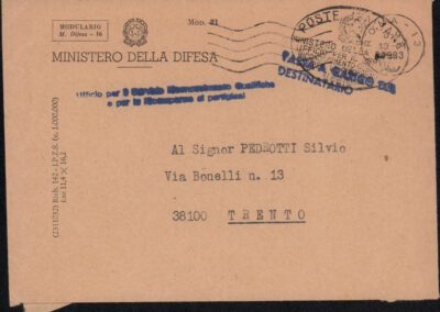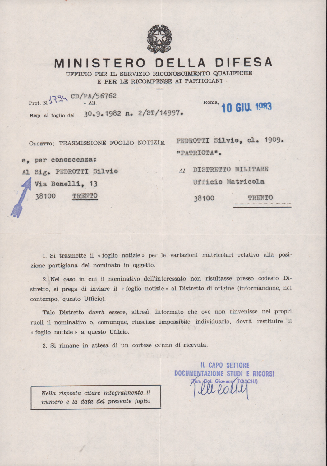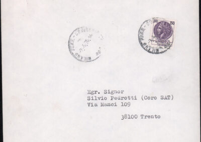 D.5.4.29 - Giovanni Toschi, Capo settore documentazione studi e ricorsi del Ministero della Difesa, al Distretto Militare di Trento e a Silvio Pedrotti. Roma, 1983 giugno 10. 1 c. dattiloscritta in busta.