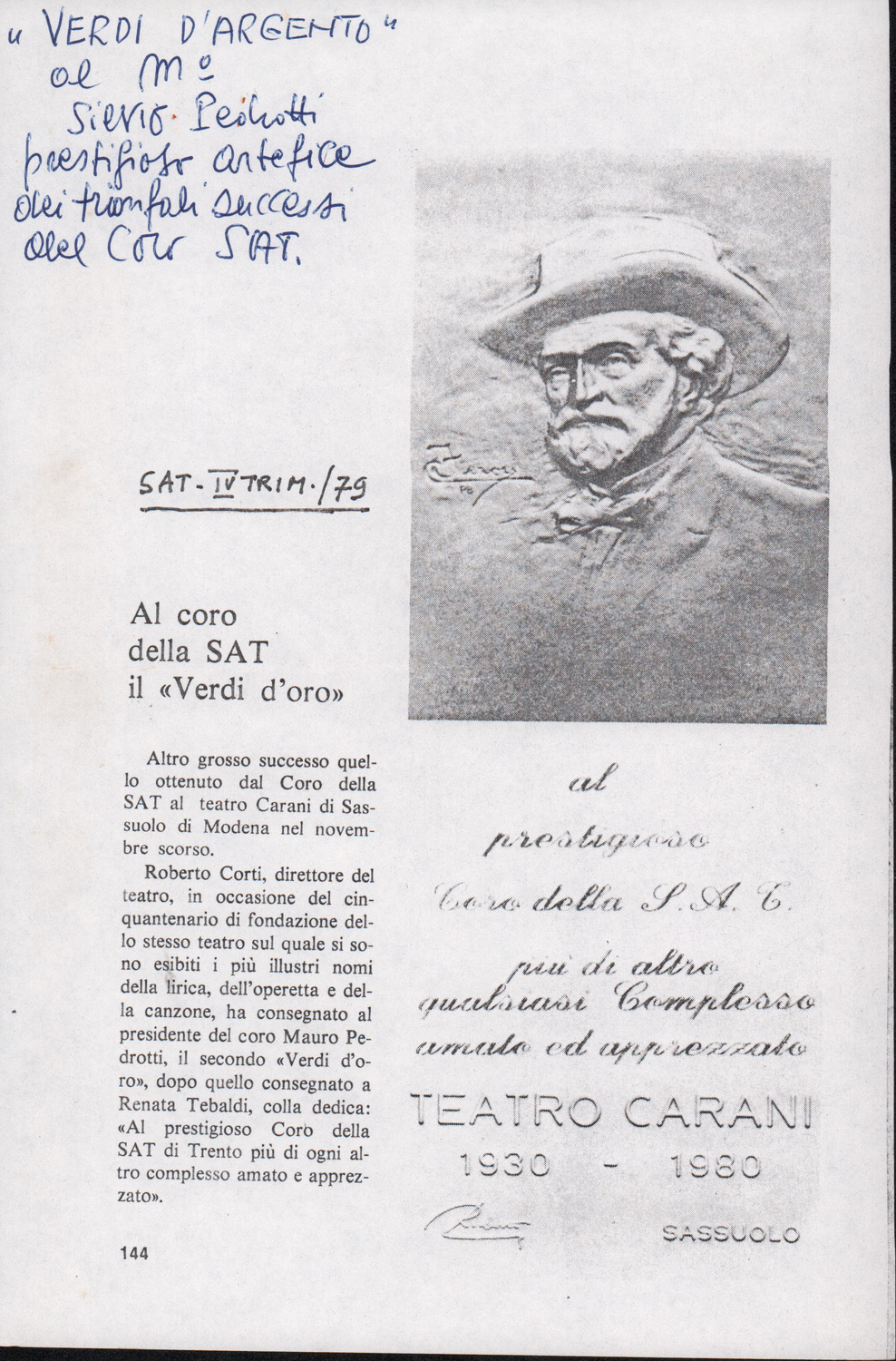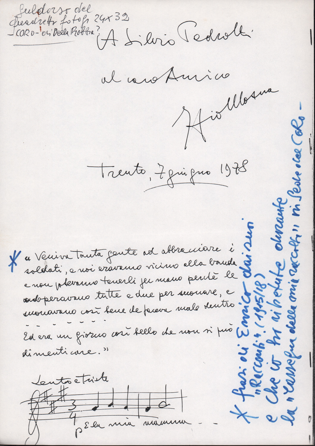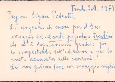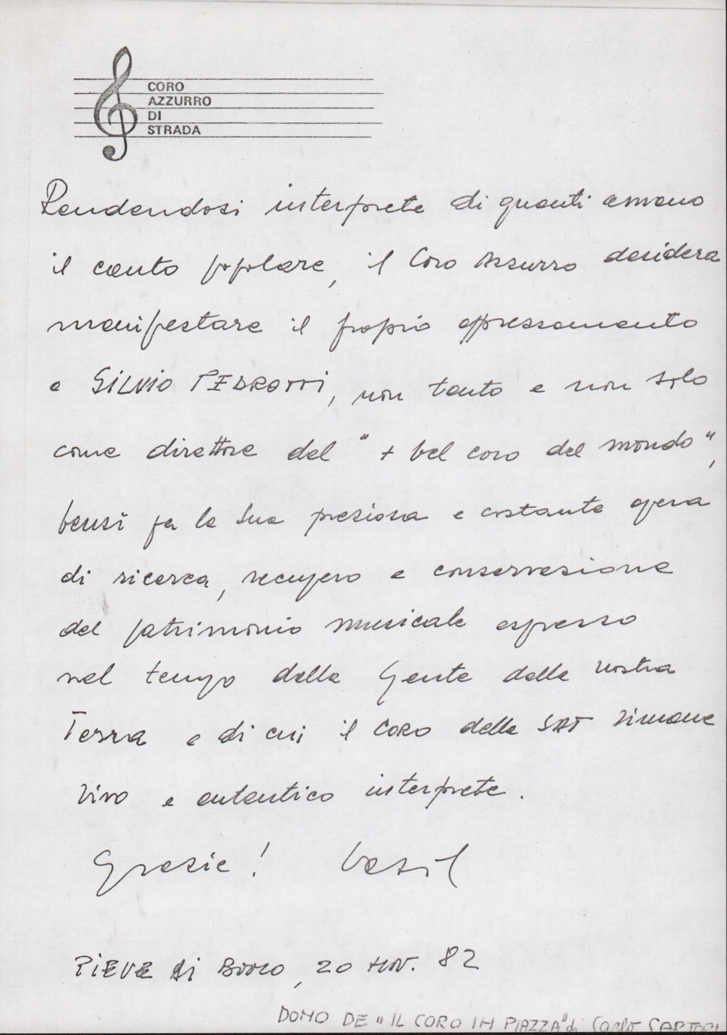 D.5.4.27 - Dedica del «Coro Azzurro di Strada» a Silvio Pedrotti, in occasione del dono dell’opera di Carlo Sartori «Il coro in piazza». 20 novembre 1982. 2 cc. fotocopiate.