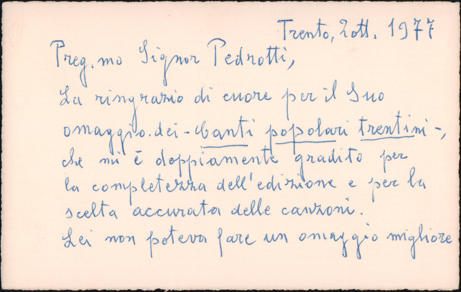 D.5.4.21 - Antonio Zieger a Silvio Pedrotti. Trento, 1977 ottobre 2. 1 c. manoscritta e 1 c. fotocopiata.