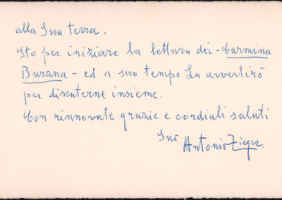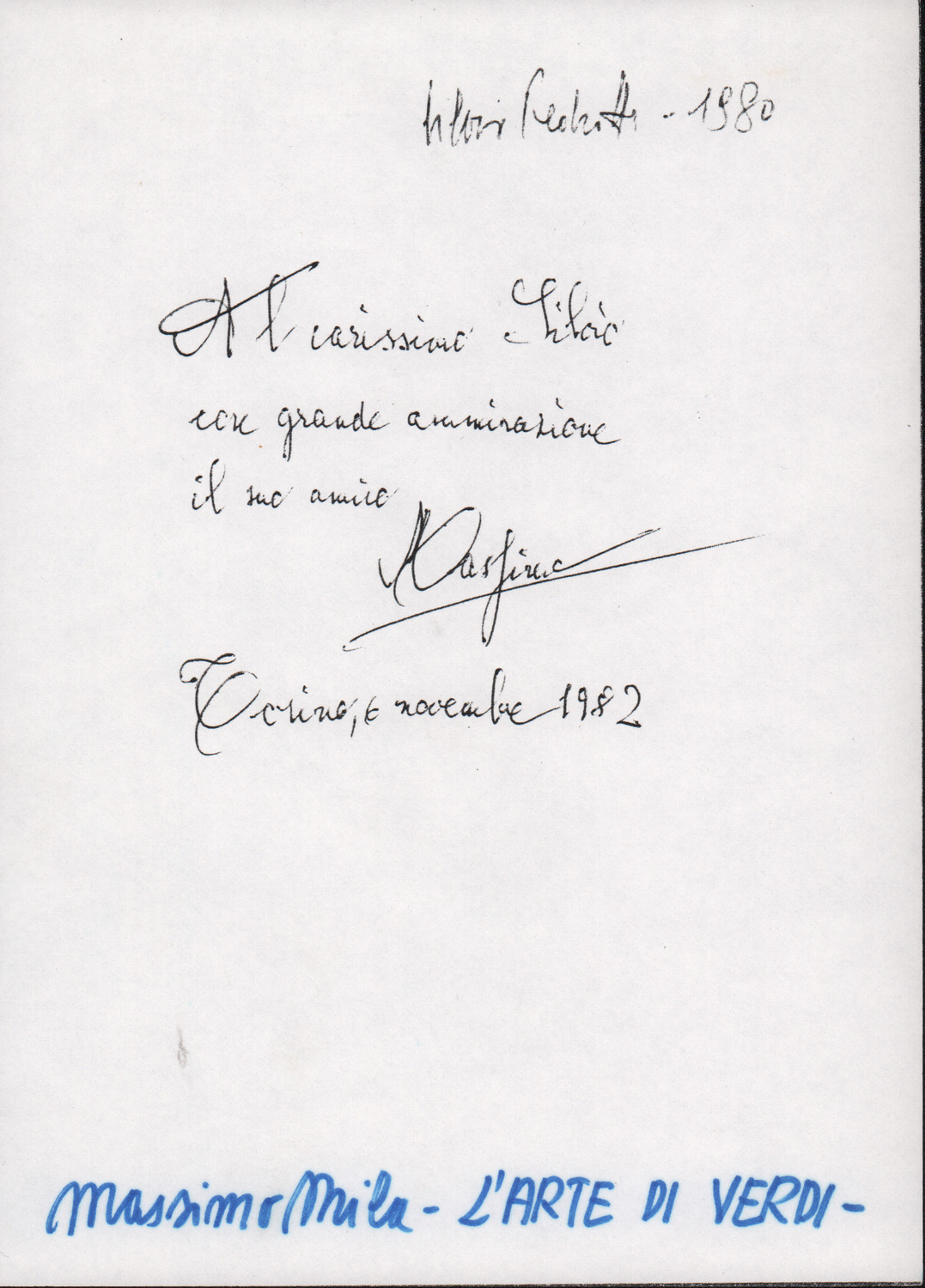 D.5.4.26 - Dedica di Massimo Mila a Silvio Pedrotti apposta sul volume Massimo Mila, L’arte di Verdi, Einaudi, Torino, 1980. Tesino, 6 novembre 1982. 1 c. fotocopiata.