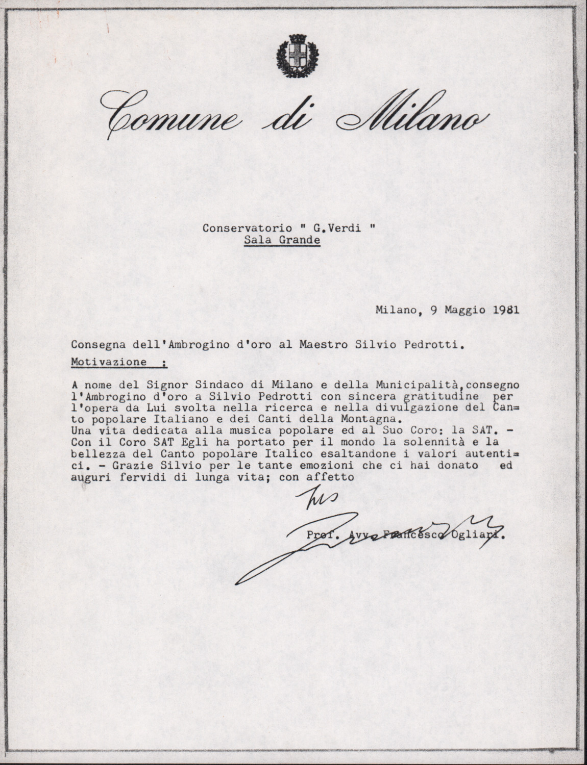 D.5.4.24 - Attestato di consegna del premio «Ambrogino d’oro» a Silvio Pedrotti. Milano, 9 maggio 1981. 4 cc. fotocopiate.