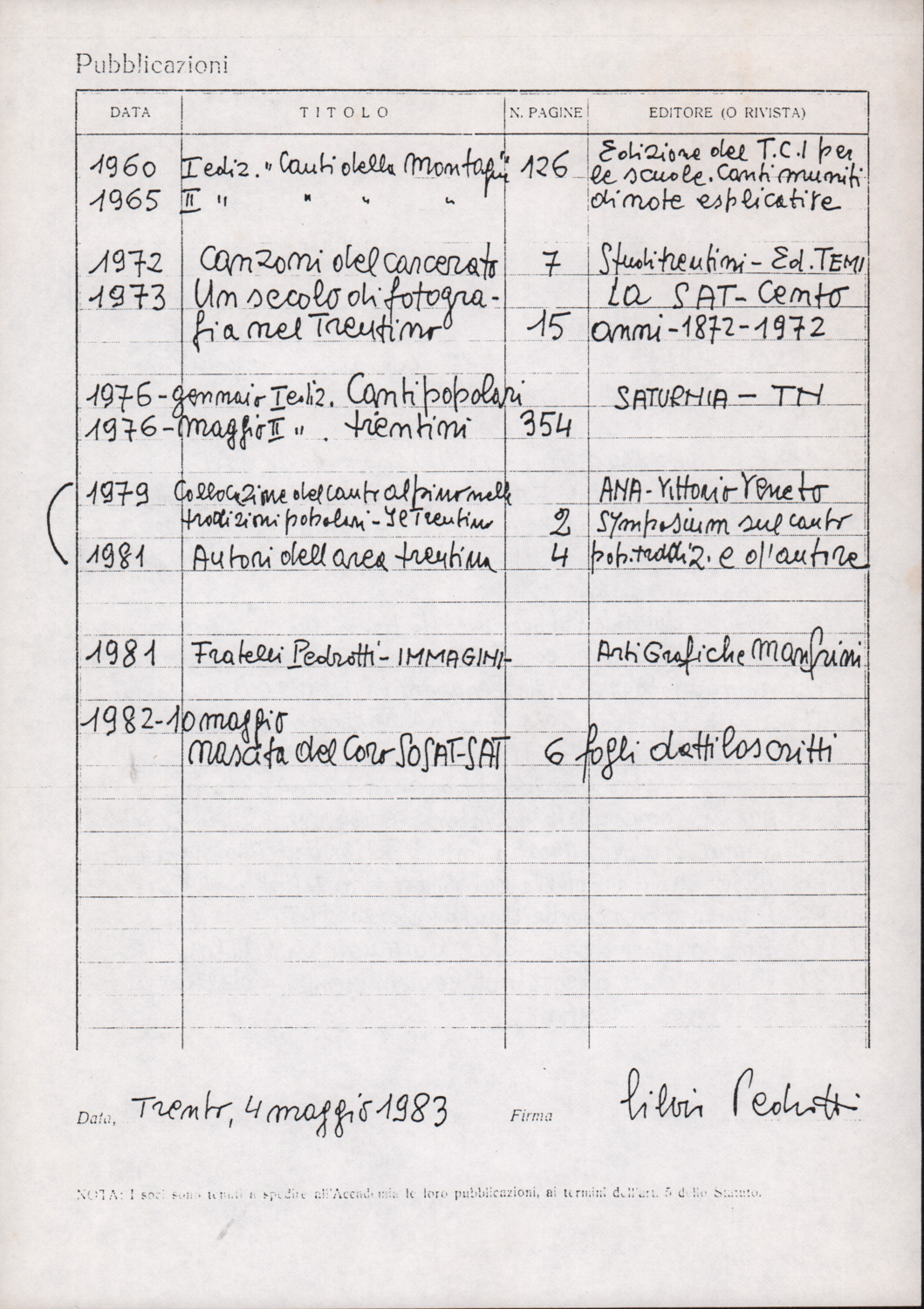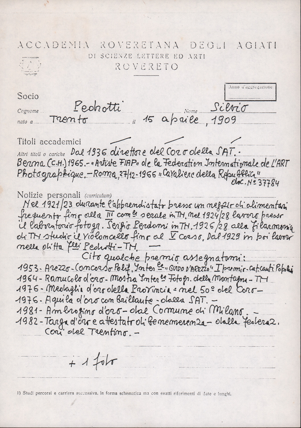 D.5.4.28 - Schede di curriculum compilate da Silvio Pedrotti per la nomina a Socio dell’Accademia degli Agiati di Rovereto. 4 maggio 1983. 2 cc. fotocopiate.