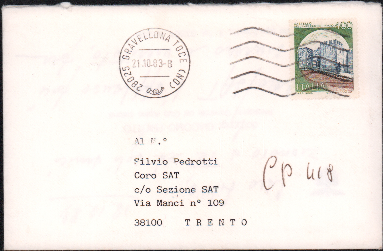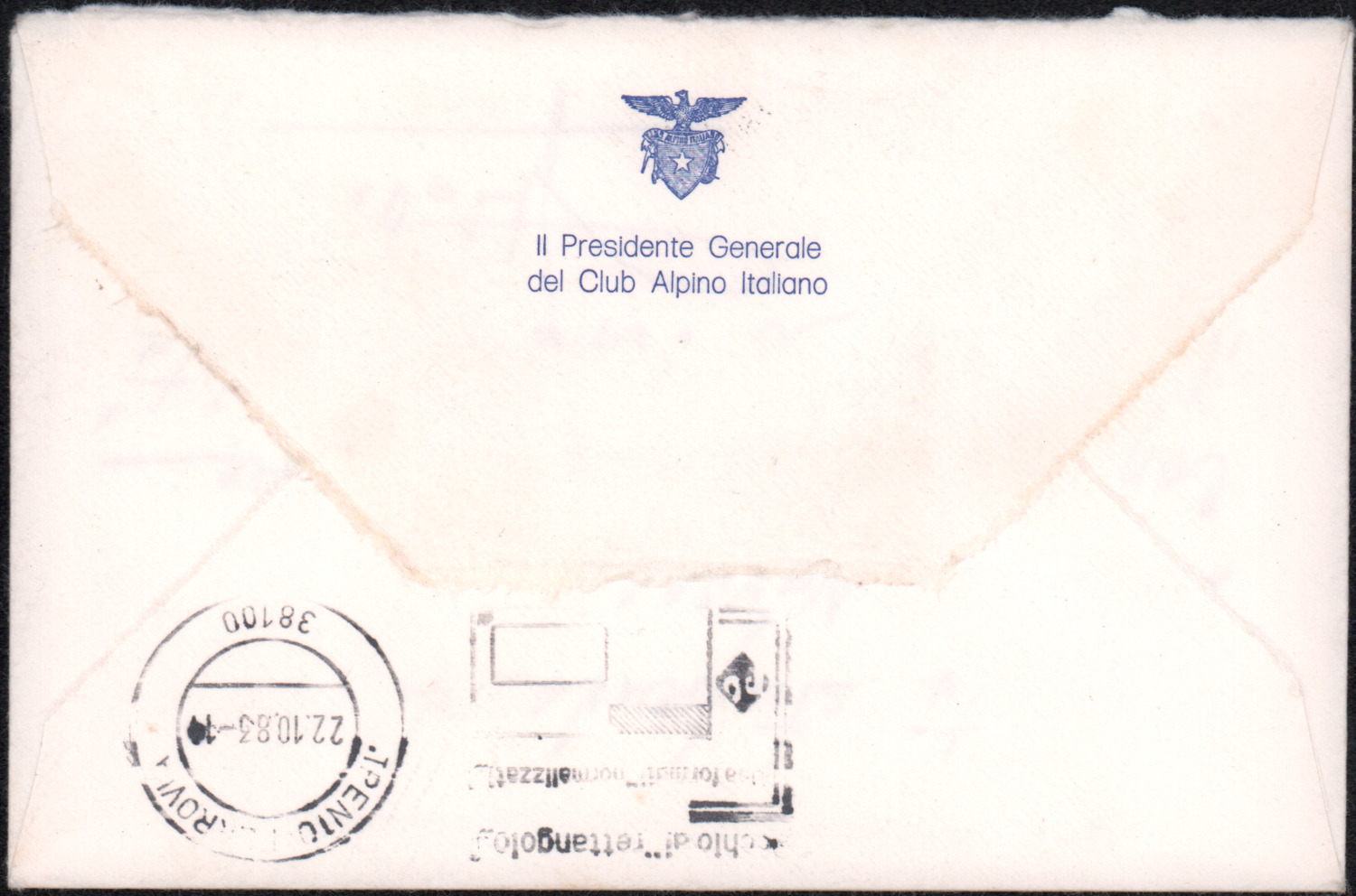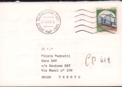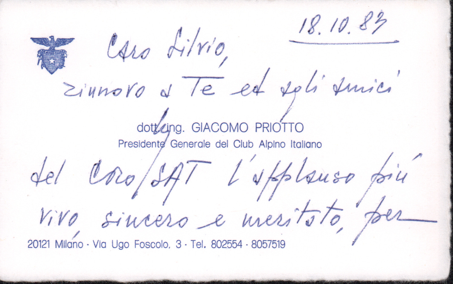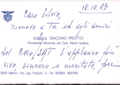 D.5.4.31 - Giacomo Priotto, Presidente del CAI, a Silvio Pedrotti. S.l., 1983 ottobre 18. 1 biglietto in busta.