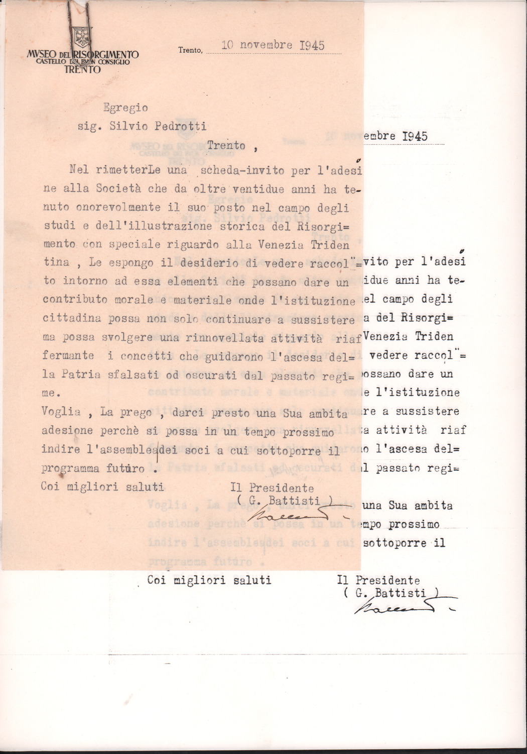 D.5.4.5 - G. Battisti a Silvio Pedrotti. Trento, 1945 novembre 10. 1 c. dattiloscritta e 3 cc. fotocopiate.