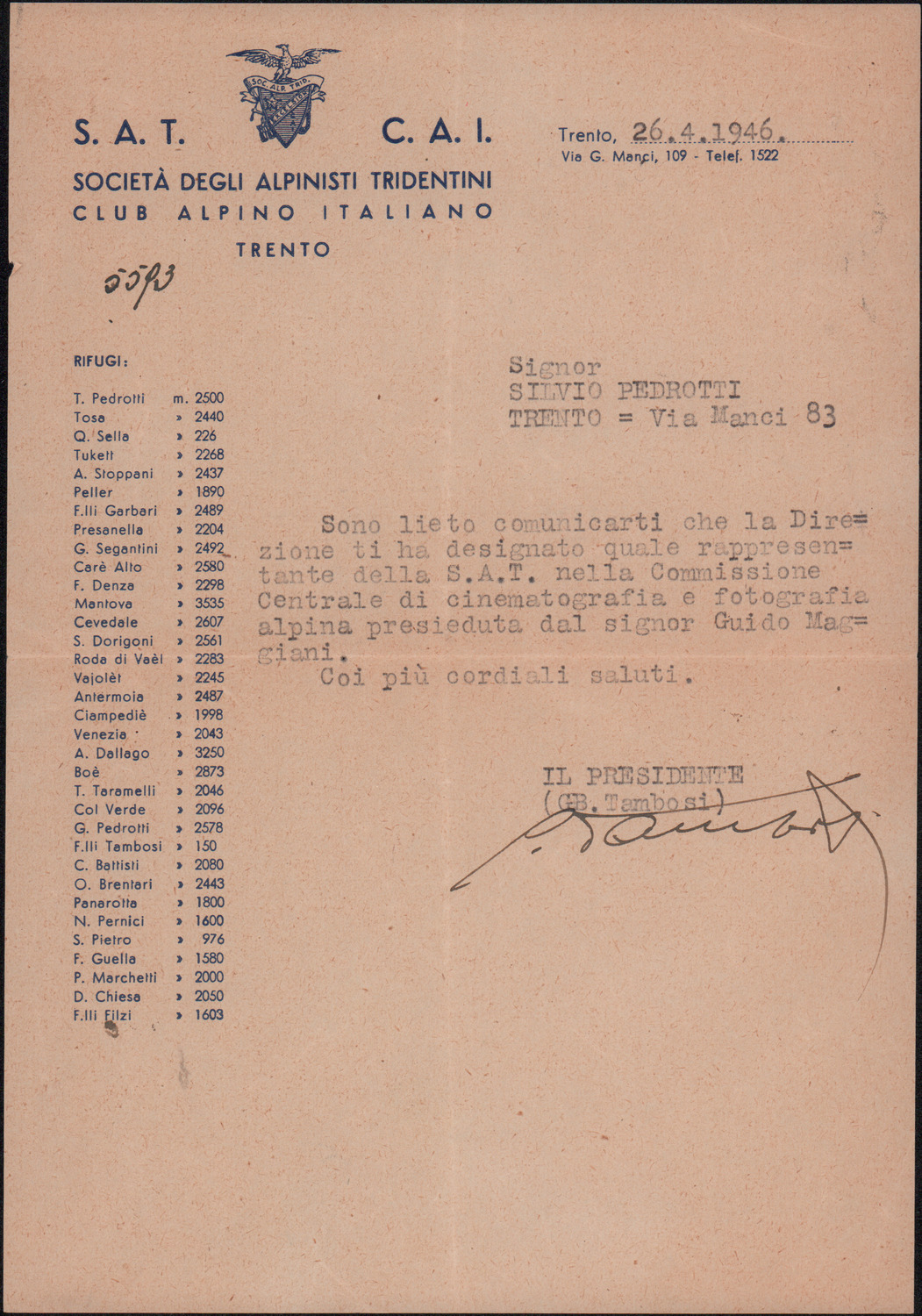 D.5.4.6 - Giovanni Battista Tambosi a Silvio Pedrotti. Trento, 1946 aprile 26. 1 c. dattiloscritta.