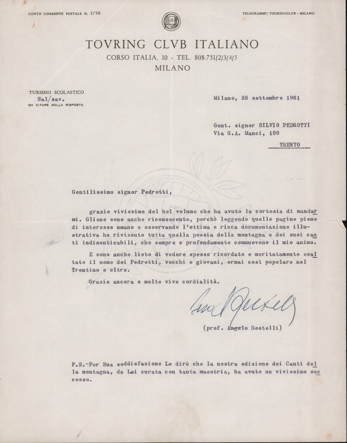 D.5.4.9 - Angelo Restelli a Silvio Pedrotti. Milano, 1961 settembre 28. 1 c. dattiloscritta e 1 c. fotocopiata.