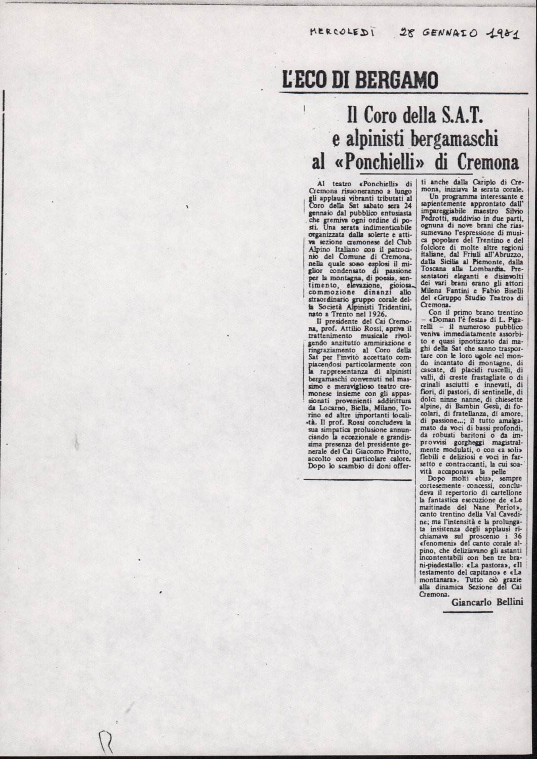 D.6.10.11 - Ritaglio di giornale dal quotidiano «L’ Eco di Bergamo», 28 gennaio 1981. Allegata nota di ringraziamento di Silvio Pedrotti a Giancarlo Bellini, autore dell’articolo. 1 c. manoscritta e 7 cc. fotocopiate.