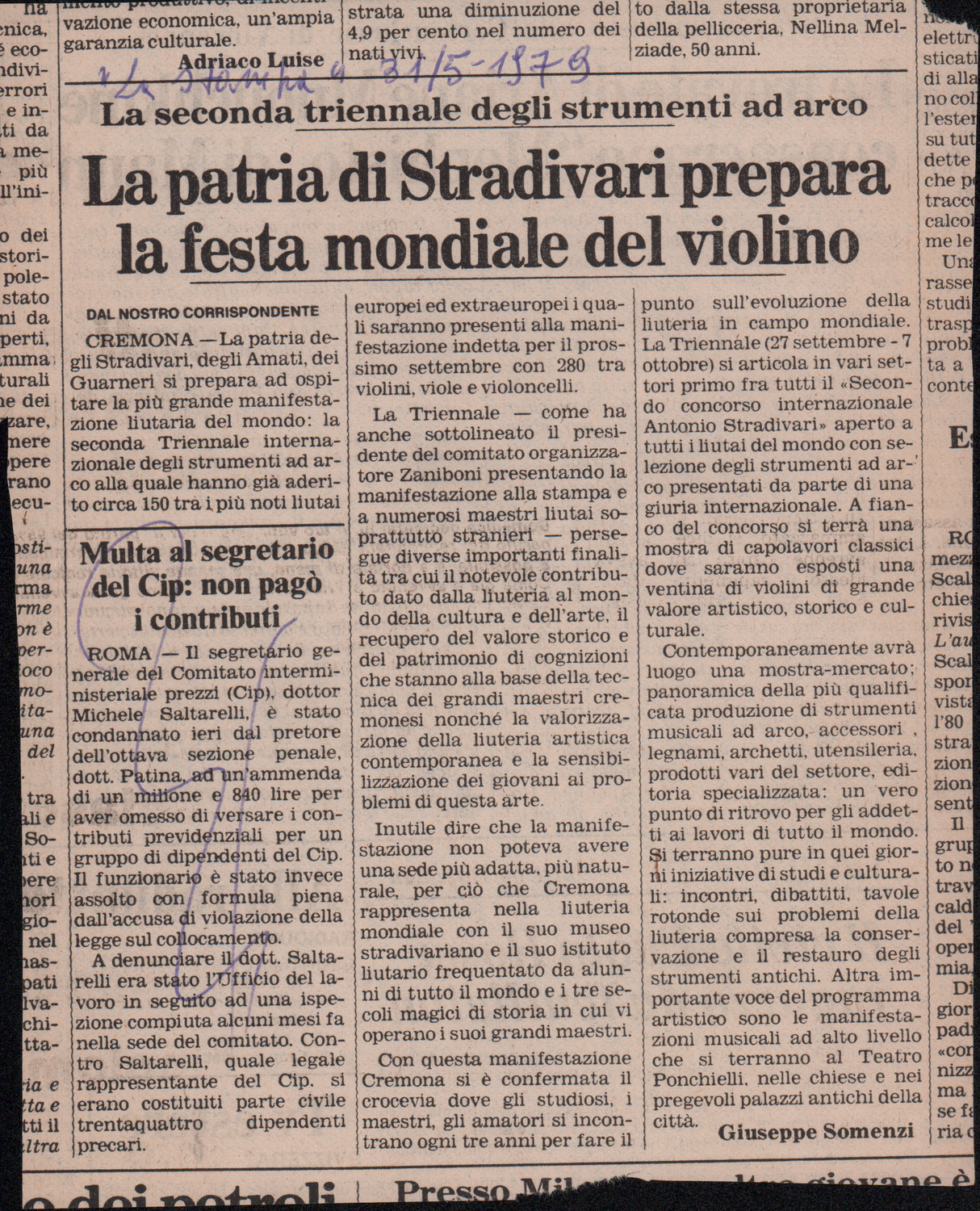 D.6.10.9 - Quotidiano «La Stampa», 31 maggio 1979. 1 ritaglio di giornale.