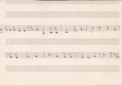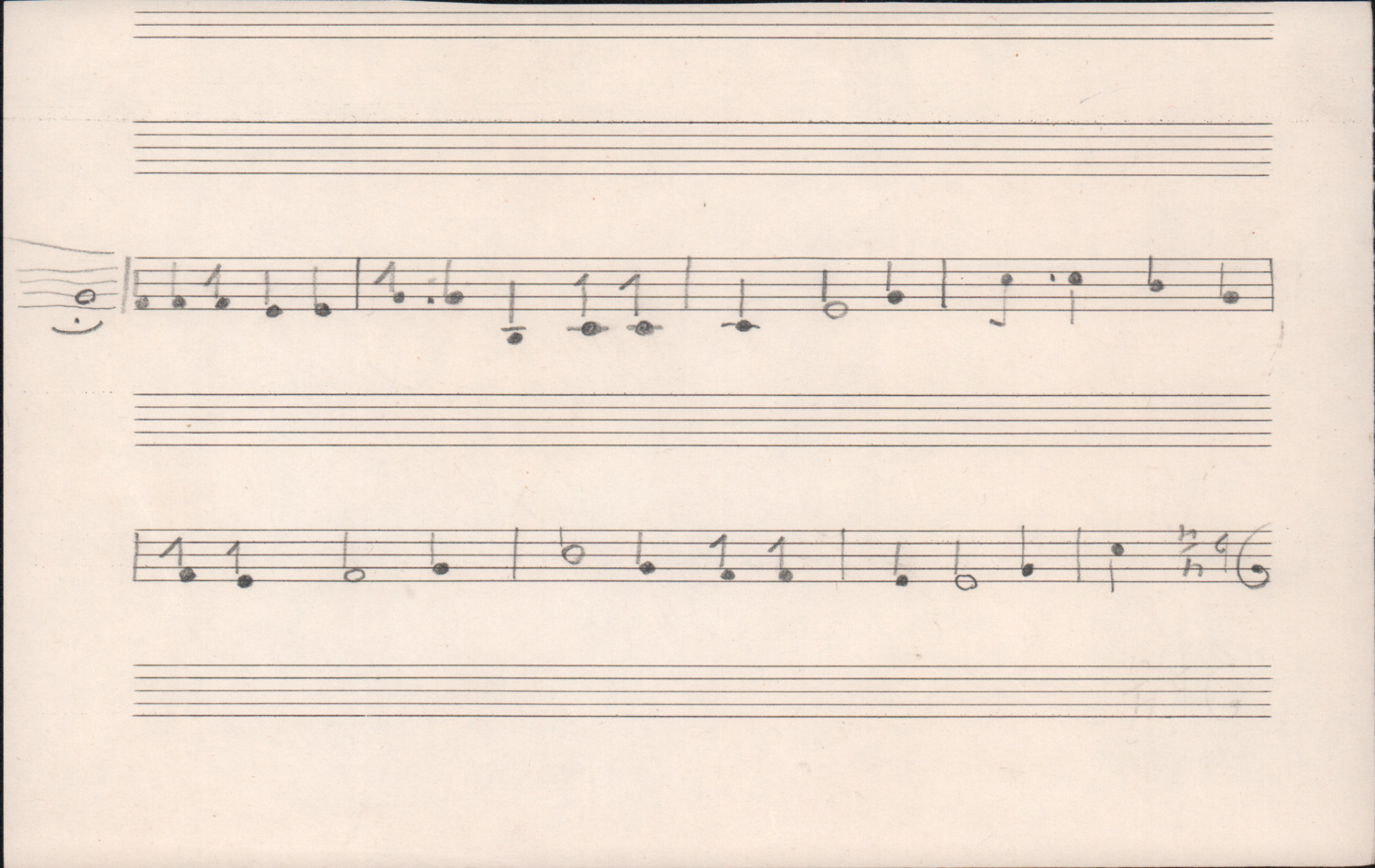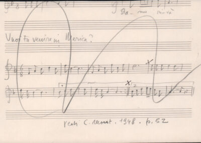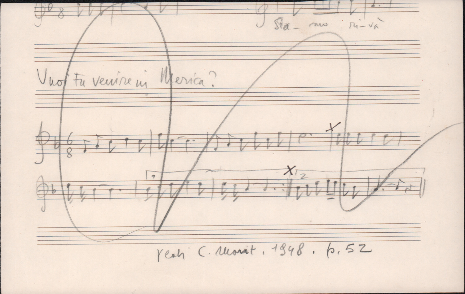 E.1.1.1 - Partitura manoscritta da Antonio Pedrotti su foglio con pentagramma, melodia senza titolo. Al verso, partitura del canto Vuoi tu venire in Merica?. 1 c.