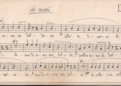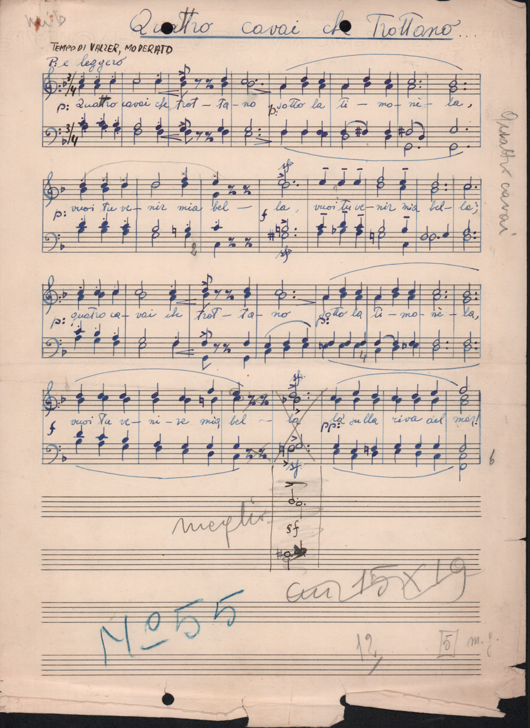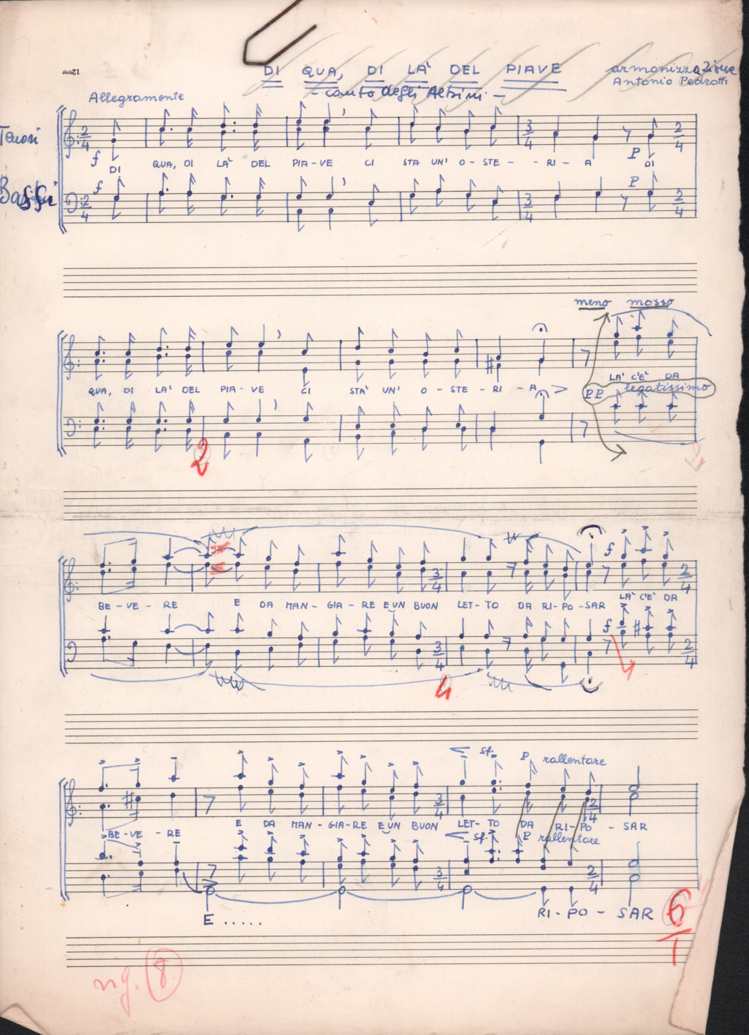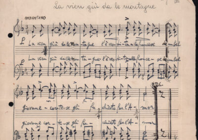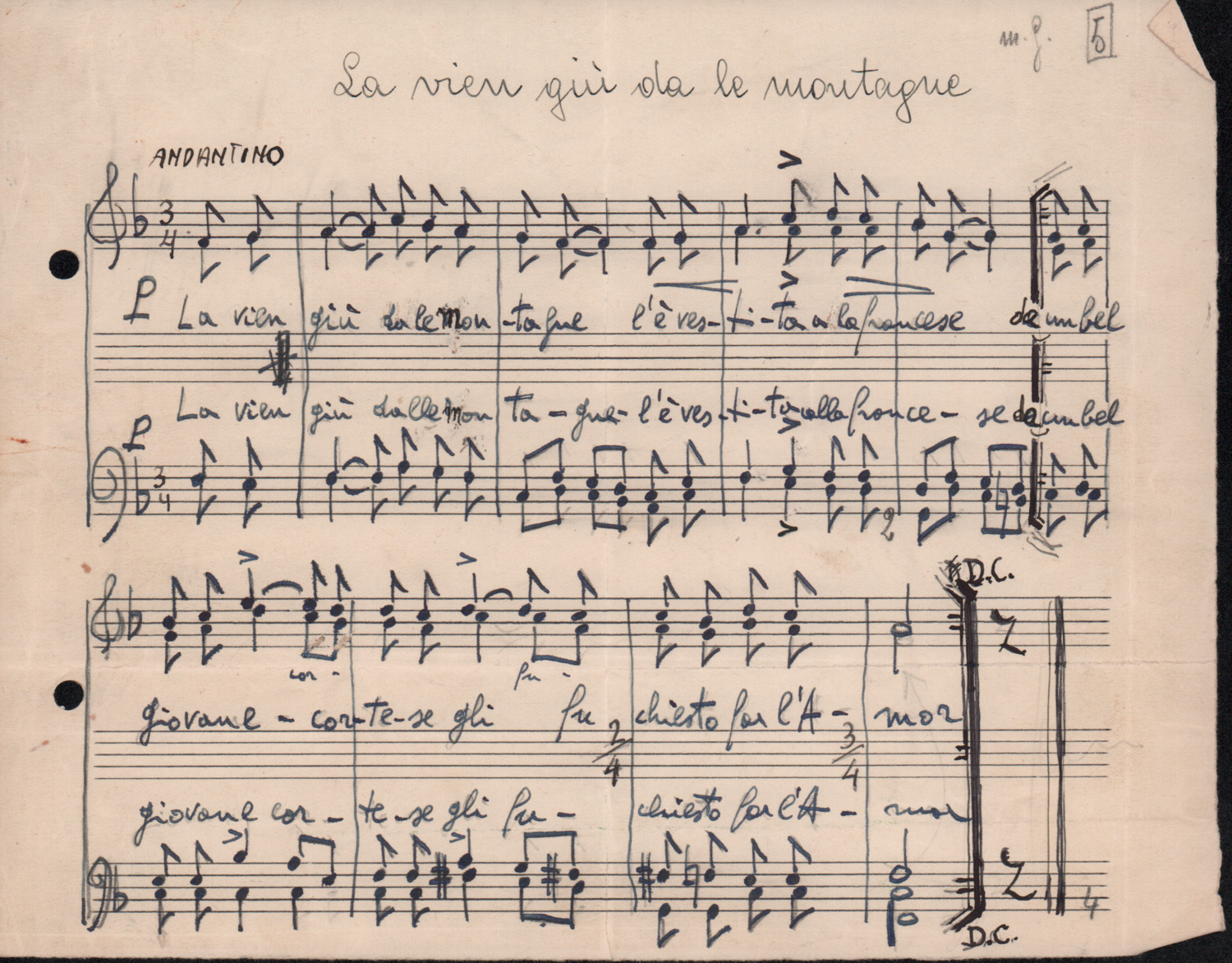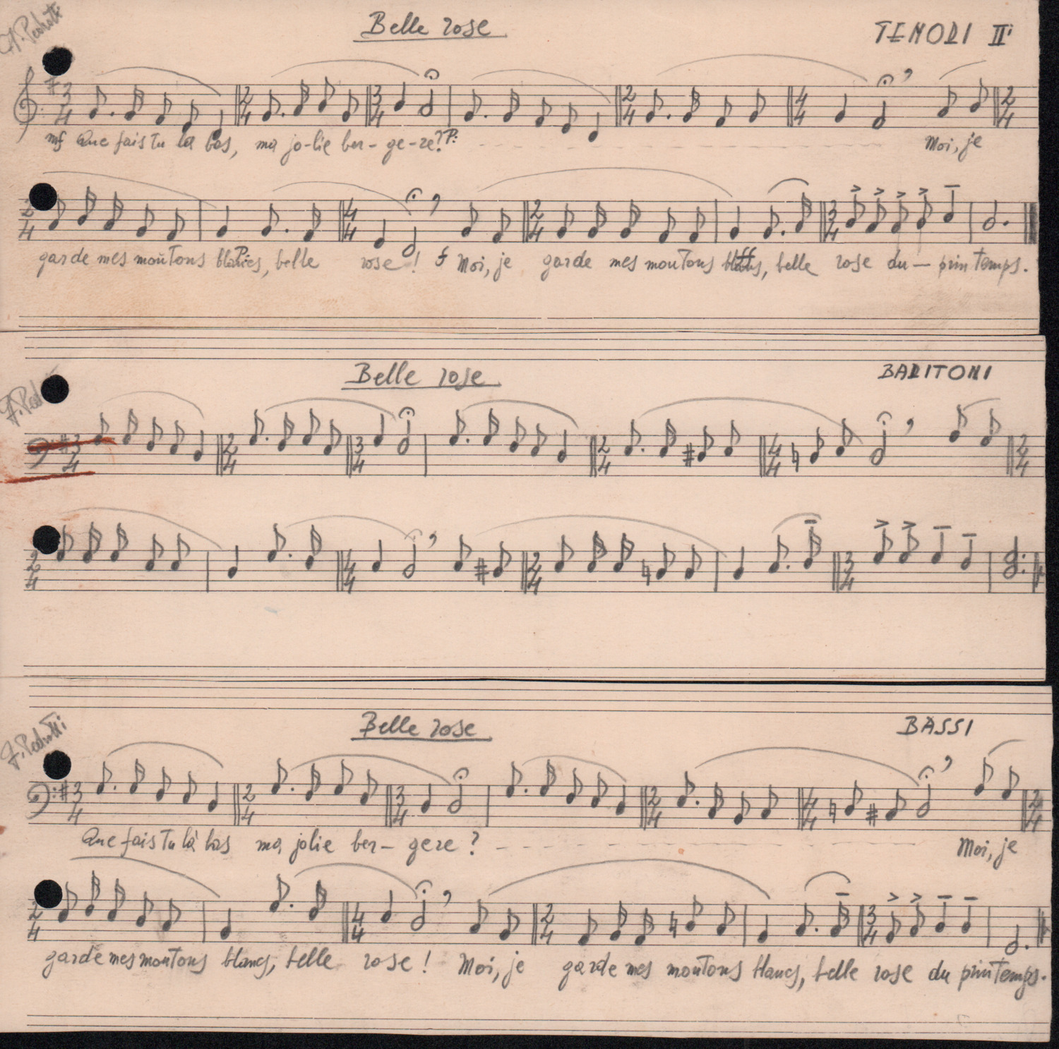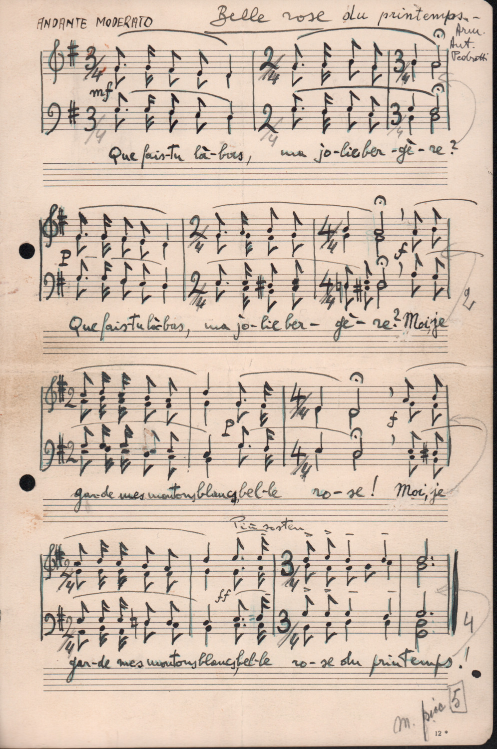 Canti armonizzati da Antonio Pedrotti. Documenti relativi all’armonizzazione di Antonio Pedrotti dei canti Il tuo fazzolettino, Son barcarol, La vien giù dalle montagne, Ta-Pum, Que fais-tu la bas (Belle rose du printemps), Di qua di là del Piave, Il tuo fazzolettino, La banda, Quattro cavai che trottano. 1946-1958. 1 fascicolo.