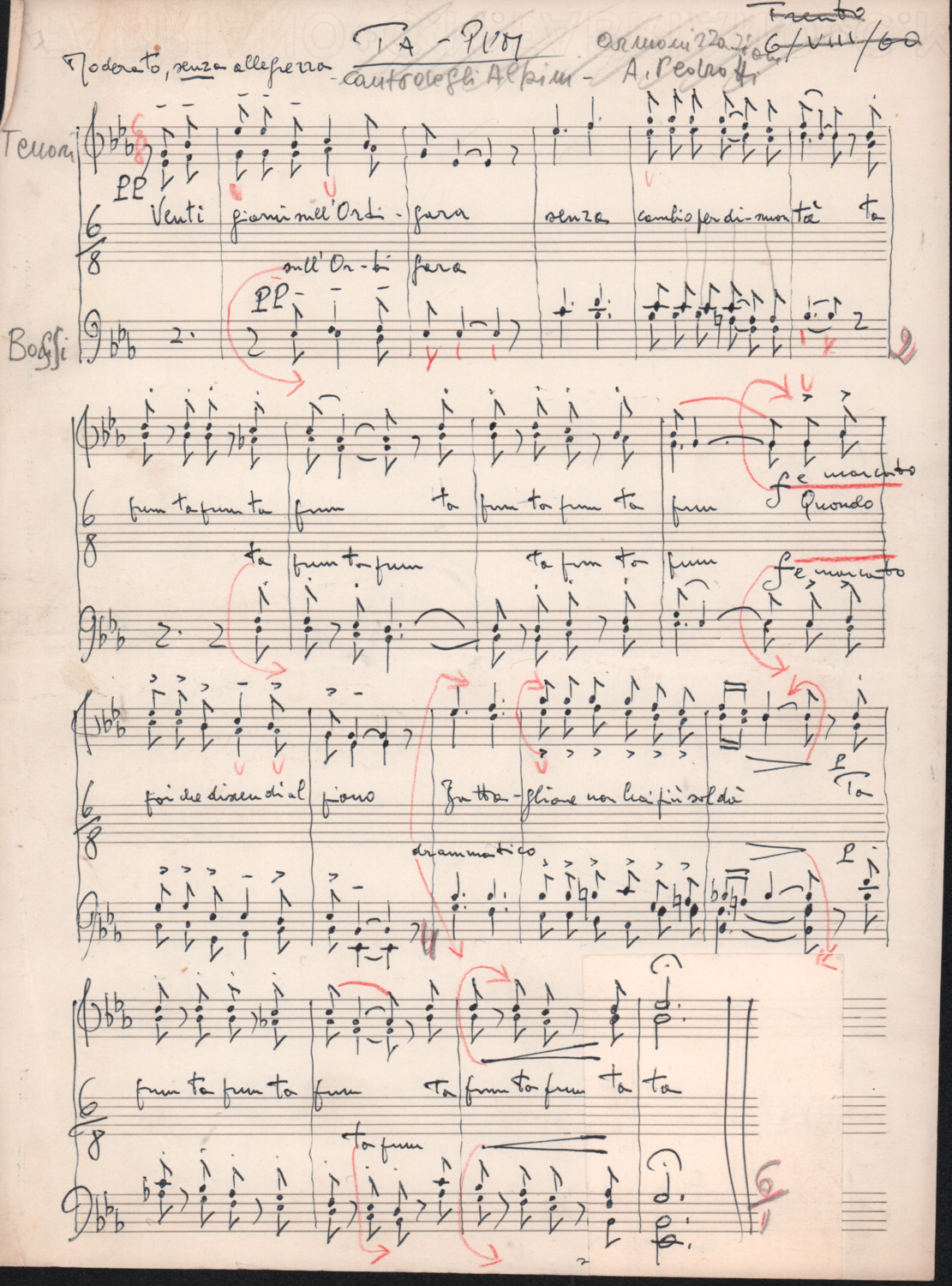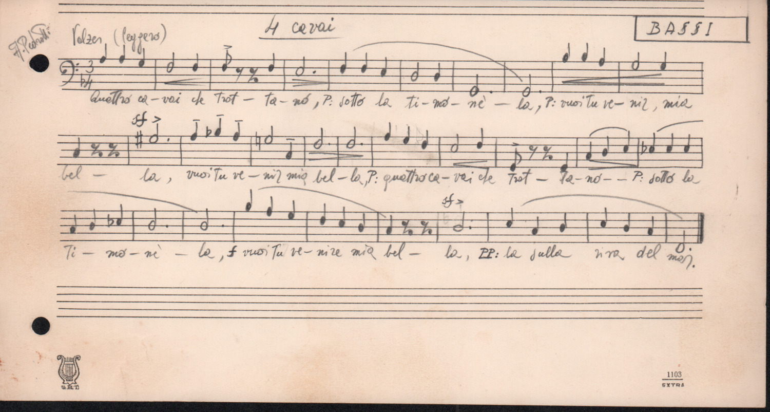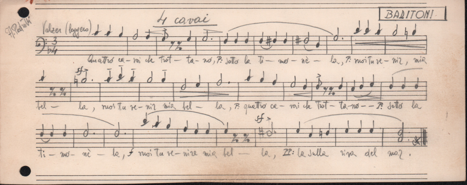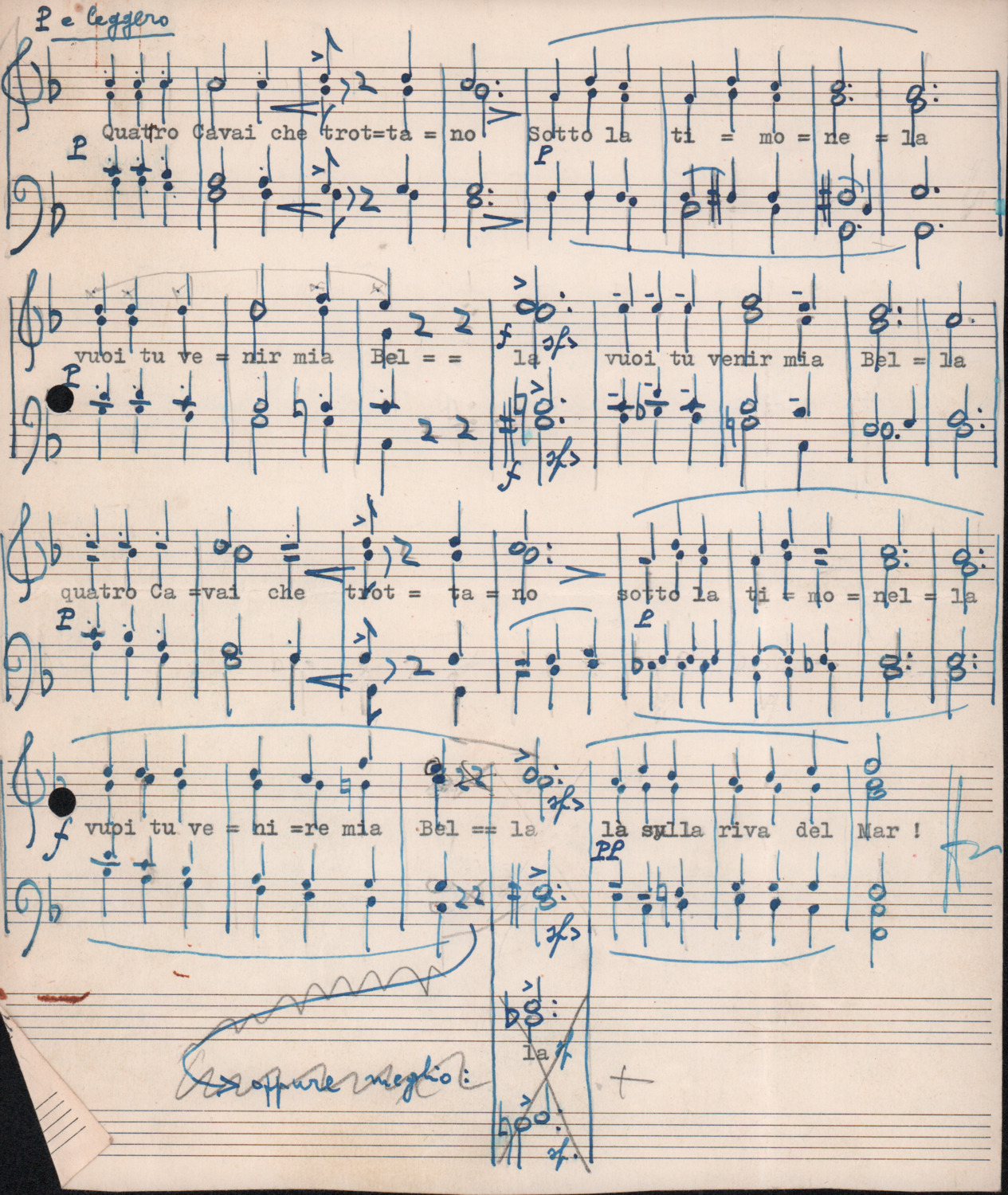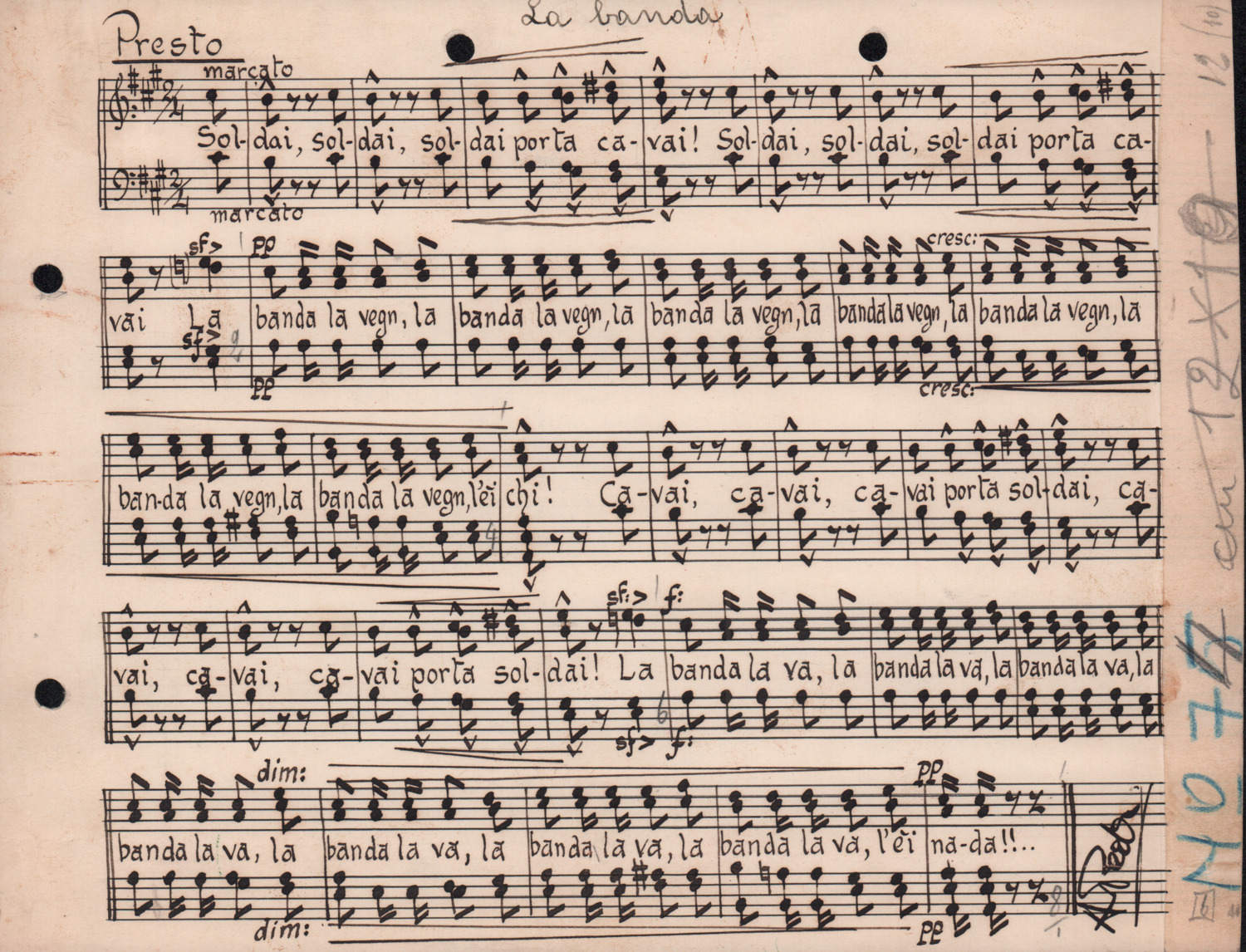 Canti armonizzati da Antonio Pedrotti. Documenti relativi all’armonizzazione di Antonio Pedrotti dei canti Il tuo fazzolettino, Son barcarol, La vien giù dalle montagne, Ta-Pum, Que fais-tu la bas (Belle rose du printemps), Di qua di là del Piave, Il tuo fazzolettino, La banda, Quattro cavai che trottano. 1946-1958. 1 fascicolo.