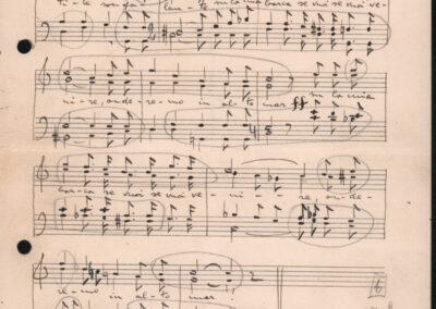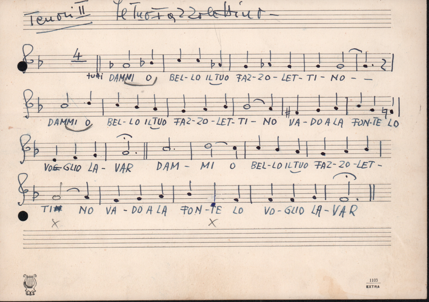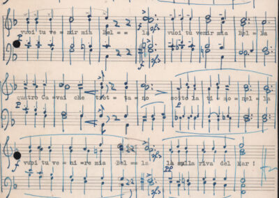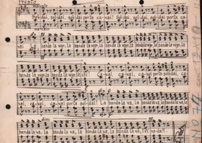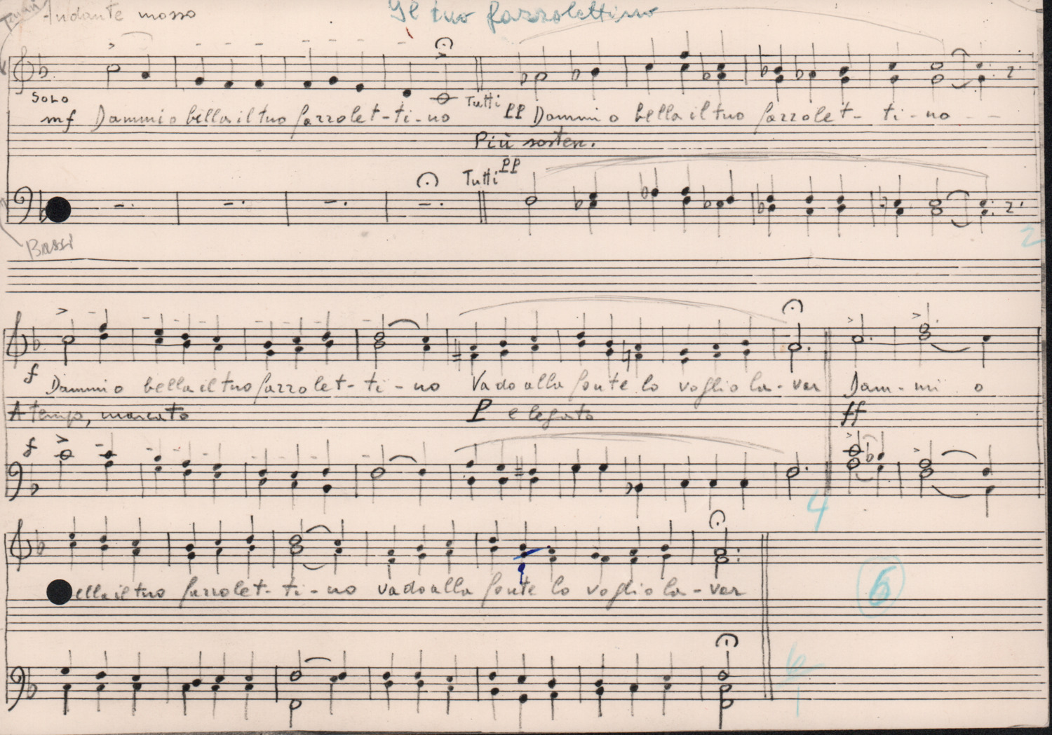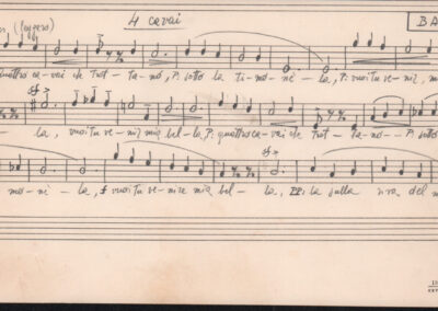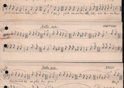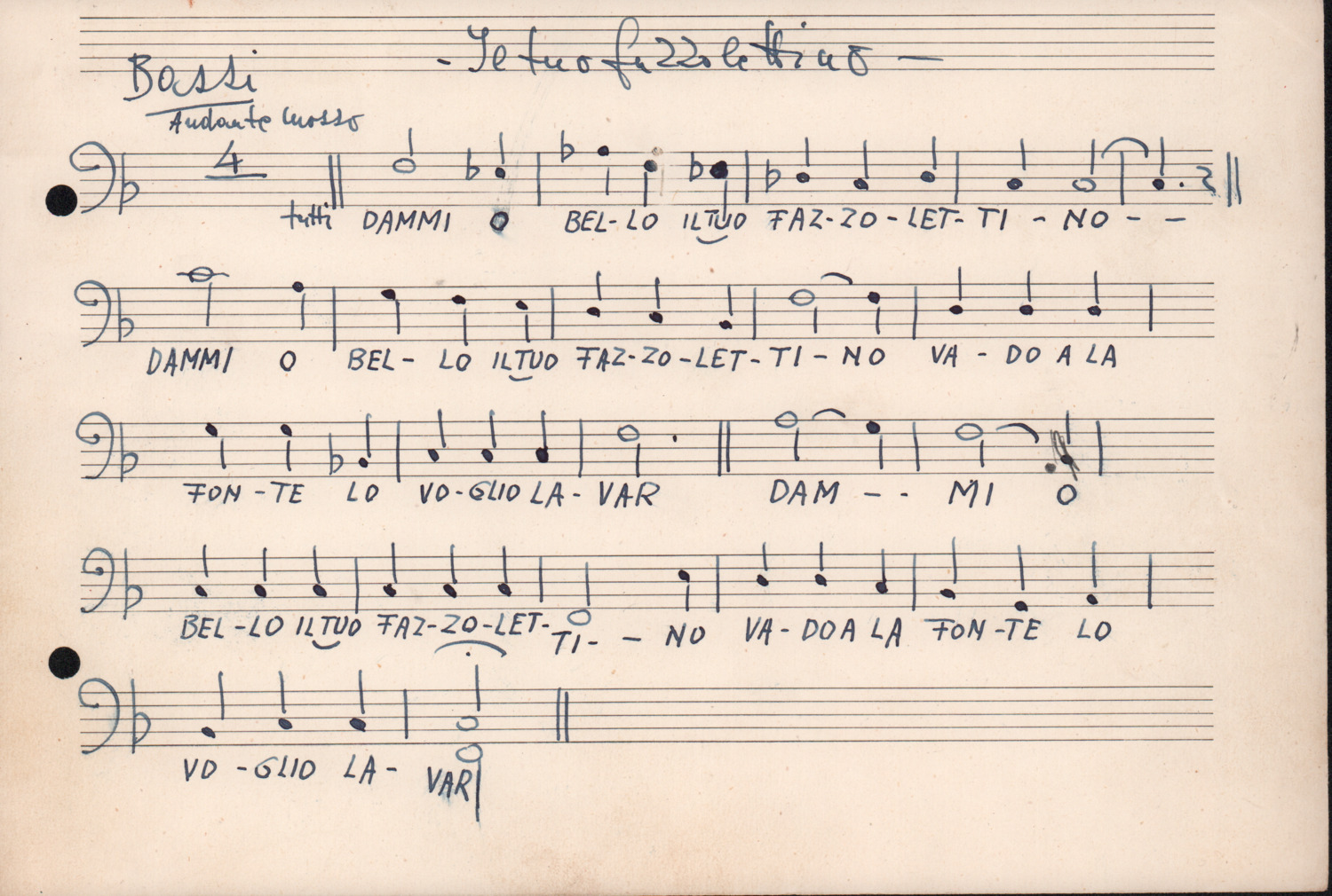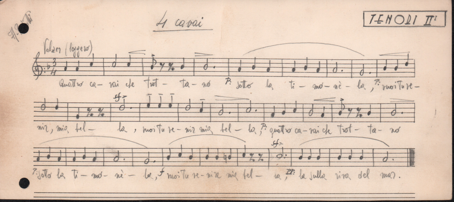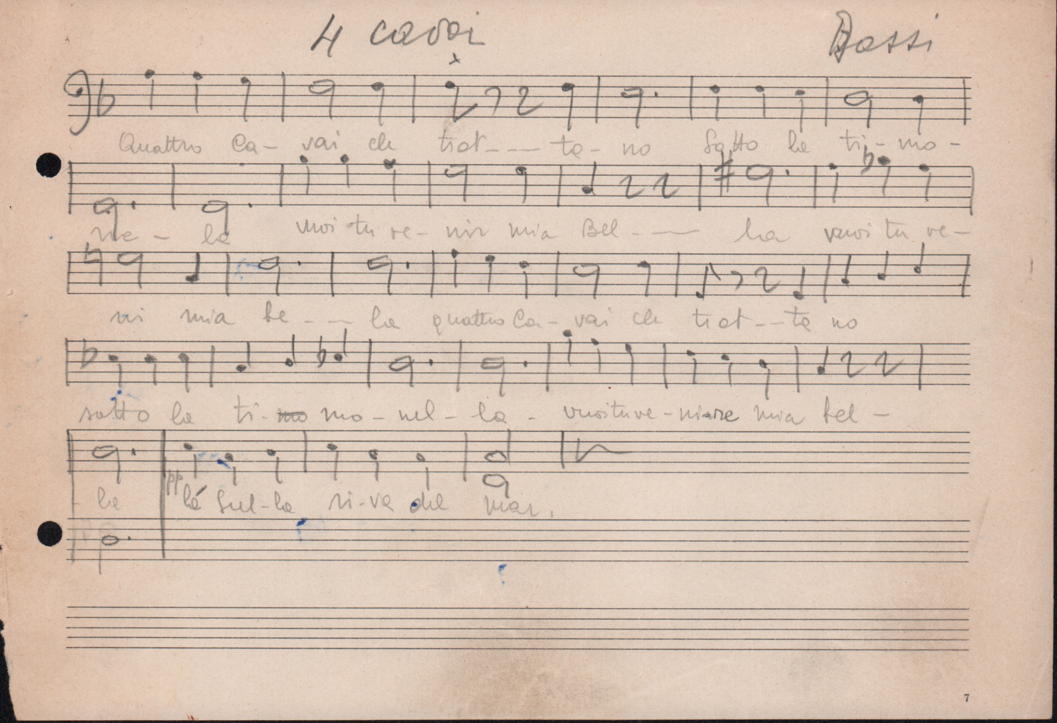 Canti armonizzati da Antonio Pedrotti. Documenti relativi all’armonizzazione di Antonio Pedrotti dei canti Il tuo fazzolettino, Son barcarol, La vien giù dalle montagne, Ta-Pum, Que fais-tu la bas (Belle rose du printemps), Di qua di là del Piave, Il tuo fazzolettino, La banda, Quattro cavai che trottano. 1946-1958. 1 fascicolo.