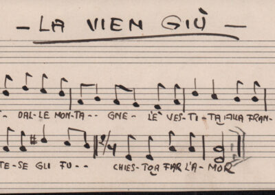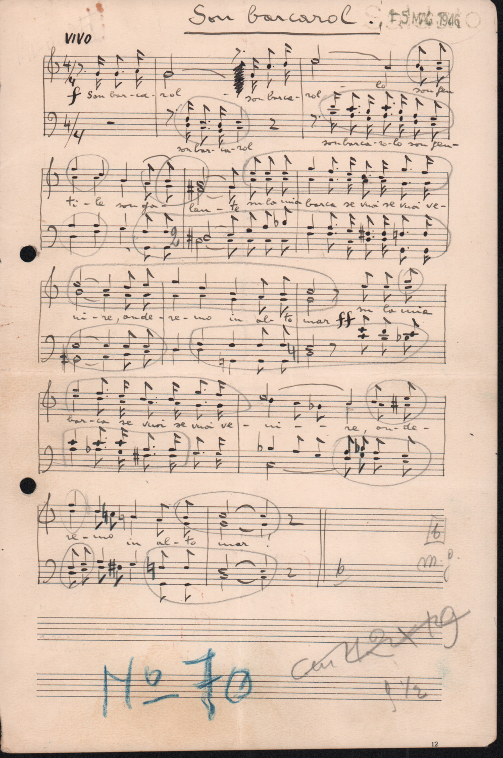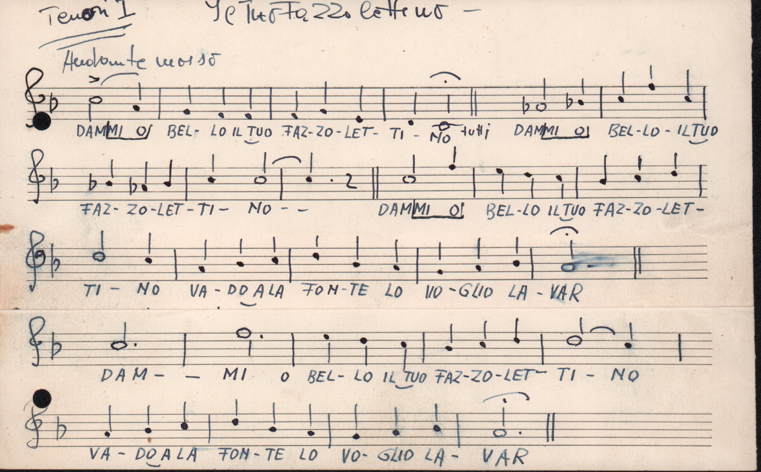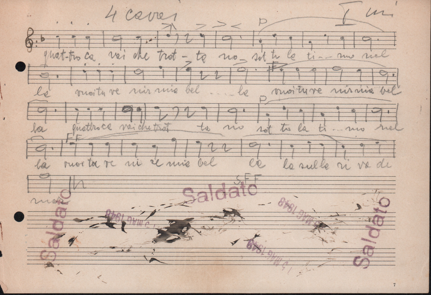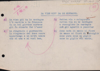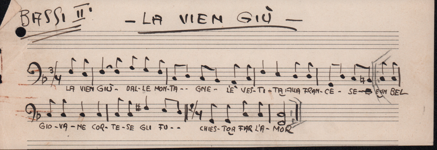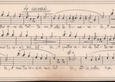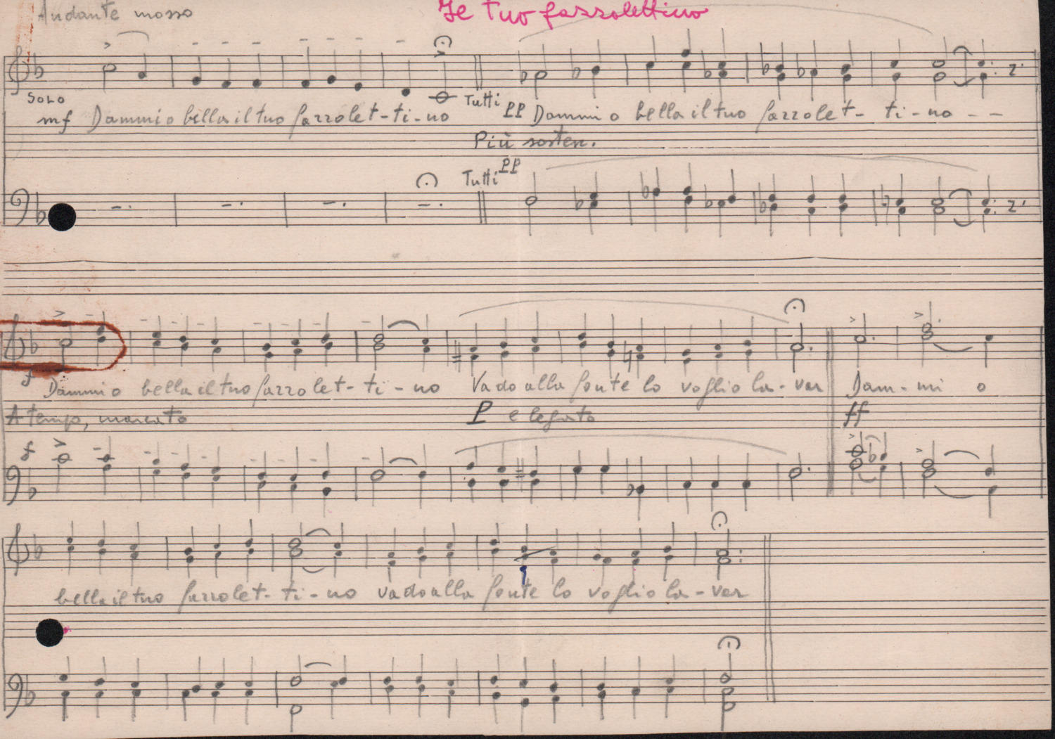 Canti armonizzati da Antonio Pedrotti. Documenti relativi all’armonizzazione di Antonio Pedrotti dei canti Il tuo fazzolettino, Son barcarol, La vien giù dalle montagne, Ta-Pum, Que fais-tu la bas (Belle rose du printemps), Di qua di là del Piave, Il tuo fazzolettino, La banda, Quattro cavai che trottano. 1946-1958. 1 fascicolo.