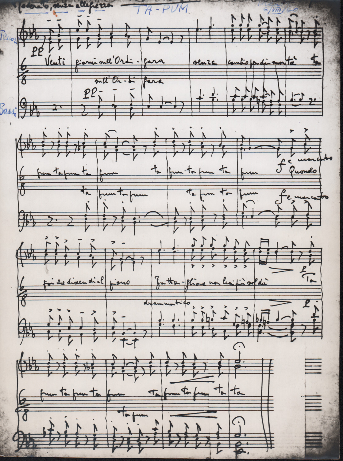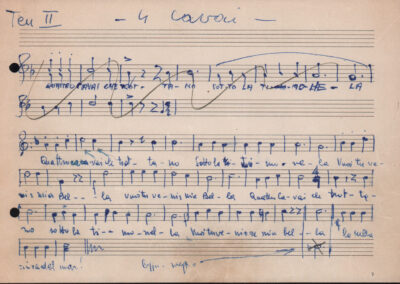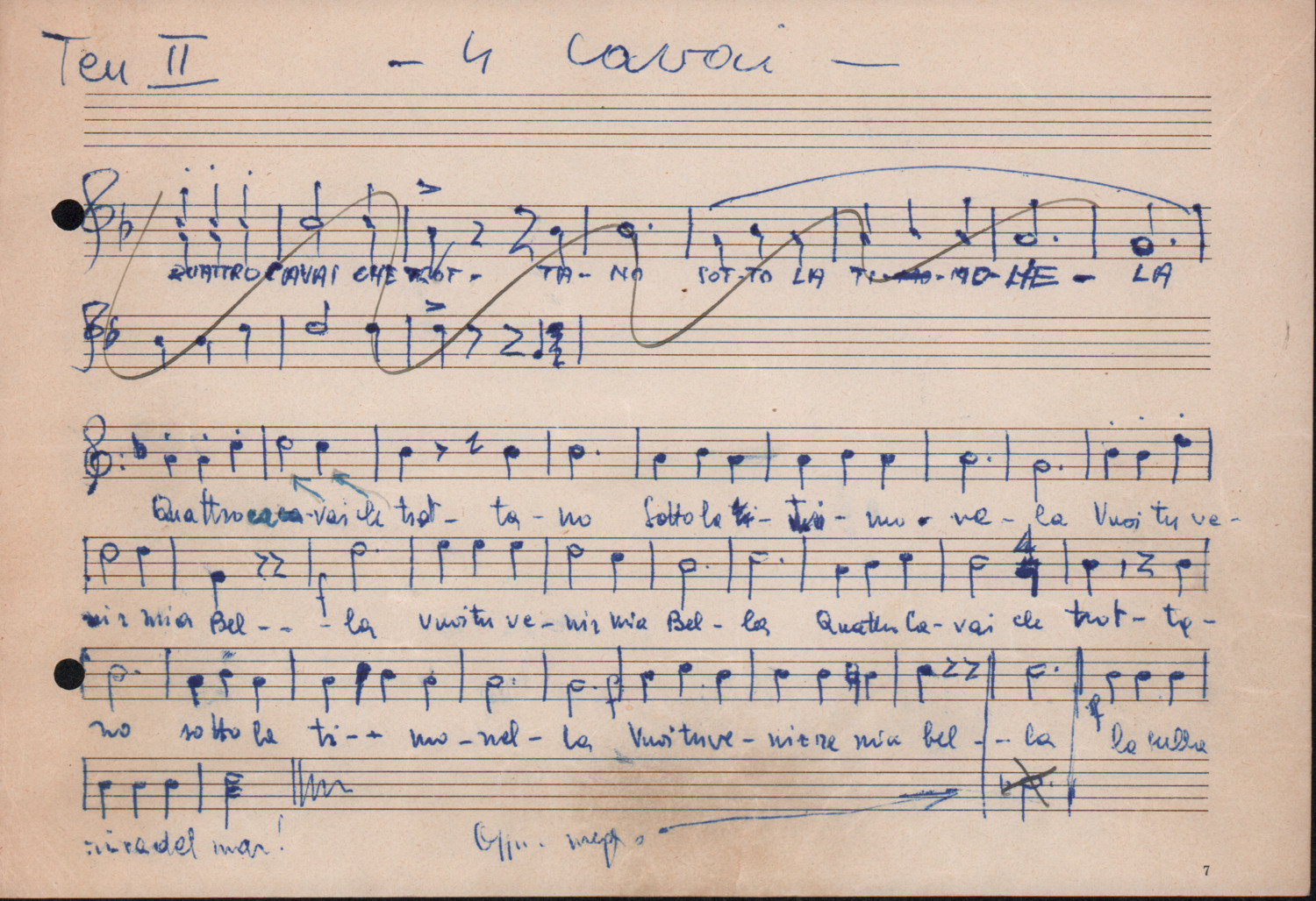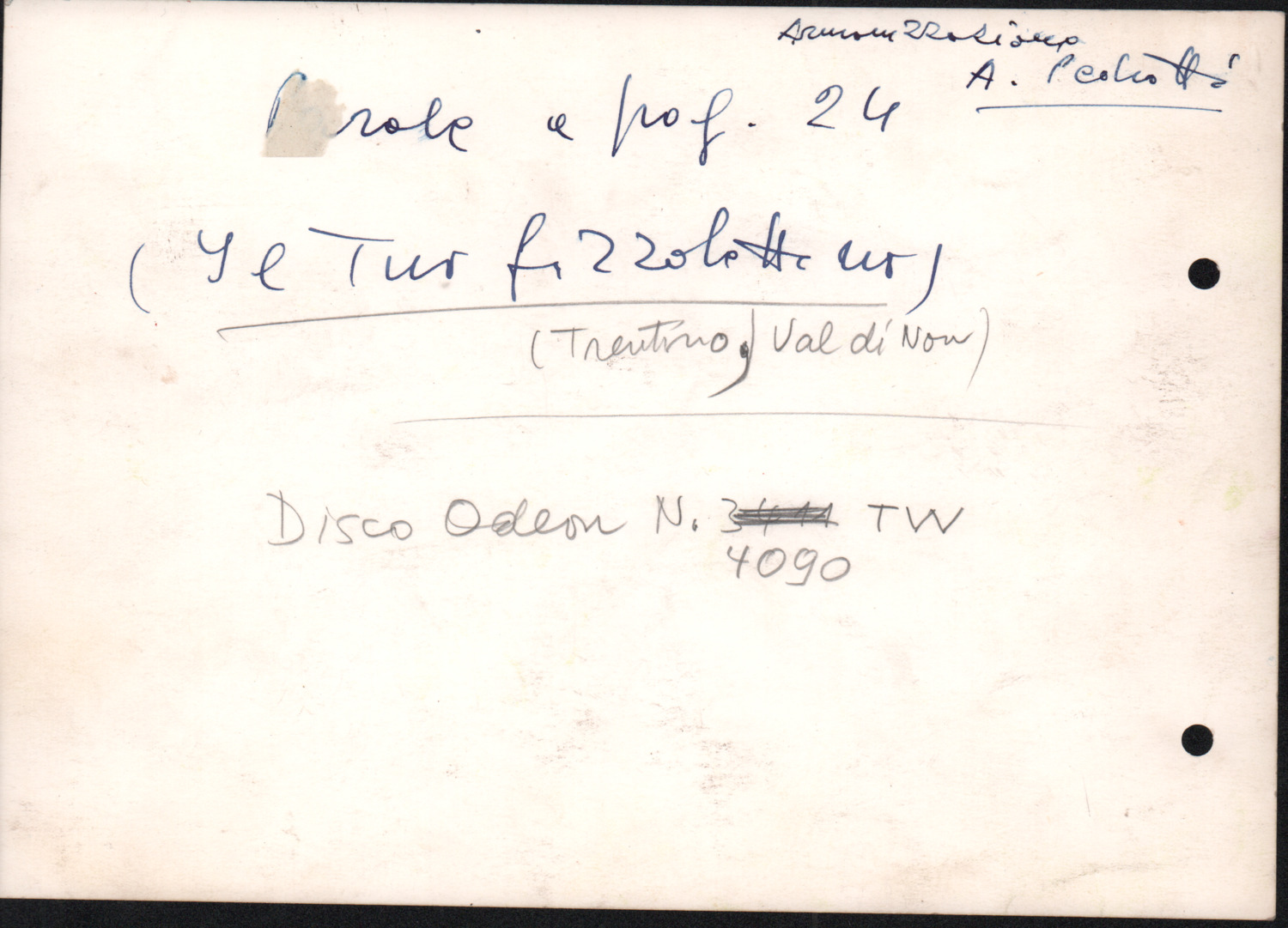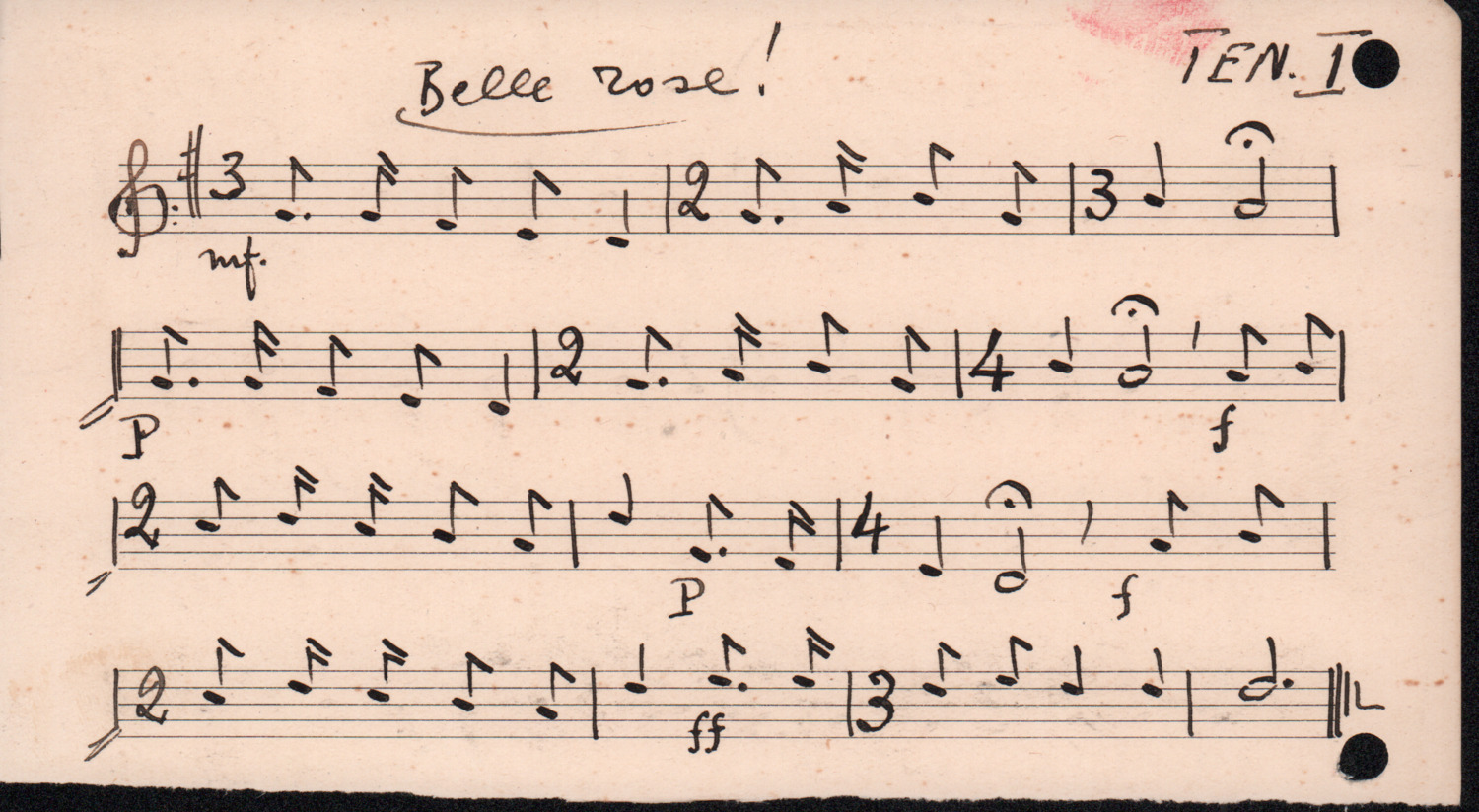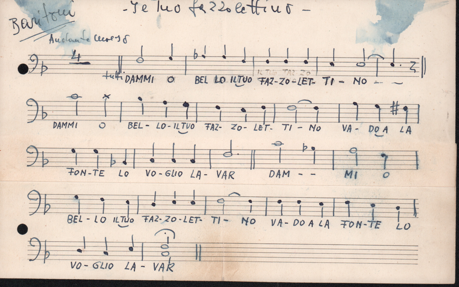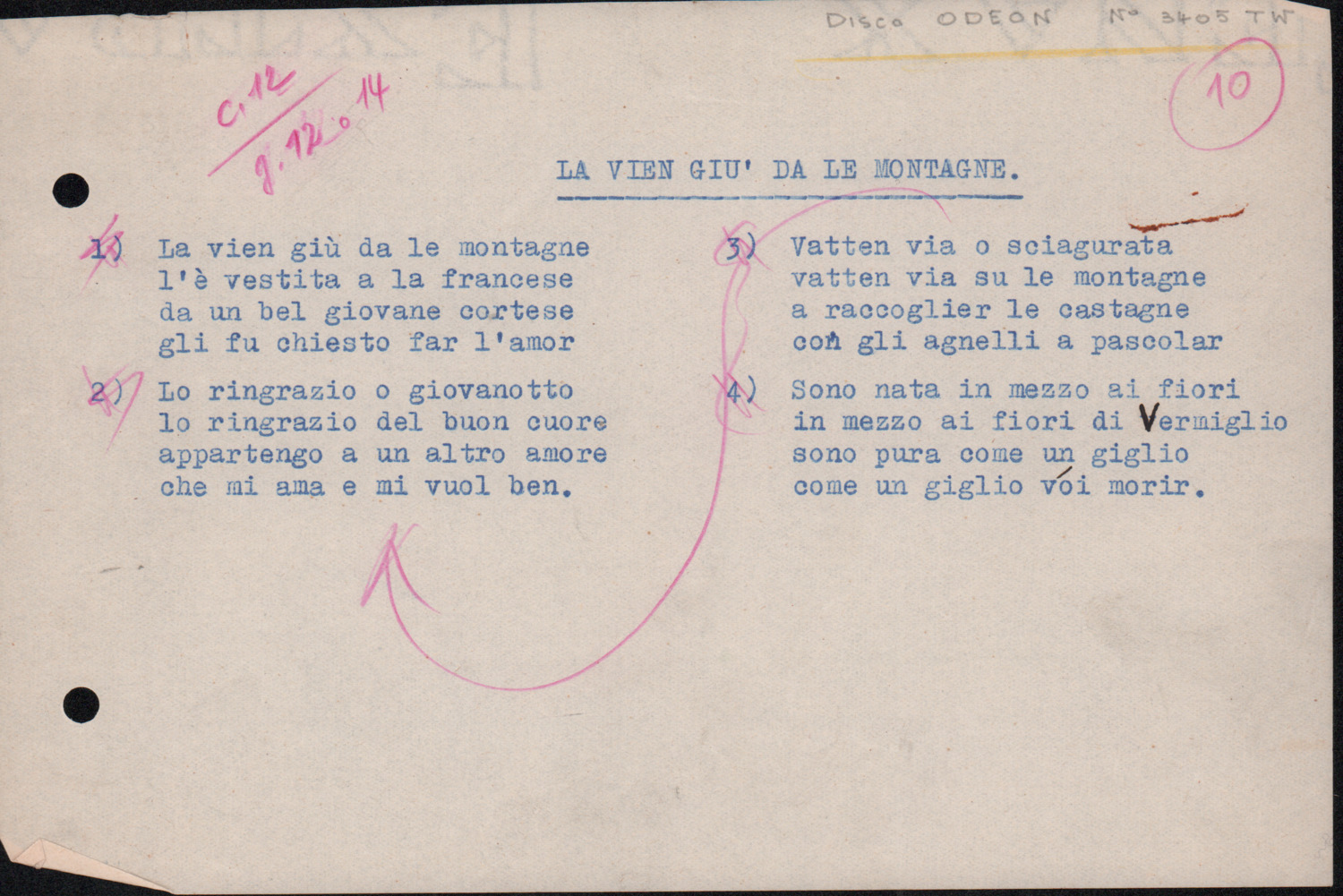 Canti armonizzati da Antonio Pedrotti. Documenti relativi all’armonizzazione di Antonio Pedrotti dei canti Il tuo fazzolettino, Son barcarol, La vien giù dalle montagne, Ta-Pum, Que fais-tu la bas (Belle rose du printemps), Di qua di là del Piave, Il tuo fazzolettino, La banda, Quattro cavai che trottano. 1946-1958. 1 fascicolo.