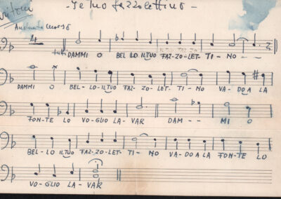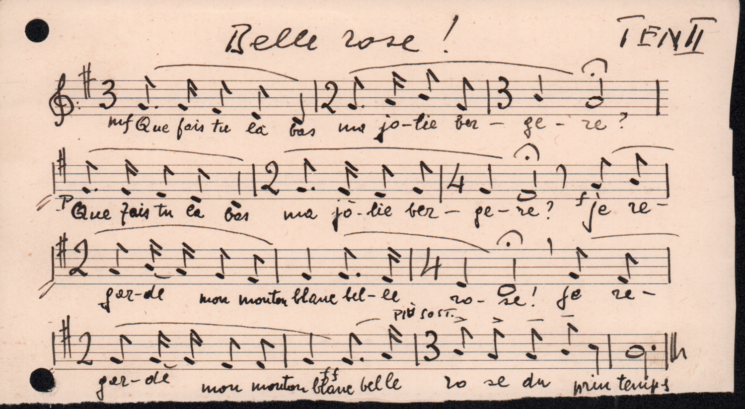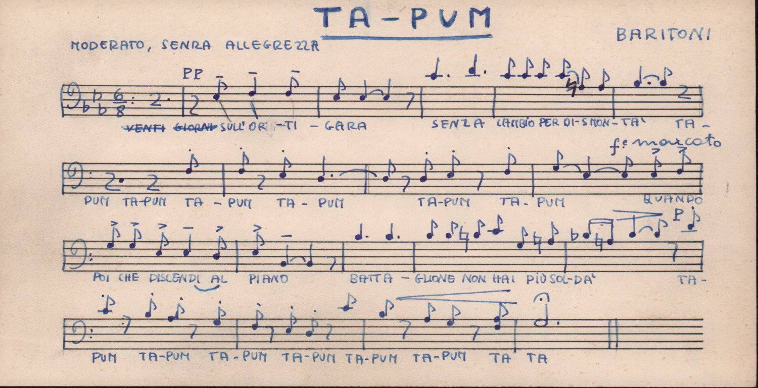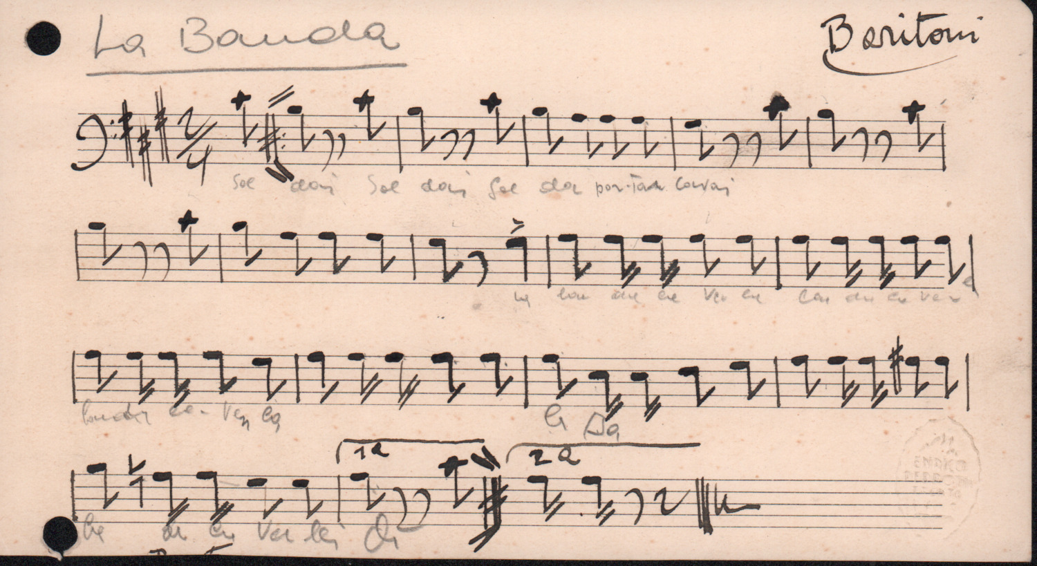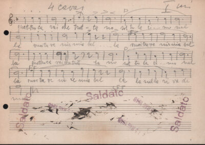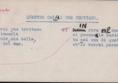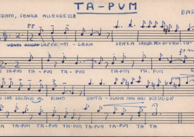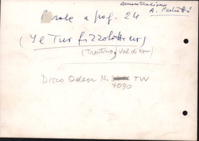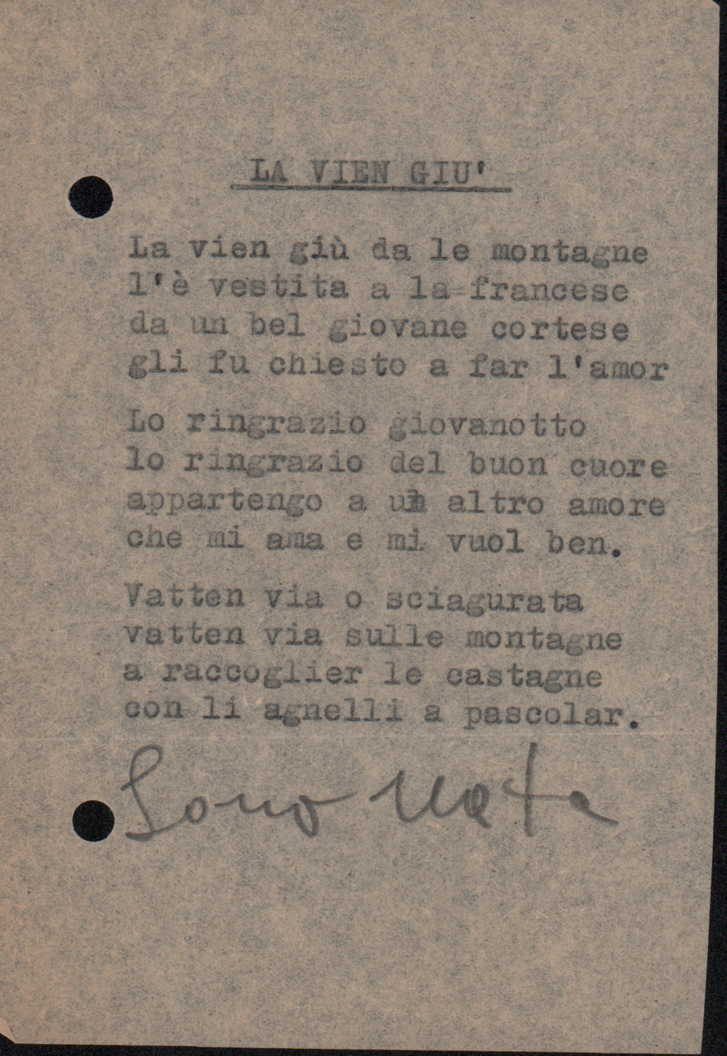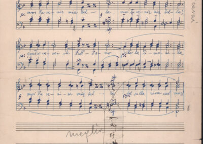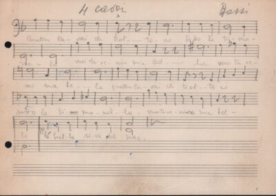 Canti armonizzati da Antonio Pedrotti. Documenti relativi all’armonizzazione di Antonio Pedrotti dei canti Il tuo fazzolettino, Son barcarol, La vien giù dalle montagne, Ta-Pum, Que fais-tu la bas (Belle rose du printemps), Di qua di là del Piave, Il tuo fazzolettino, La banda, Quattro cavai che trottano. 1946-1958. 1 fascicolo.