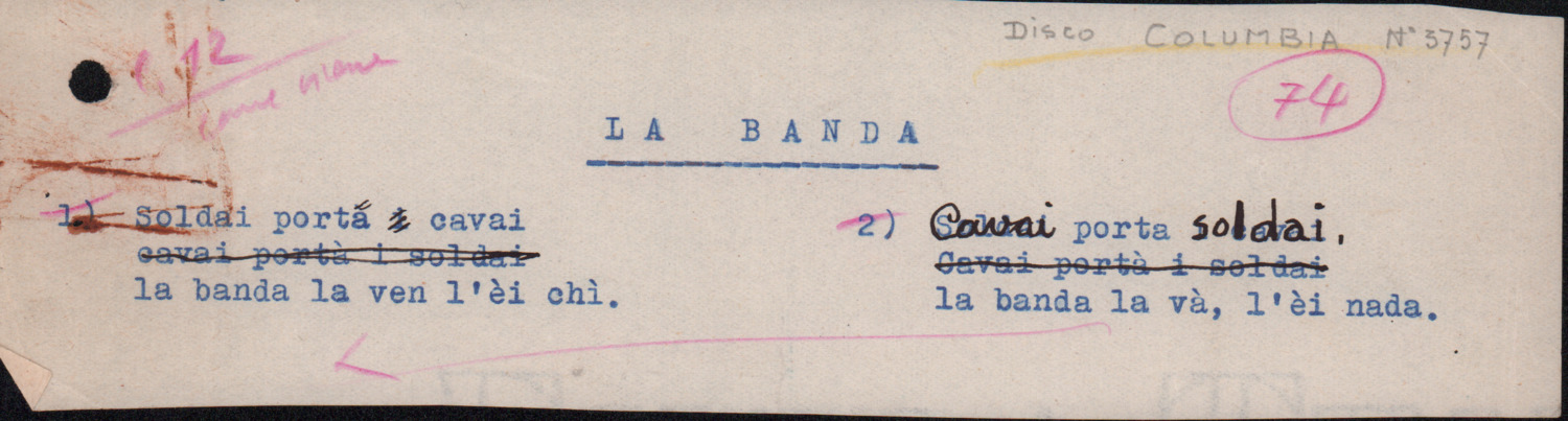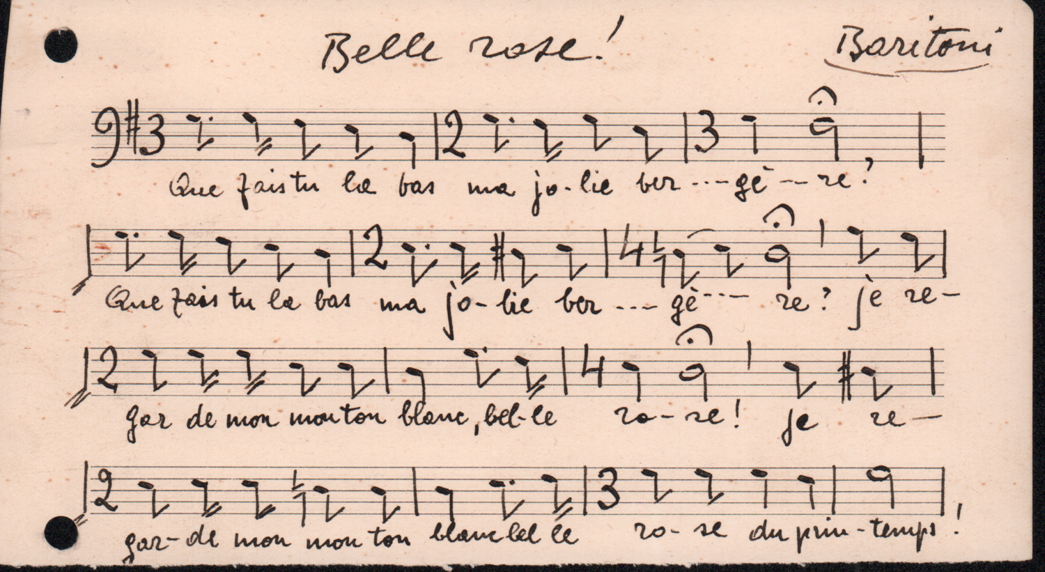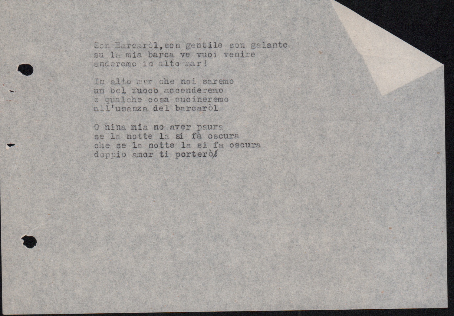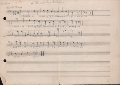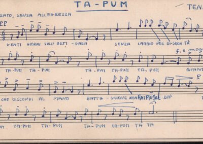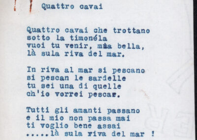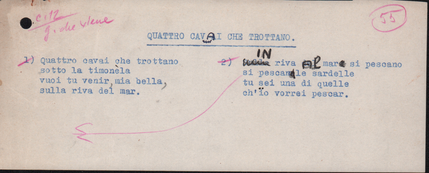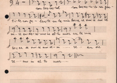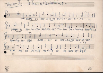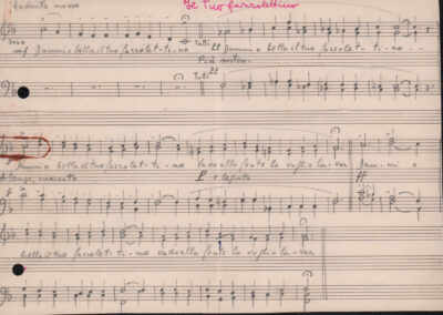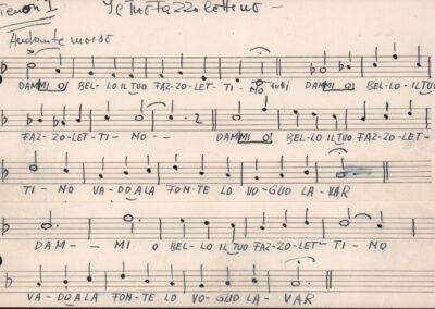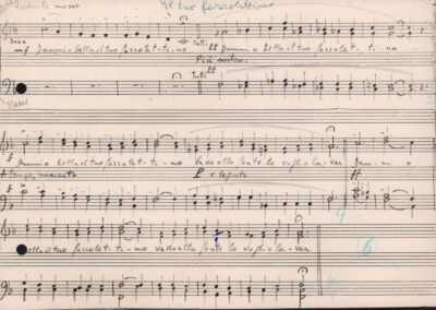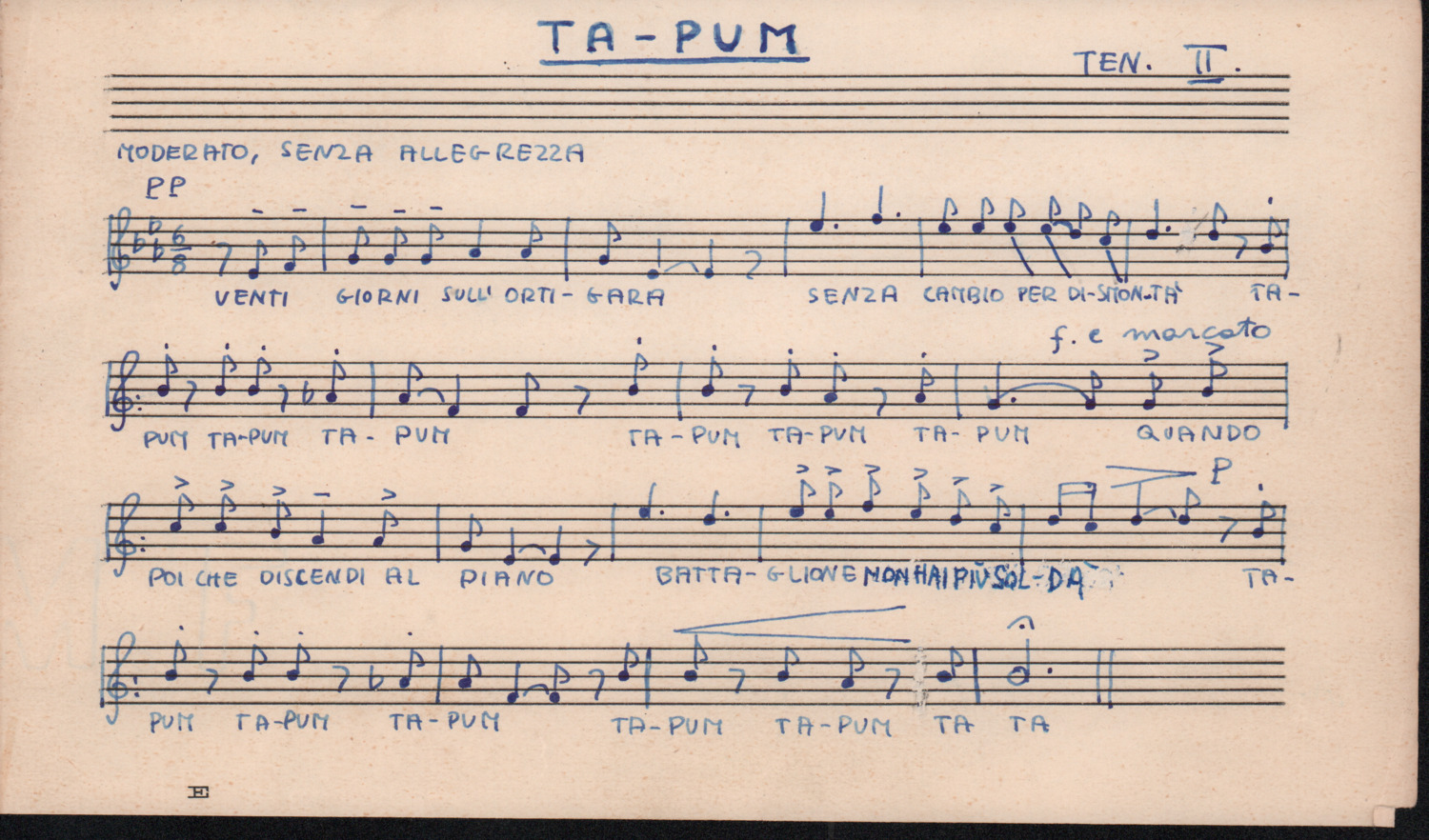 Canti armonizzati da Antonio Pedrotti. Documenti relativi all’armonizzazione di Antonio Pedrotti dei canti Il tuo fazzolettino, Son barcarol, La vien giù dalle montagne, Ta-Pum, Que fais-tu la bas (Belle rose du printemps), Di qua di là del Piave, Il tuo fazzolettino, La banda, Quattro cavai che trottano. 1946-1958. 1 fascicolo.