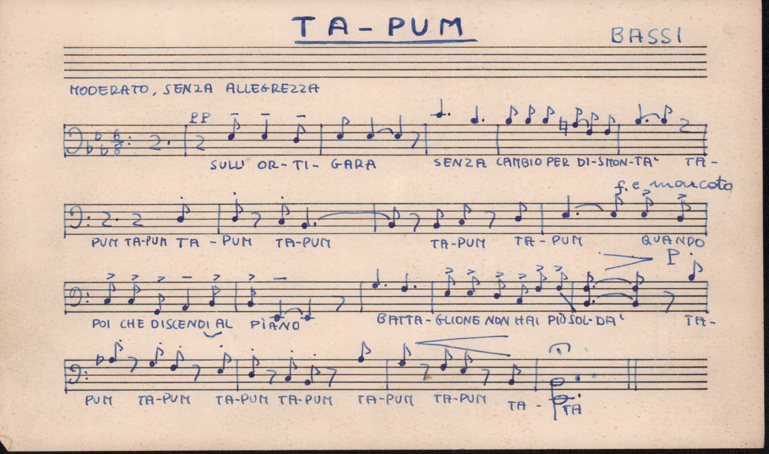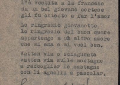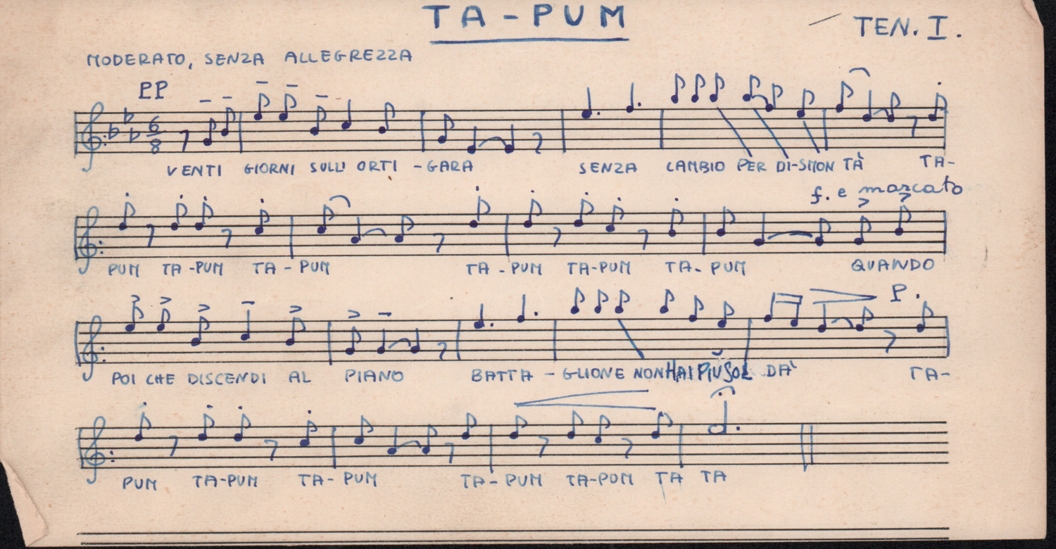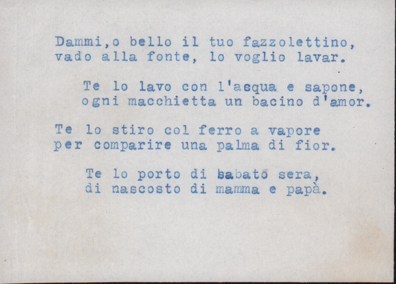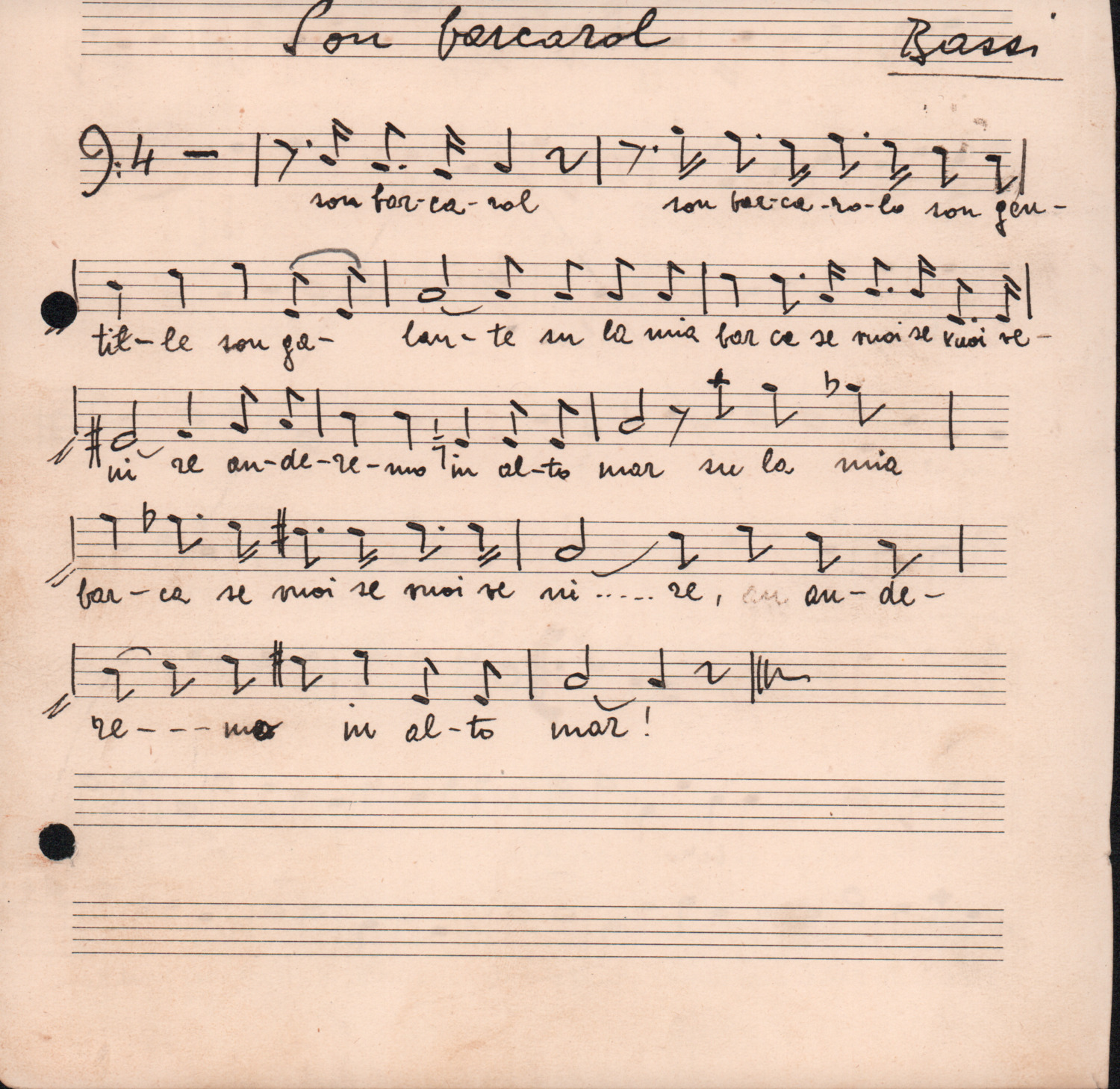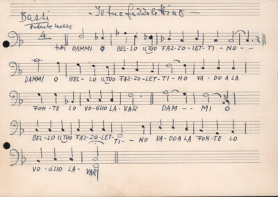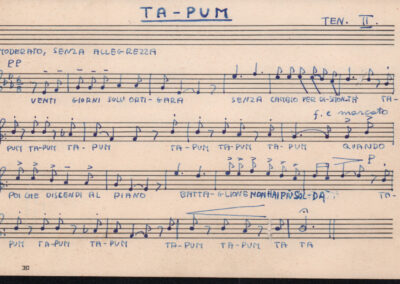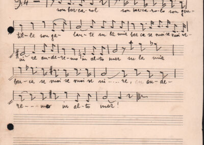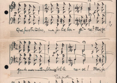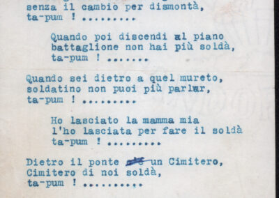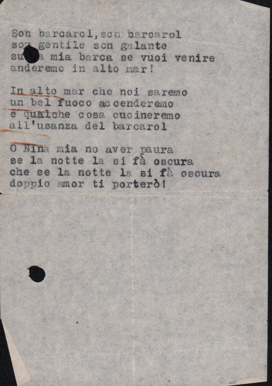 Canti armonizzati da Antonio Pedrotti. Documenti relativi all’armonizzazione di Antonio Pedrotti dei canti Il tuo fazzolettino, Son barcarol, La vien giù dalle montagne, Ta-Pum, Que fais-tu la bas (Belle rose du printemps), Di qua di là del Piave, Il tuo fazzolettino, La banda, Quattro cavai che trottano. 1946-1958. 1 fascicolo.