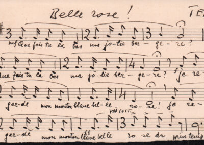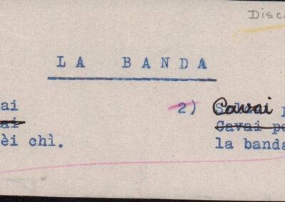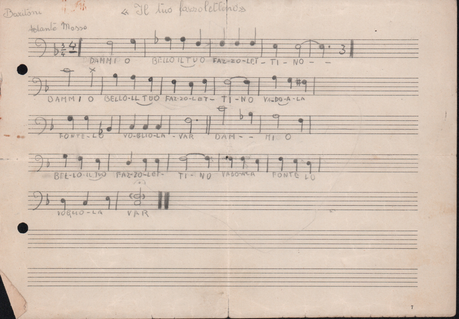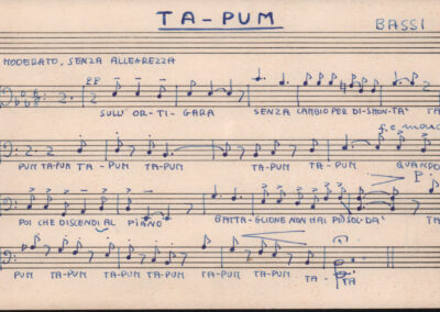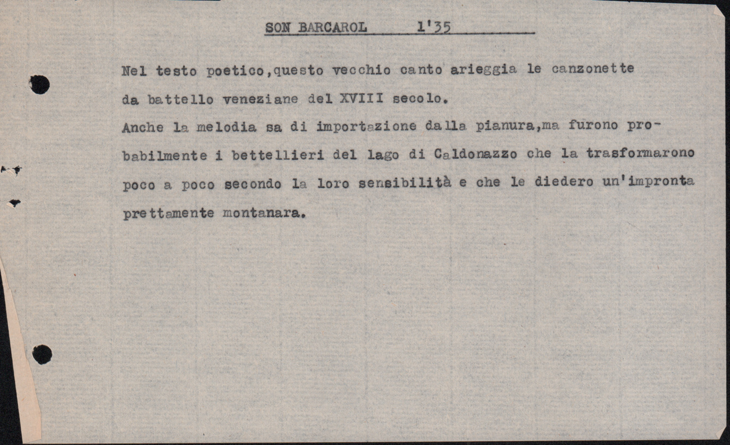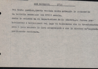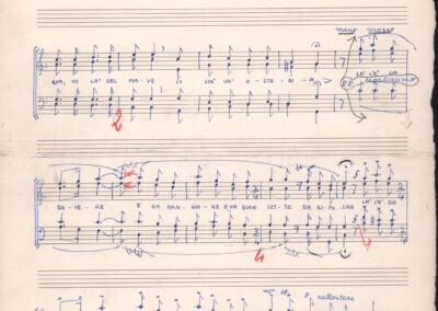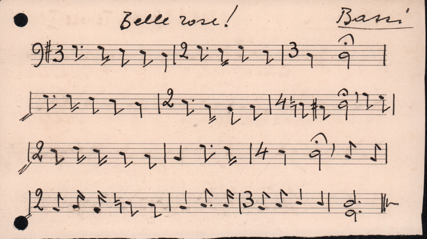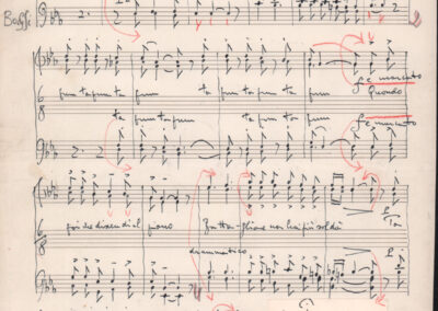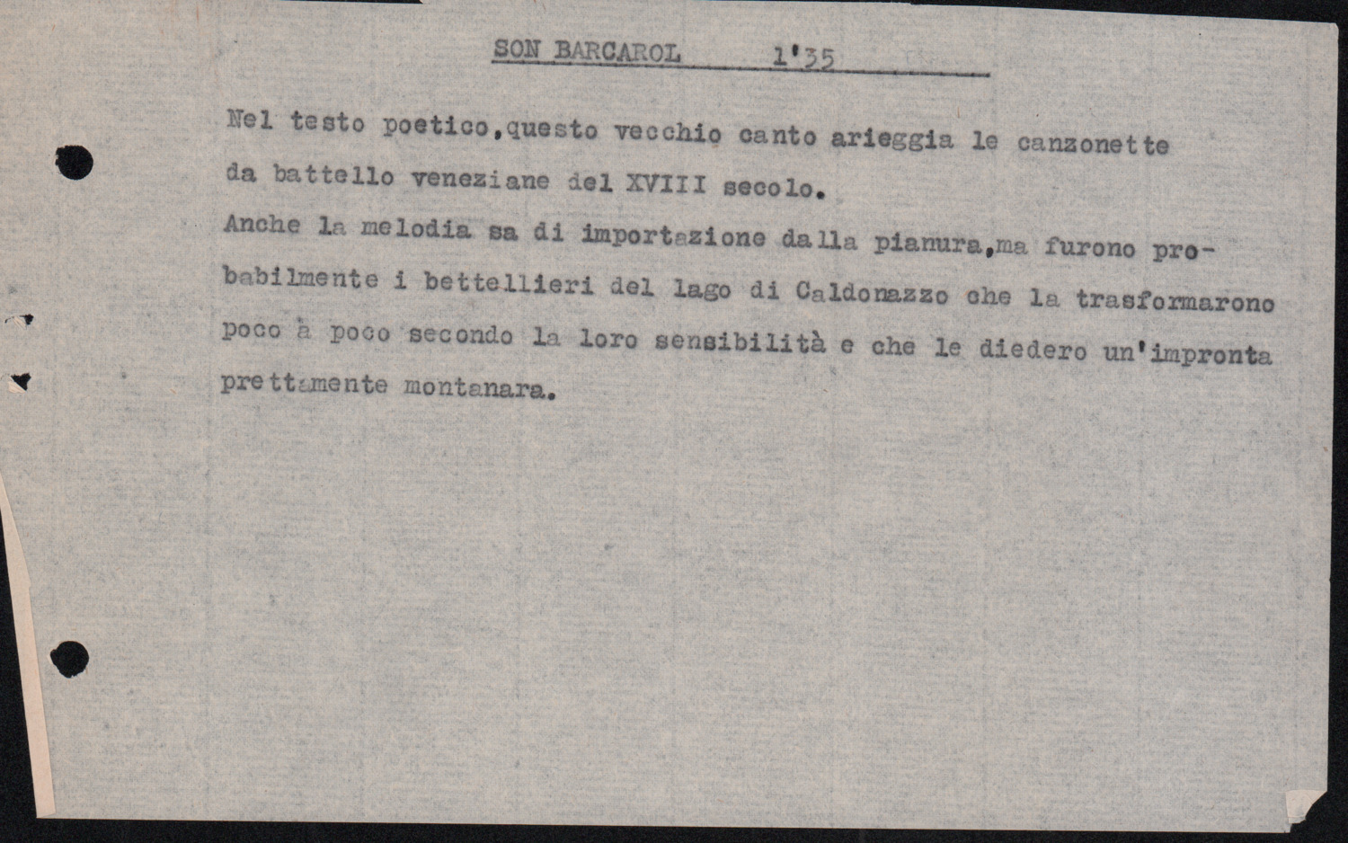 Canti armonizzati da Antonio Pedrotti. Documenti relativi all’armonizzazione di Antonio Pedrotti dei canti Il tuo fazzolettino, Son barcarol, La vien giù dalle montagne, Ta-Pum, Que fais-tu la bas (Belle rose du printemps), Di qua di là del Piave, Il tuo fazzolettino, La banda, Quattro cavai che trottano. 1946-1958. 1 fascicolo.