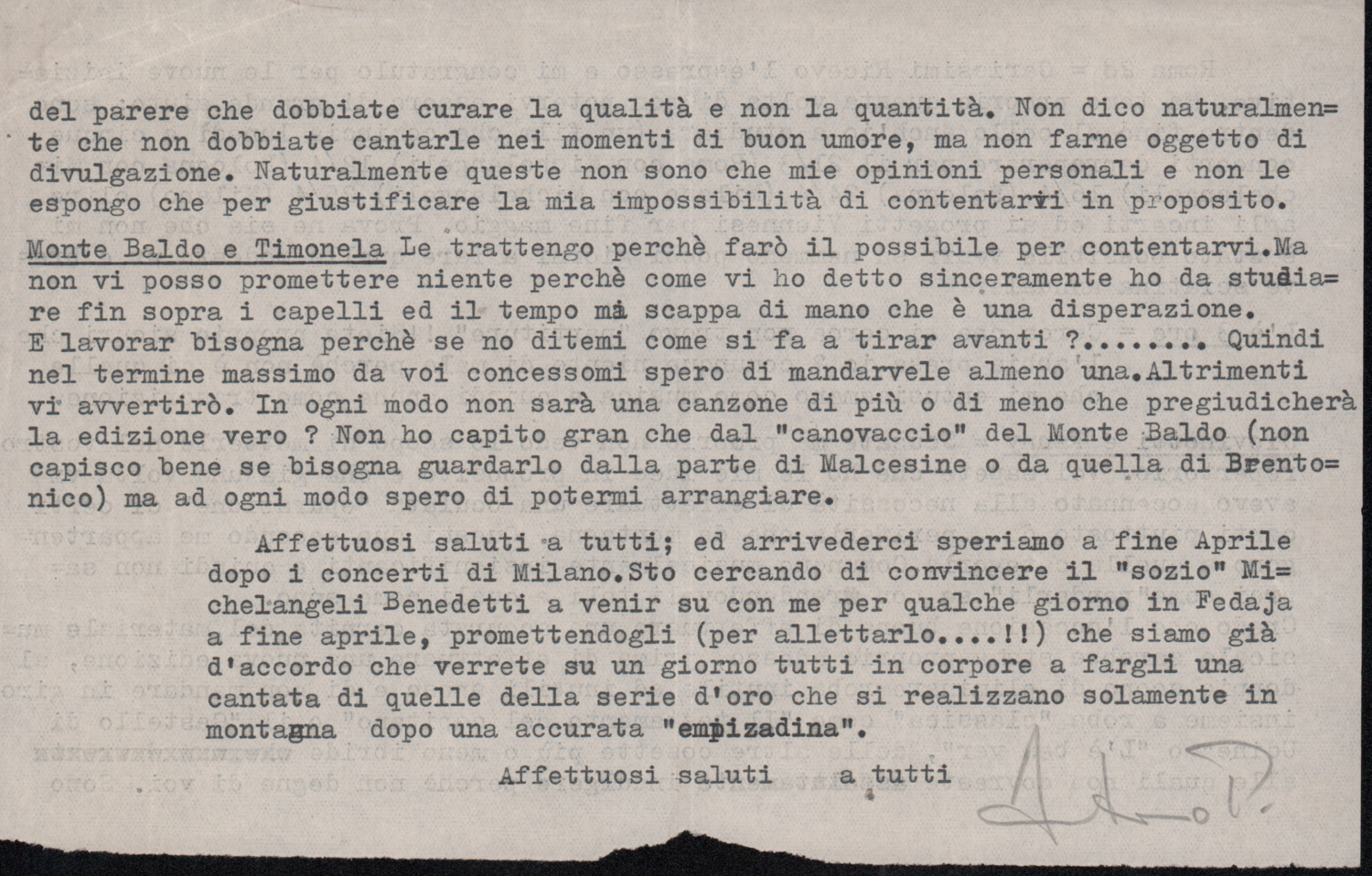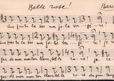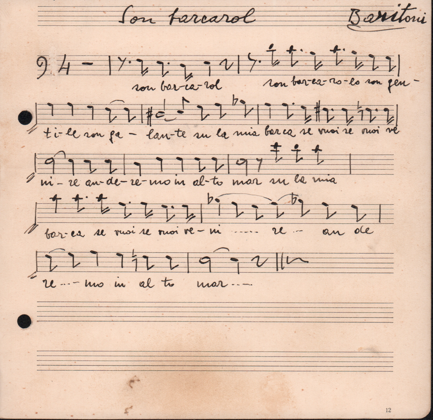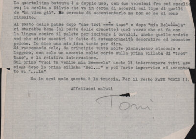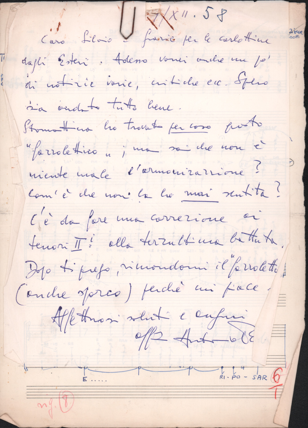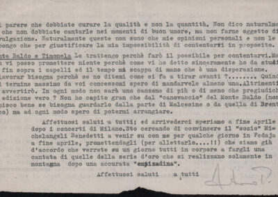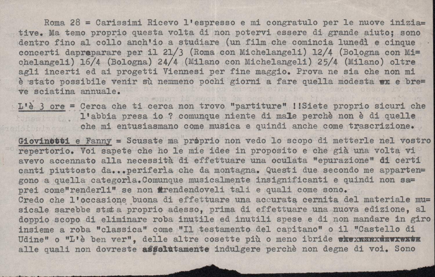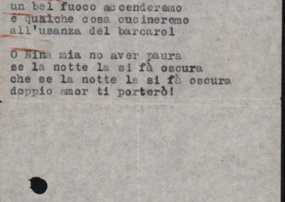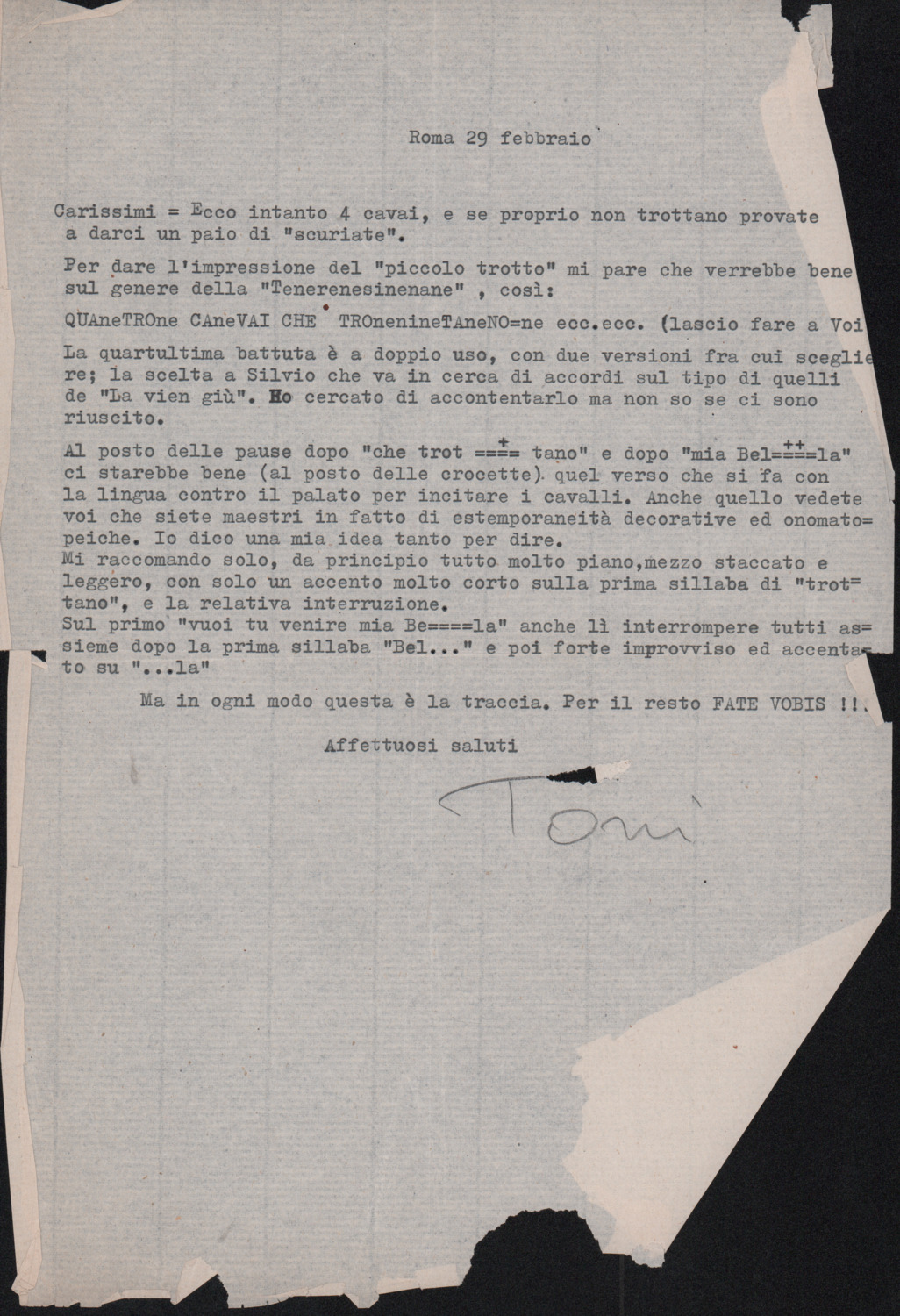 Canti armonizzati da Antonio Pedrotti. Documenti relativi all’armonizzazione di Antonio Pedrotti dei canti Il tuo fazzolettino, Son barcarol, La vien giù dalle montagne, Ta-Pum, Que fais-tu la bas (Belle rose du printemps), Di qua di là del Piave, Il tuo fazzolettino, La banda, Quattro cavai che trottano. 1946-1958. 1 fascicolo.