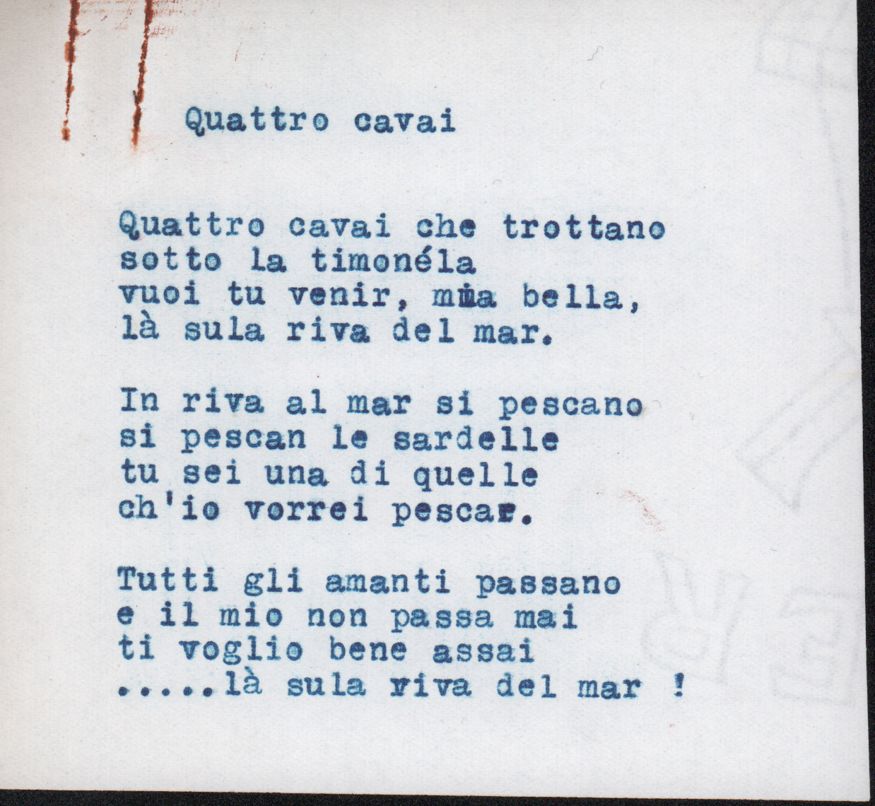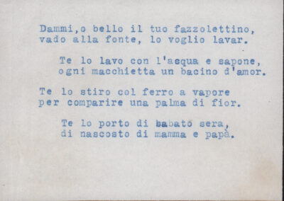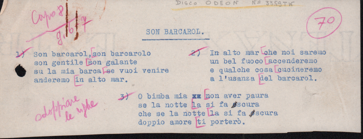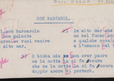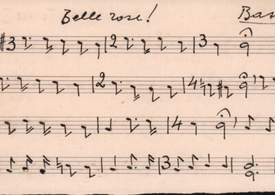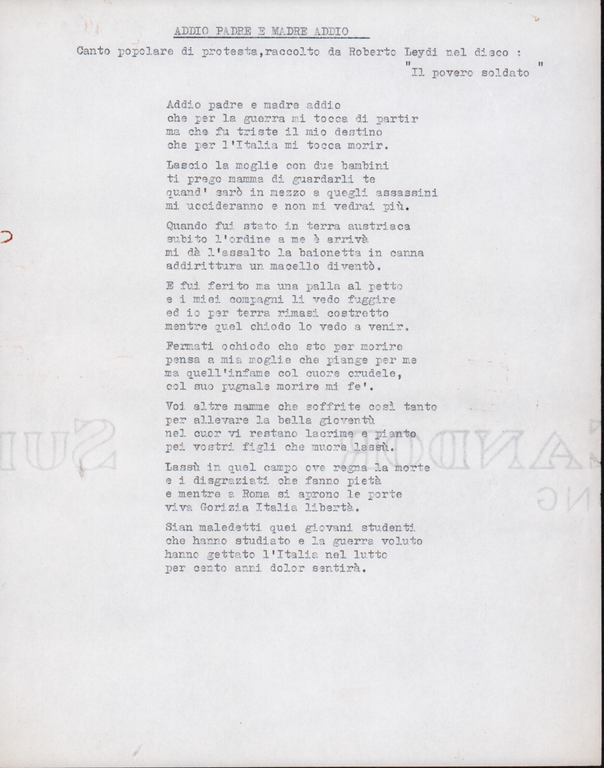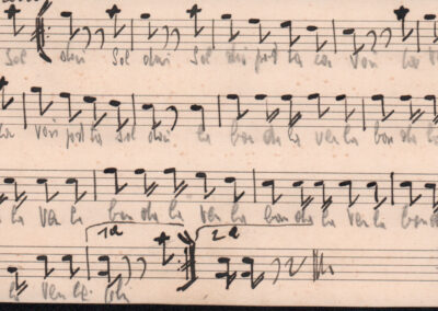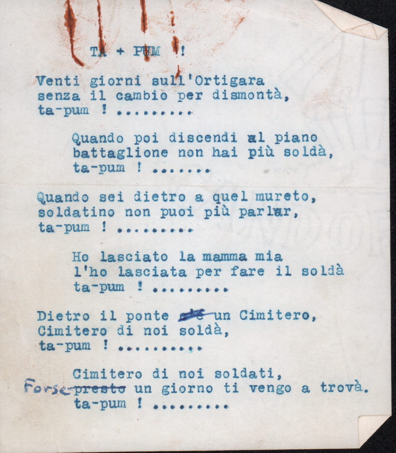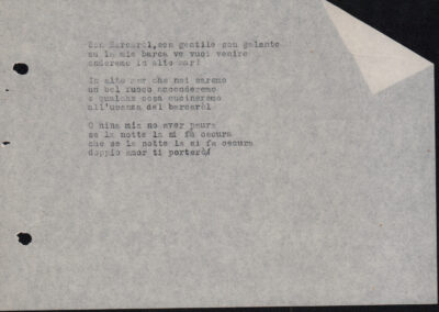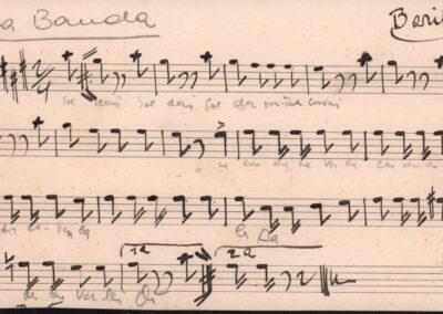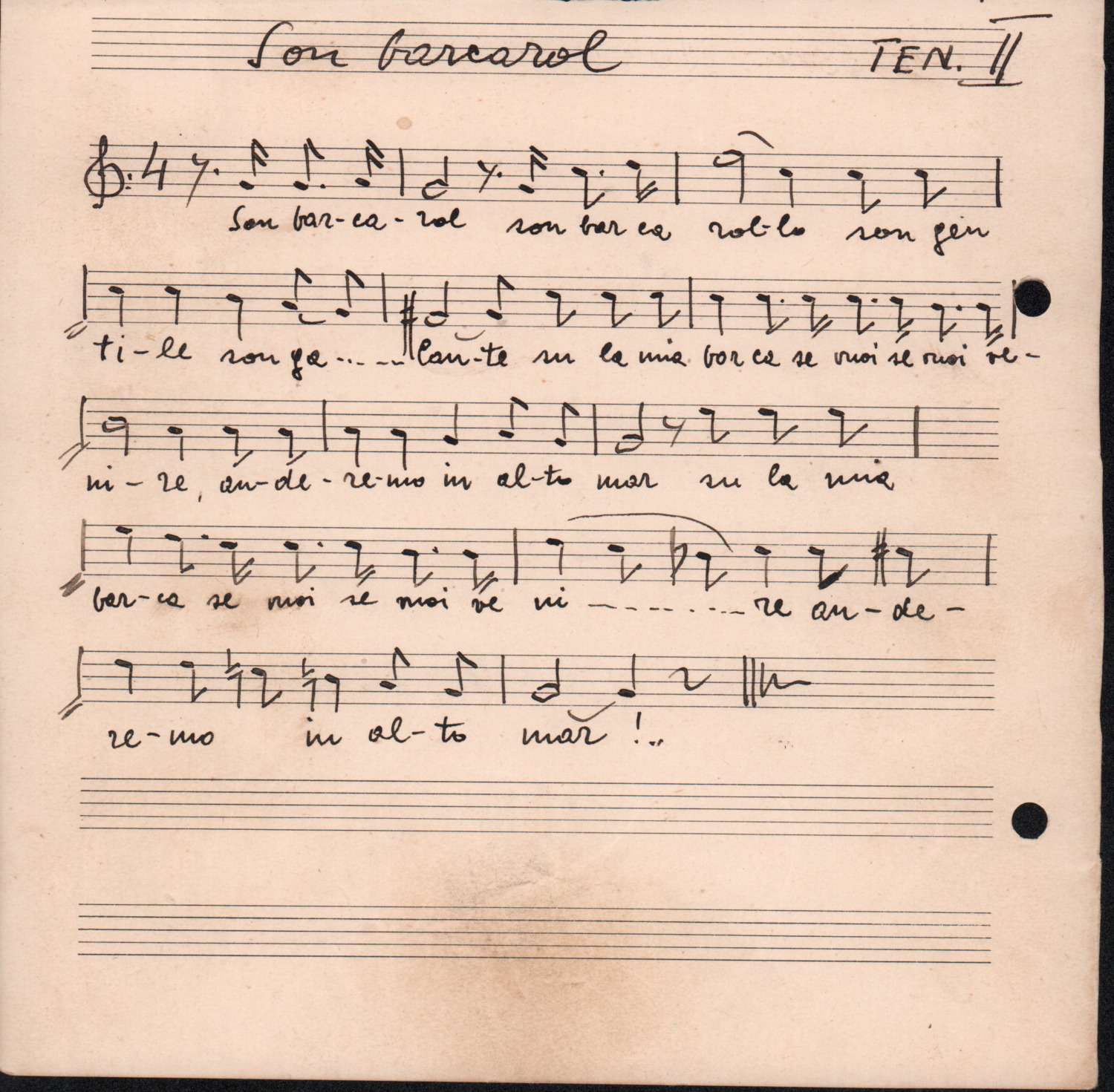 Canti armonizzati da Antonio Pedrotti. Documenti relativi all’armonizzazione di Antonio Pedrotti dei canti Il tuo fazzolettino, Son barcarol, La vien giù dalle montagne, Ta-Pum, Que fais-tu la bas (Belle rose du printemps), Di qua di là del Piave, Il tuo fazzolettino, La banda, Quattro cavai che trottano. 1946-1958. 1 fascicolo.