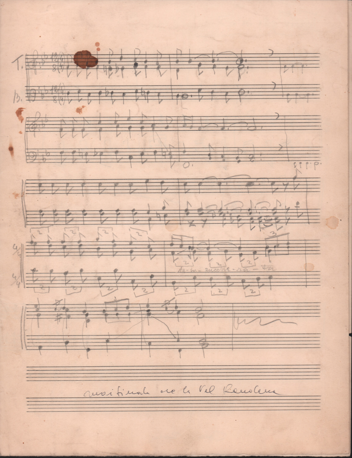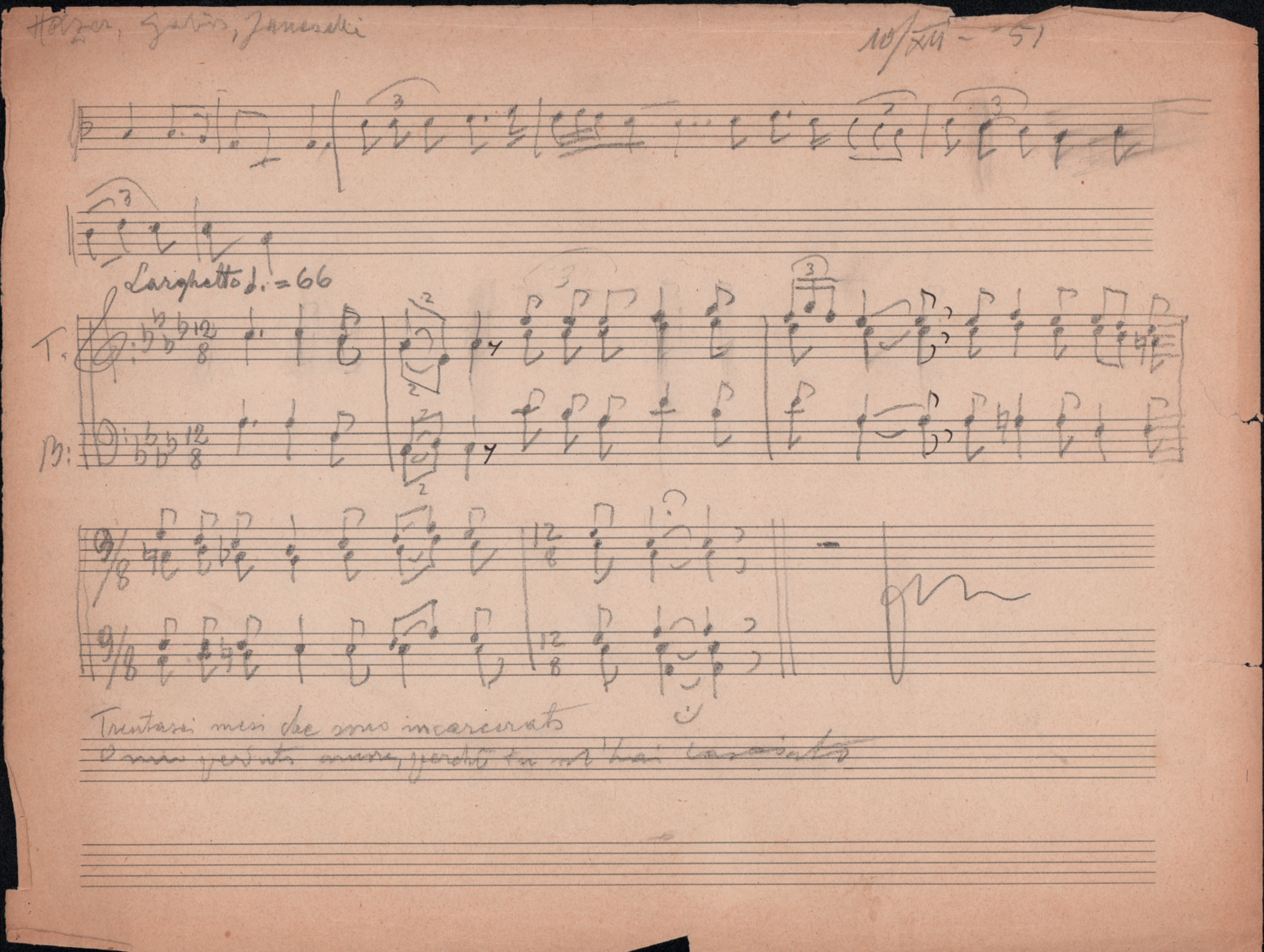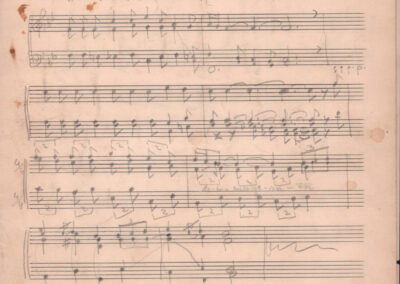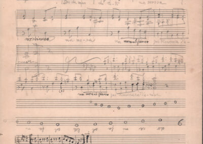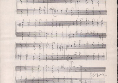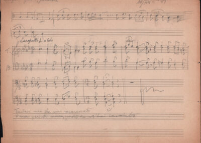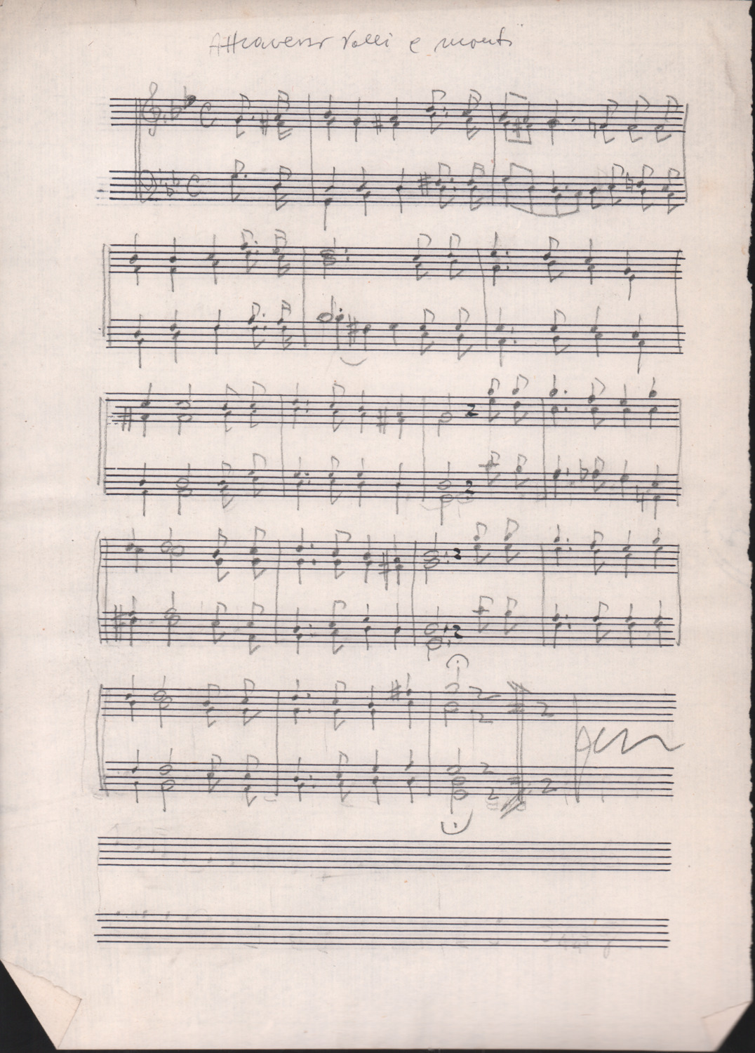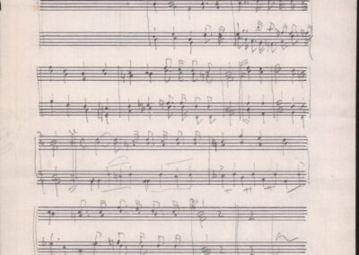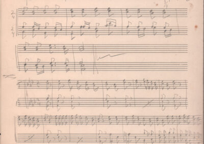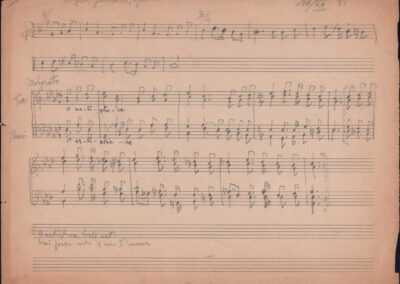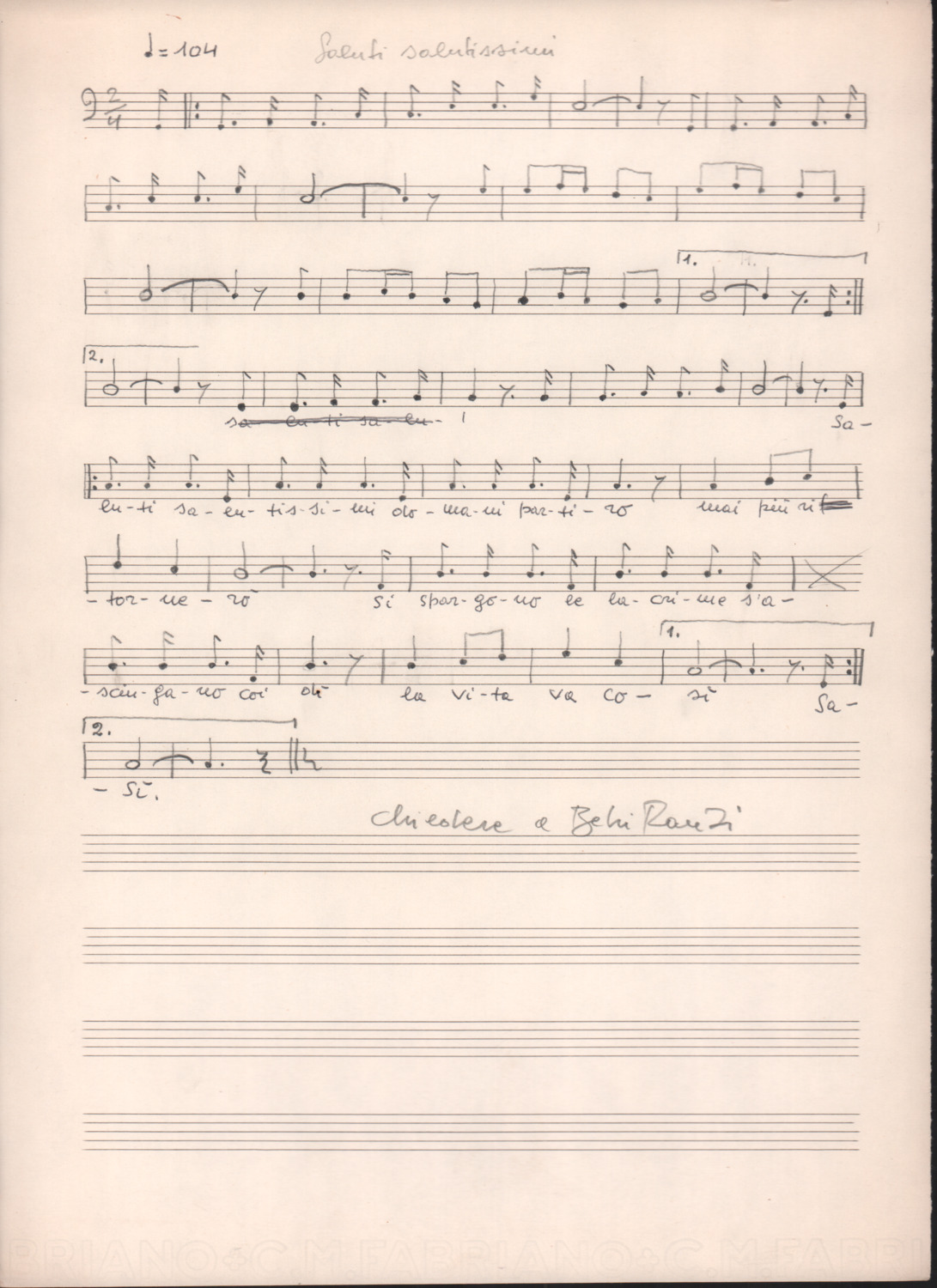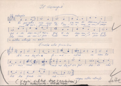 F.12.1.9 - Partitura del canto Saluti salutissimi, manoscritto di Silvio Pedrotti su foglio con pentagramma. 1 c.